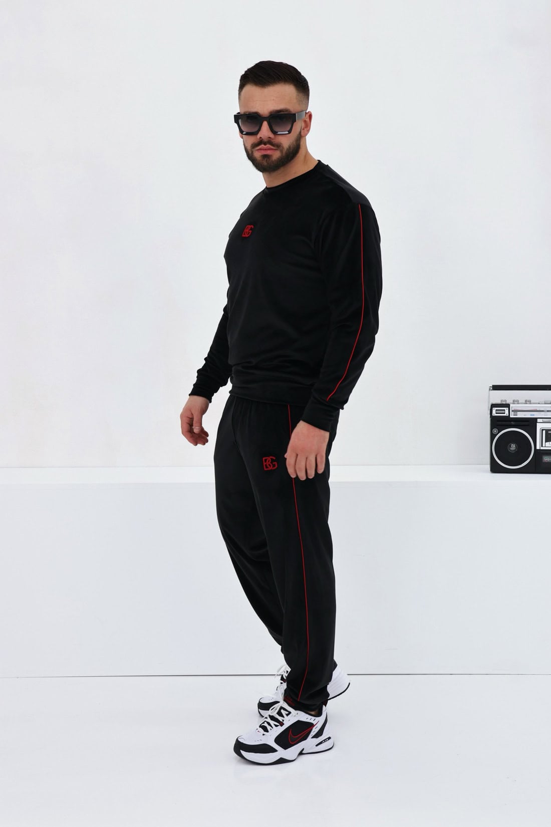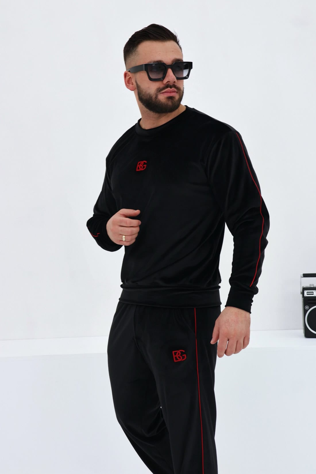 Opis produktu: Dres welurowy BG AERO. Bluza oraz spodnie zdobione haftowanym logo BG w kolorze czerwonym. Dodatkowo zewnętrzne szwy rękawów oraz nogawek spodni zdobione czerwoną wypustką. Spodnie posiadają gumkę w pasie oraz sznurek.
