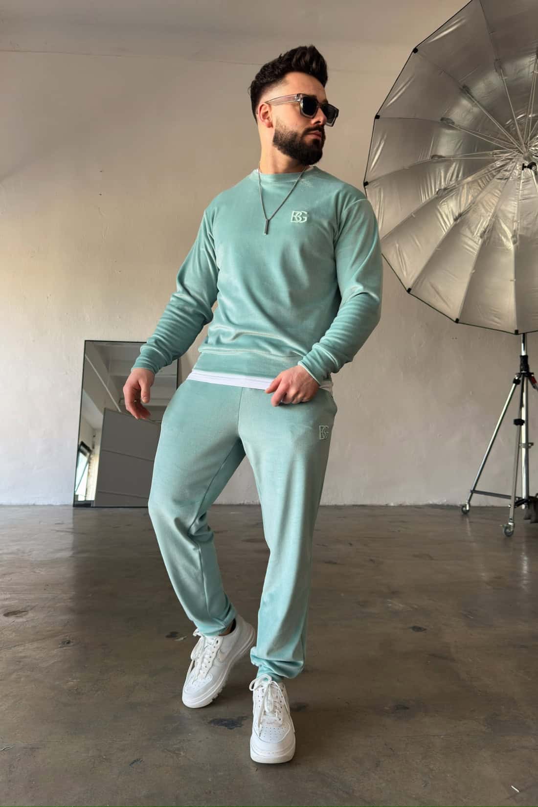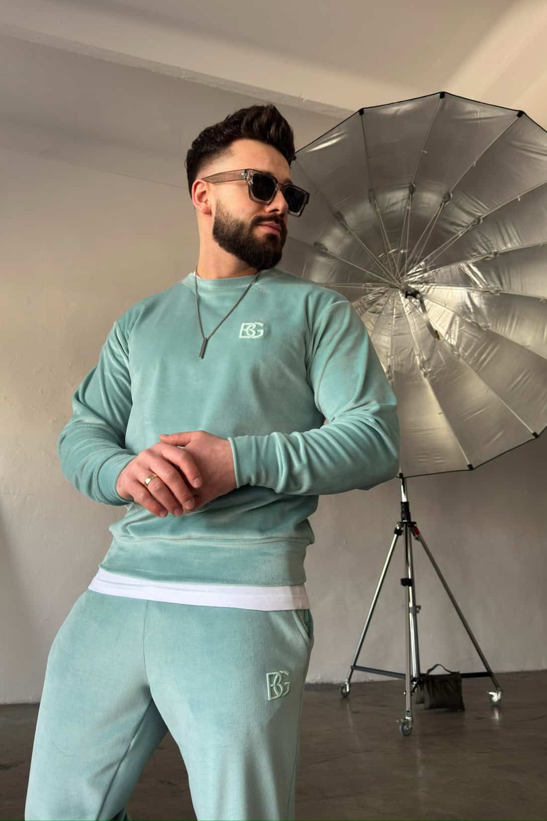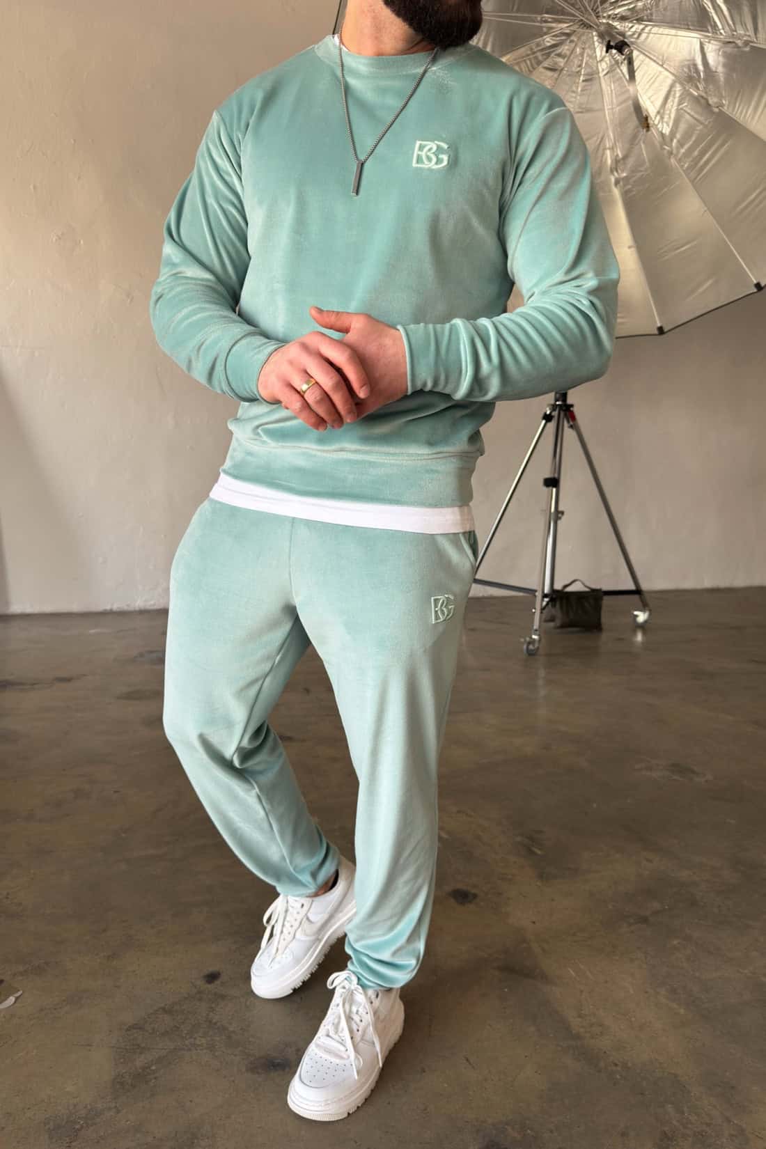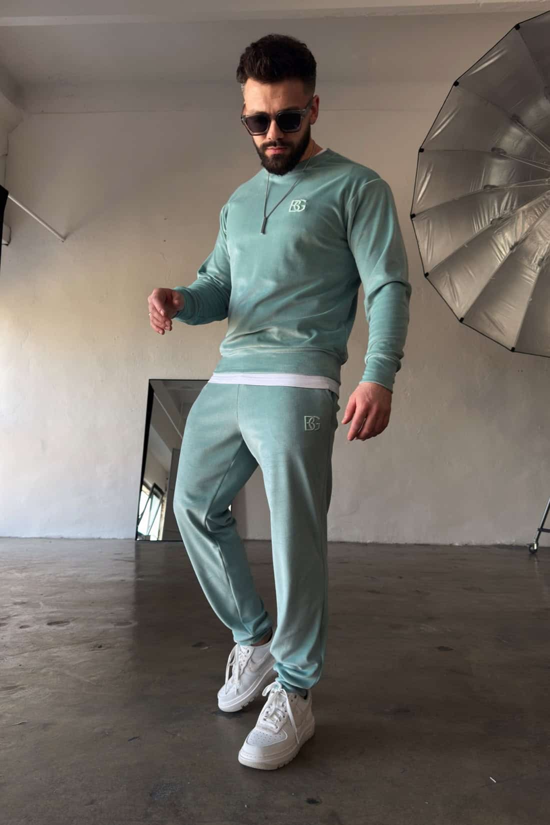 Opis produktu: Dres z weluru BG VANDAL. Bluza oraz spodnie zdobione haftowanym logo marki BG Brandenburg Couture w tonacji materiału. Bluza bez kaptura. Spodnie posiadają gumkę w pasie oraz sznurek.