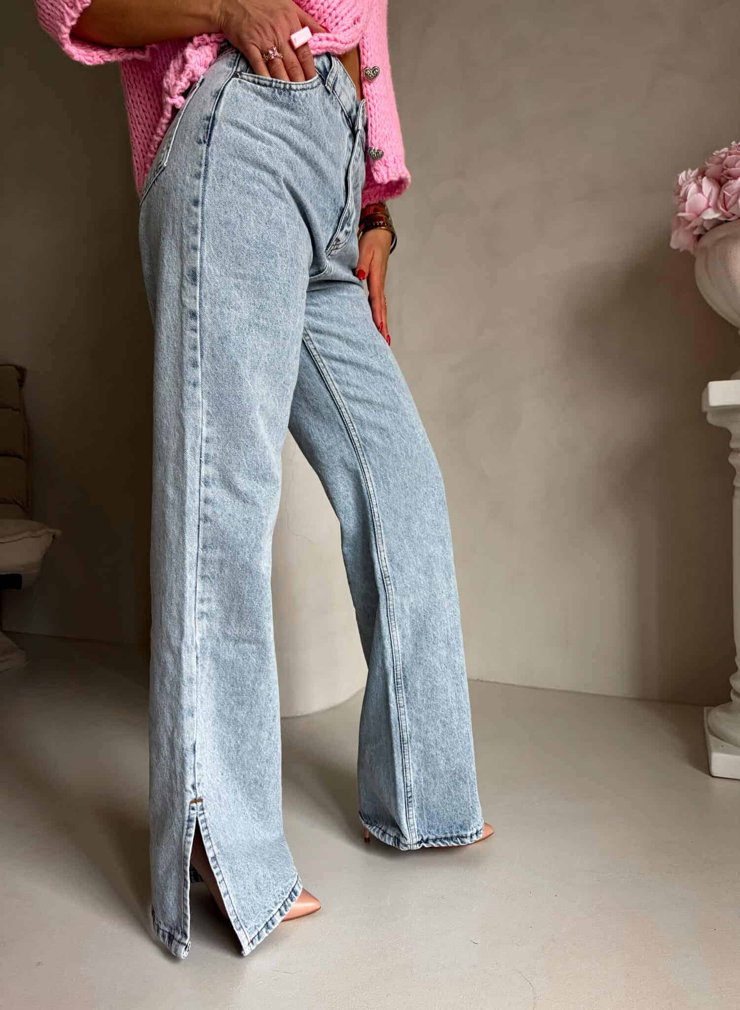 Jeansy Mom Fit sprawdzą się do wielu stylizacji. Zapinane na guzik, posiadają szlufki oraz kieszenie z przodu i z tyłu. Nogawki zakończone stylowym rozcięciem nadają im nowoczesnego charakteru i świetnie prezentują się zarówno z trampkami, jak i botkami.