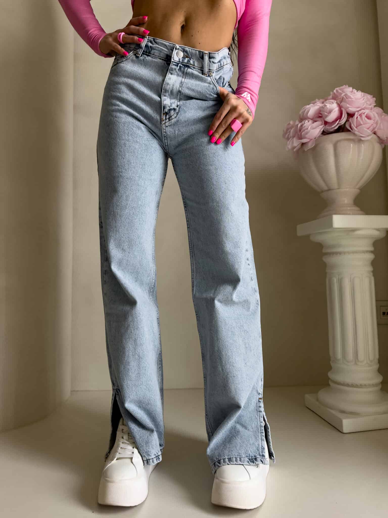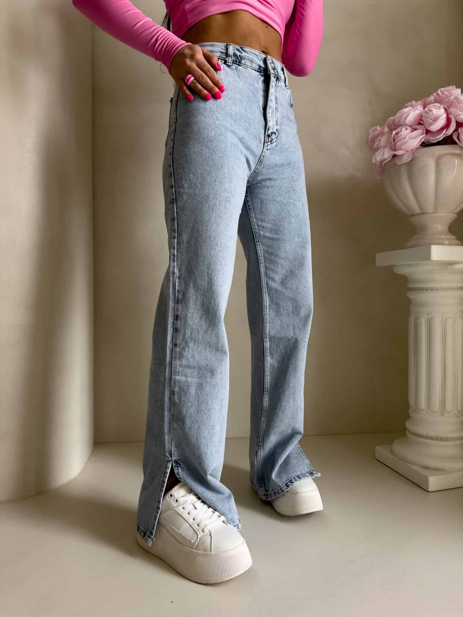 Jeansy Mom Fit sprawdzą się do wielu stylizacji. Zapinane na guzik, posiadają szlufki oraz kieszenie z przodu i z tyłu. Nogawki zakończone stylowym rozcięciem nadają im nowoczesnego charakteru i świetnie prezentują się zarówno z trampkami, jak i botkami.