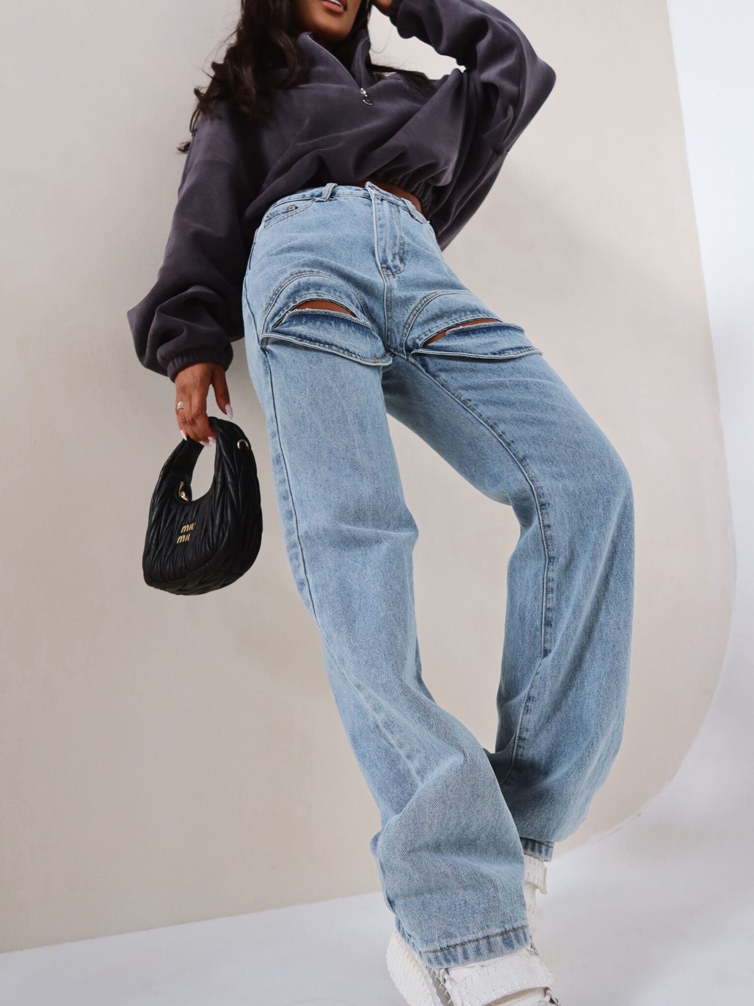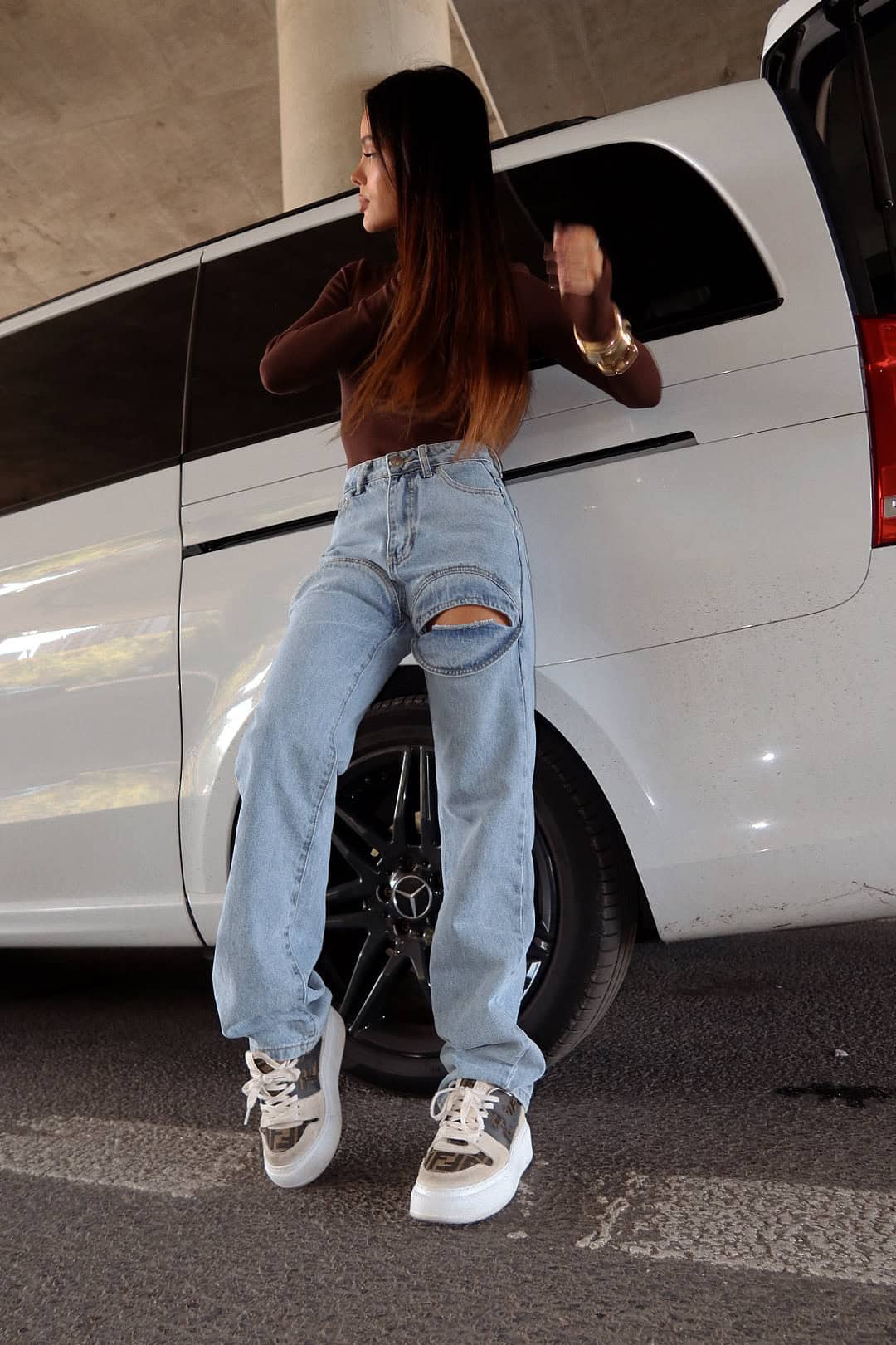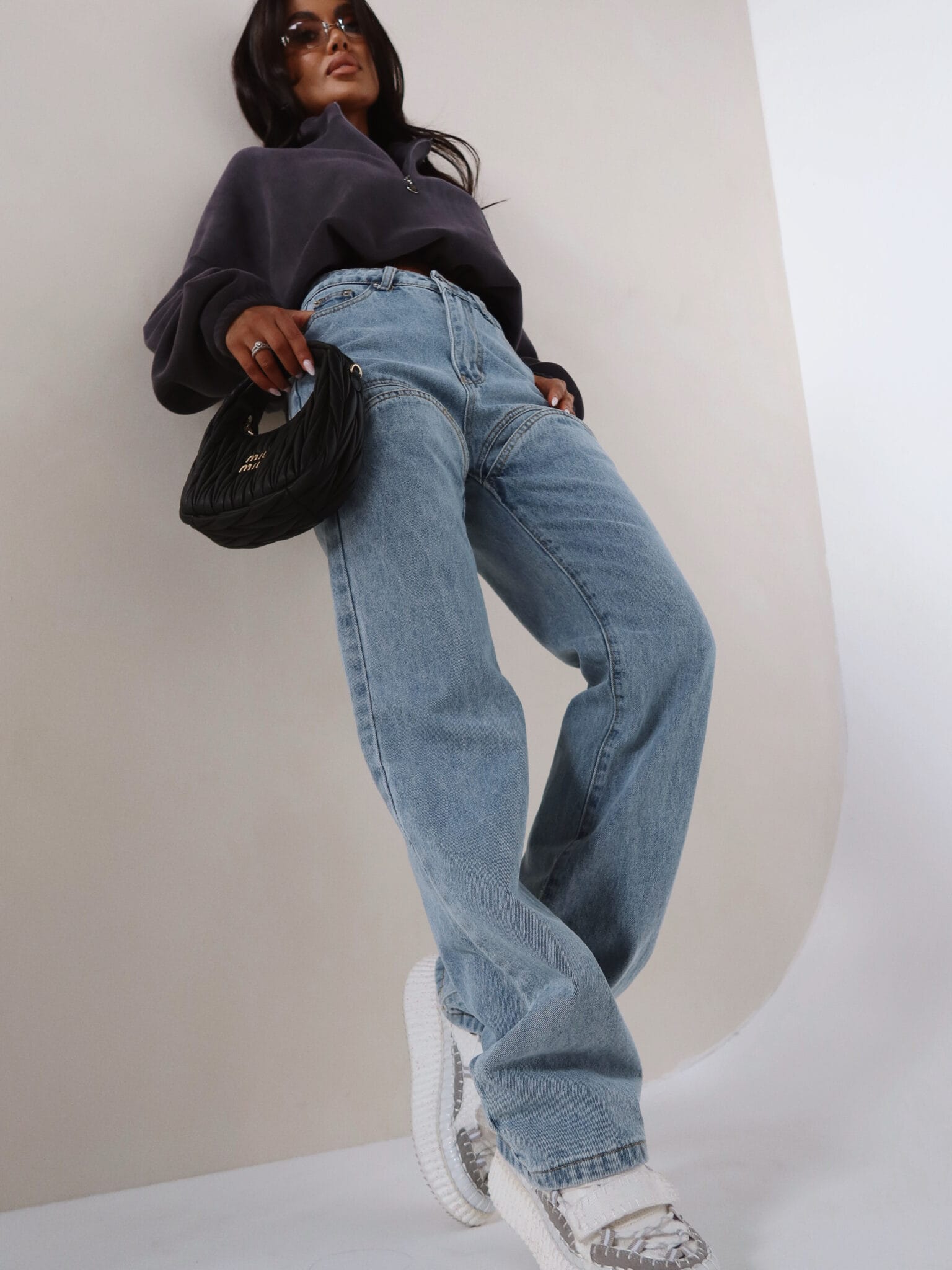 To nie są zwykłe jeansy — to manifest stylu. Klasyczny fason z wysokim stanem i luźną nogawką zyskał zupełnie nowy wymiar dzięki unikalnemu przeszyciu na udzie. To nie ozdoba, to funkcjonalny detal – wystarczy lekko odchylić materiał, a odsłania się zadziorne wycięcie. Niby klasyk, ale z ukrytą niespodzianką. Denim dla tych, którzy nie boją się mody z charakterem.Skład: 100% bawełna