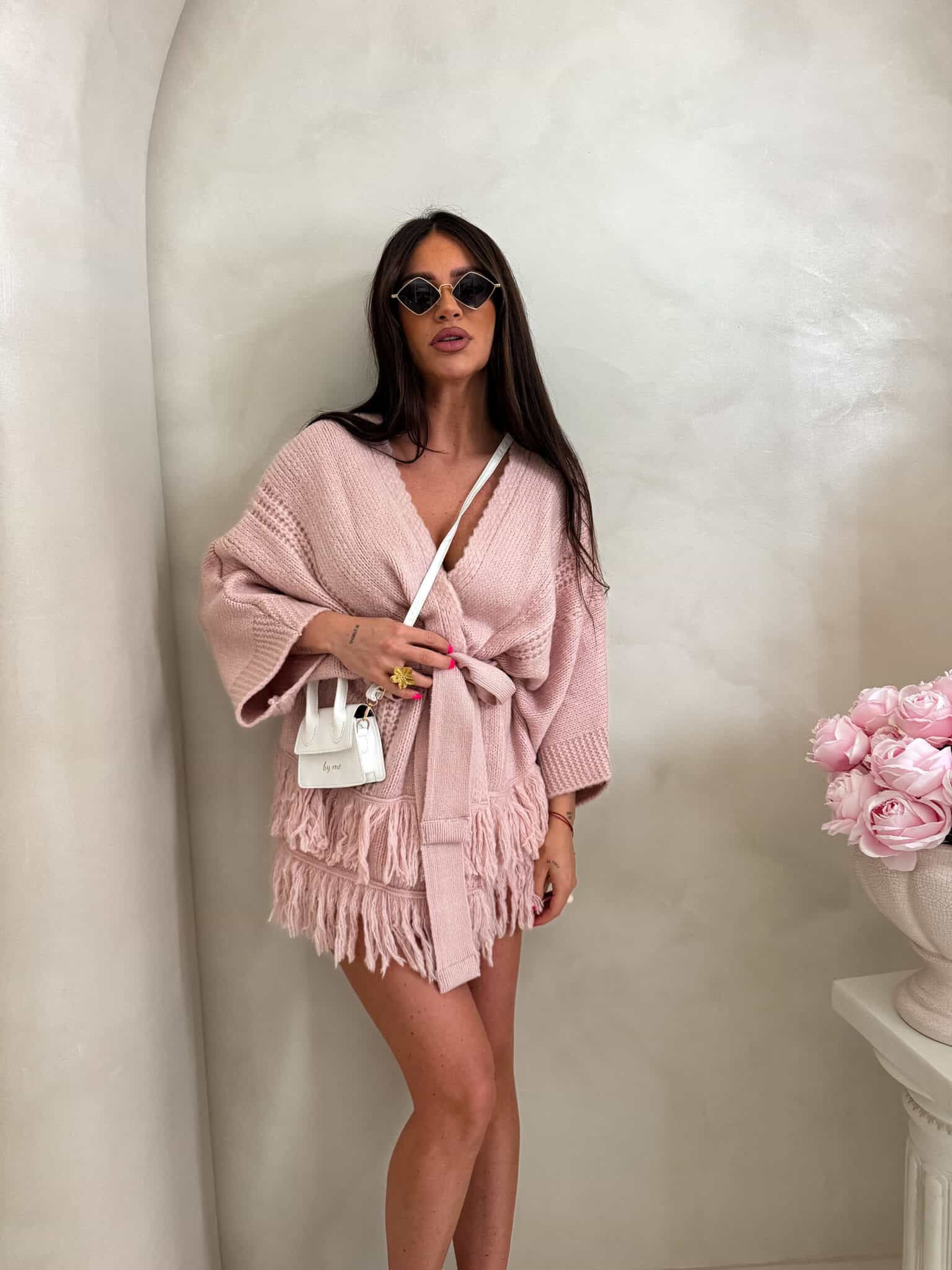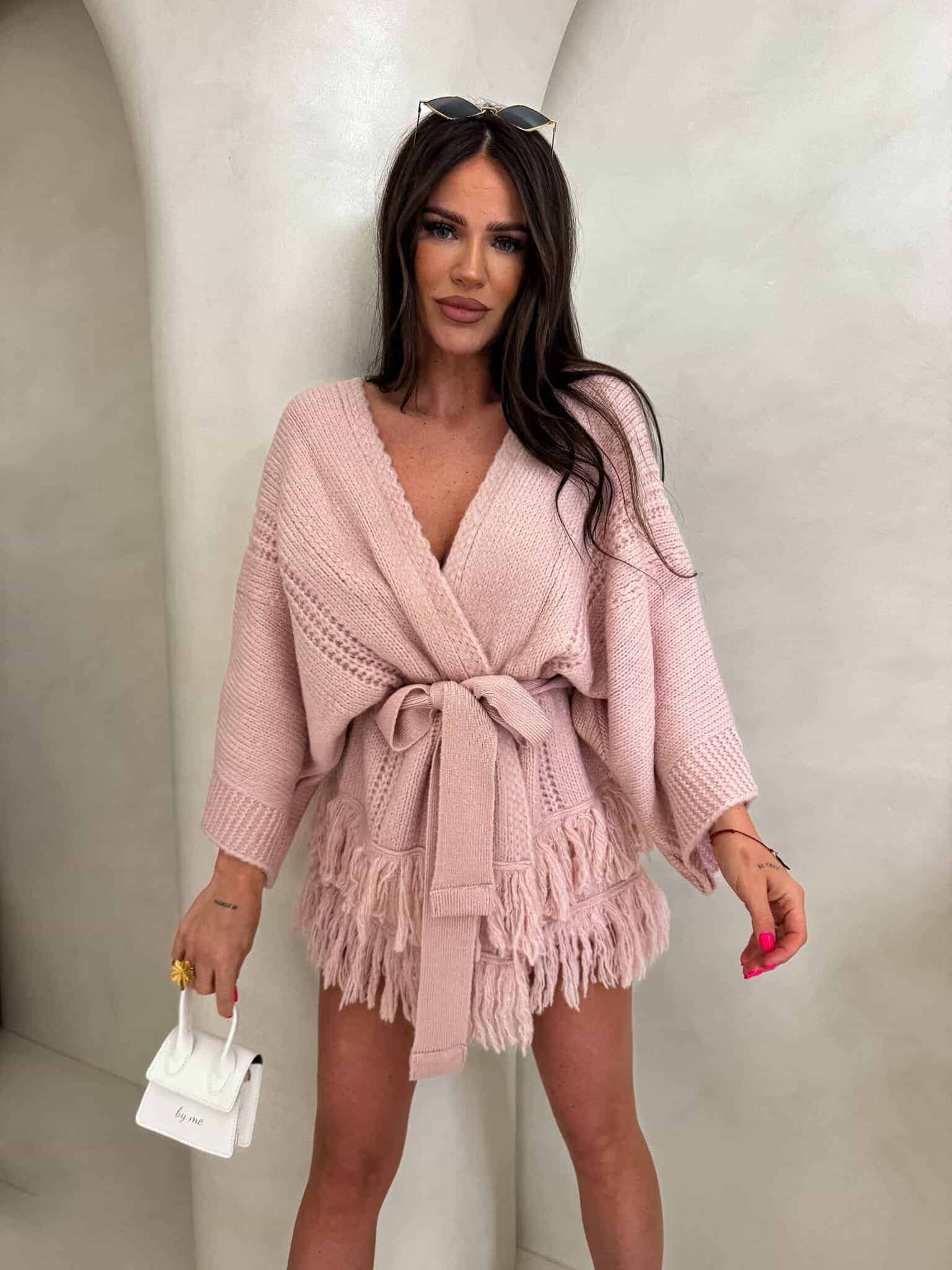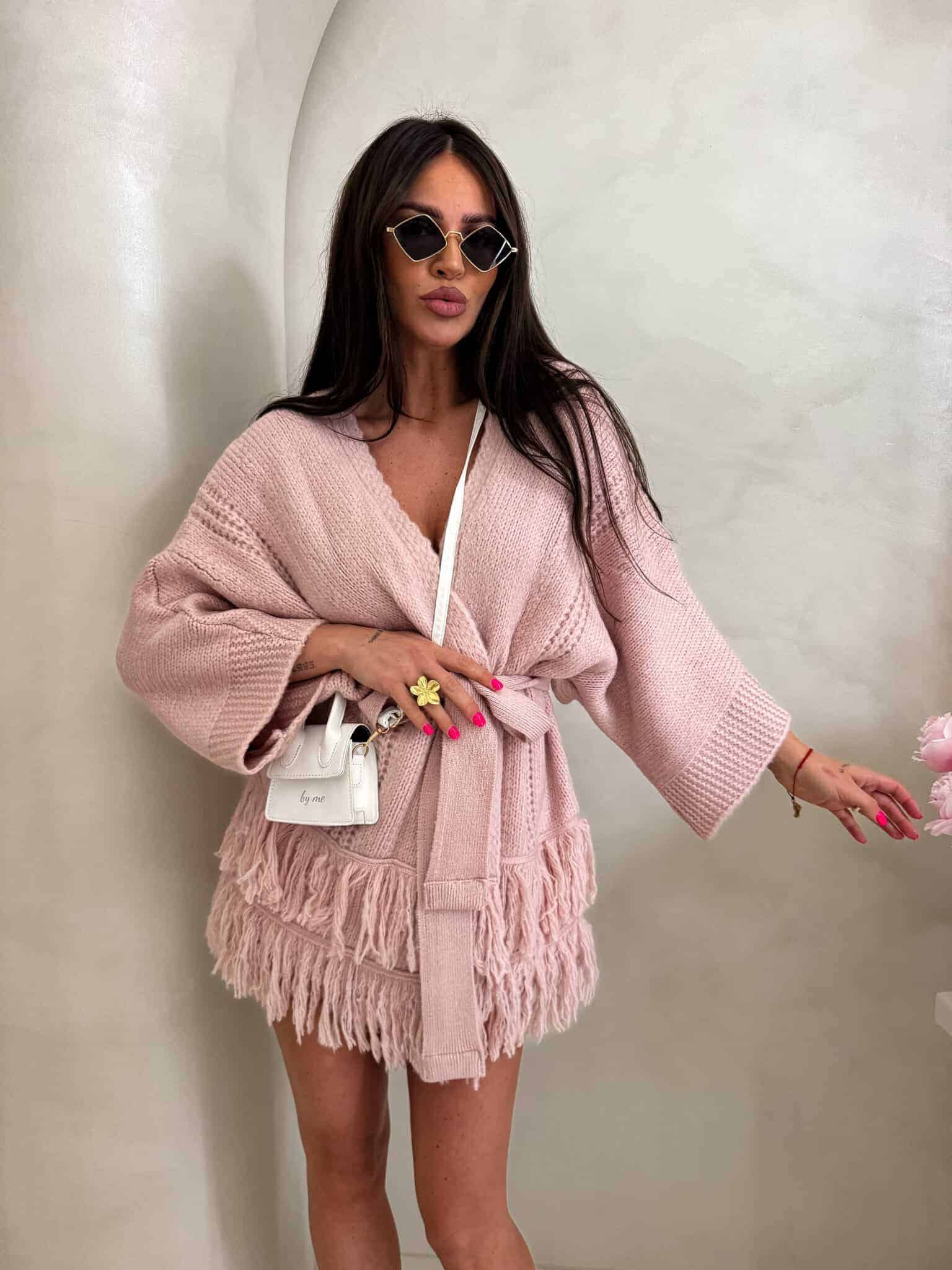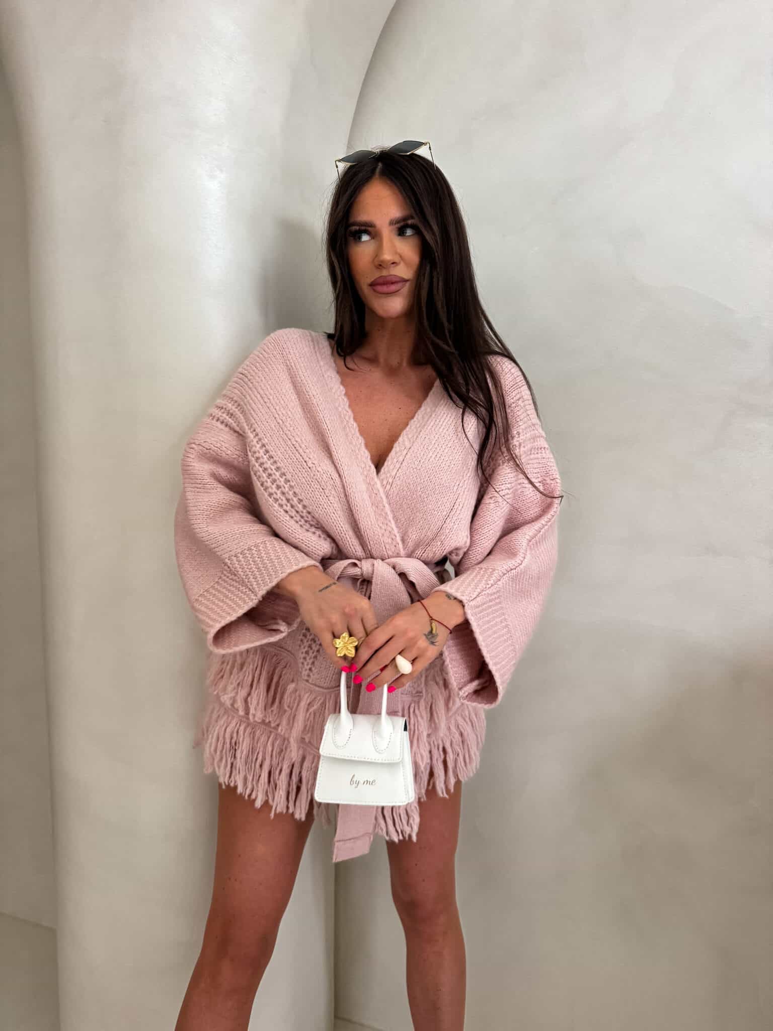 Podkreśl swój styl z kardiganem Oriana. Kardigan ma luźny, otwarty fason, a talię można podkreślić dołączonym paskiem, dzięki czemu sylwetka nabiera kobiecego kształtu. Dół kardiganu ozdobiony frędzlami, które nadają mu lekkości i boho charakteru.