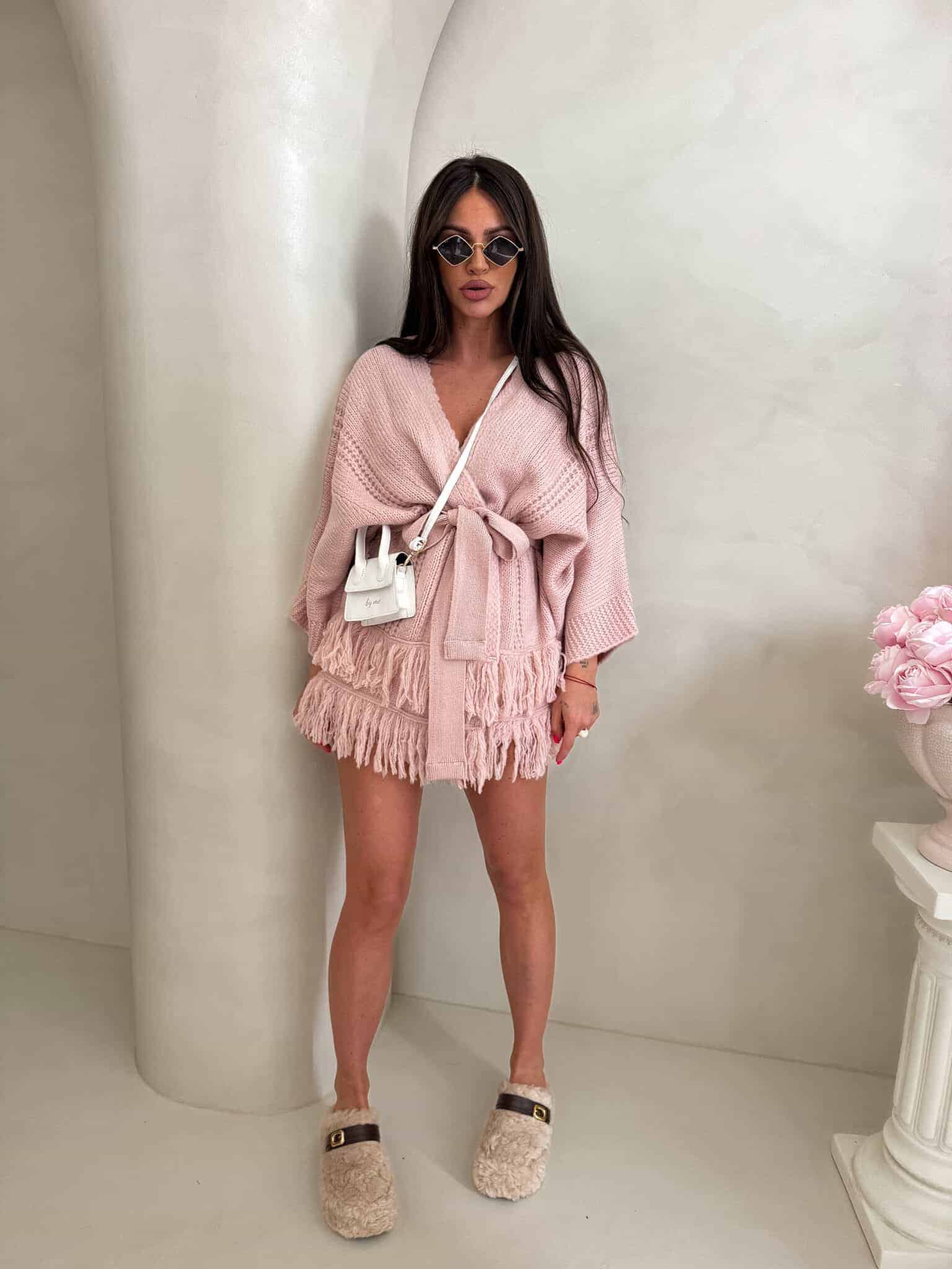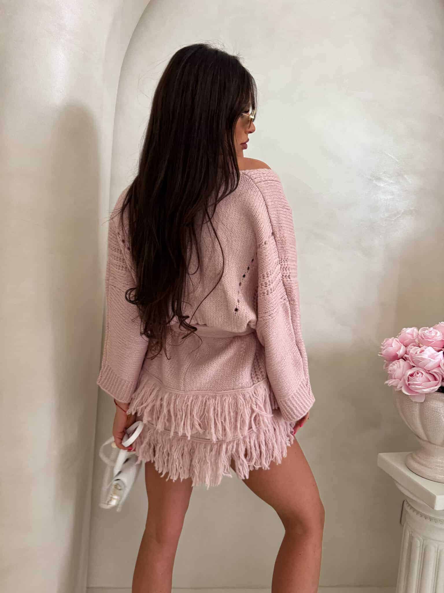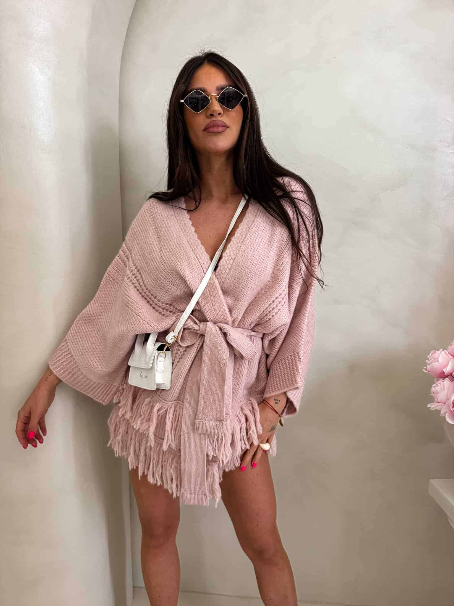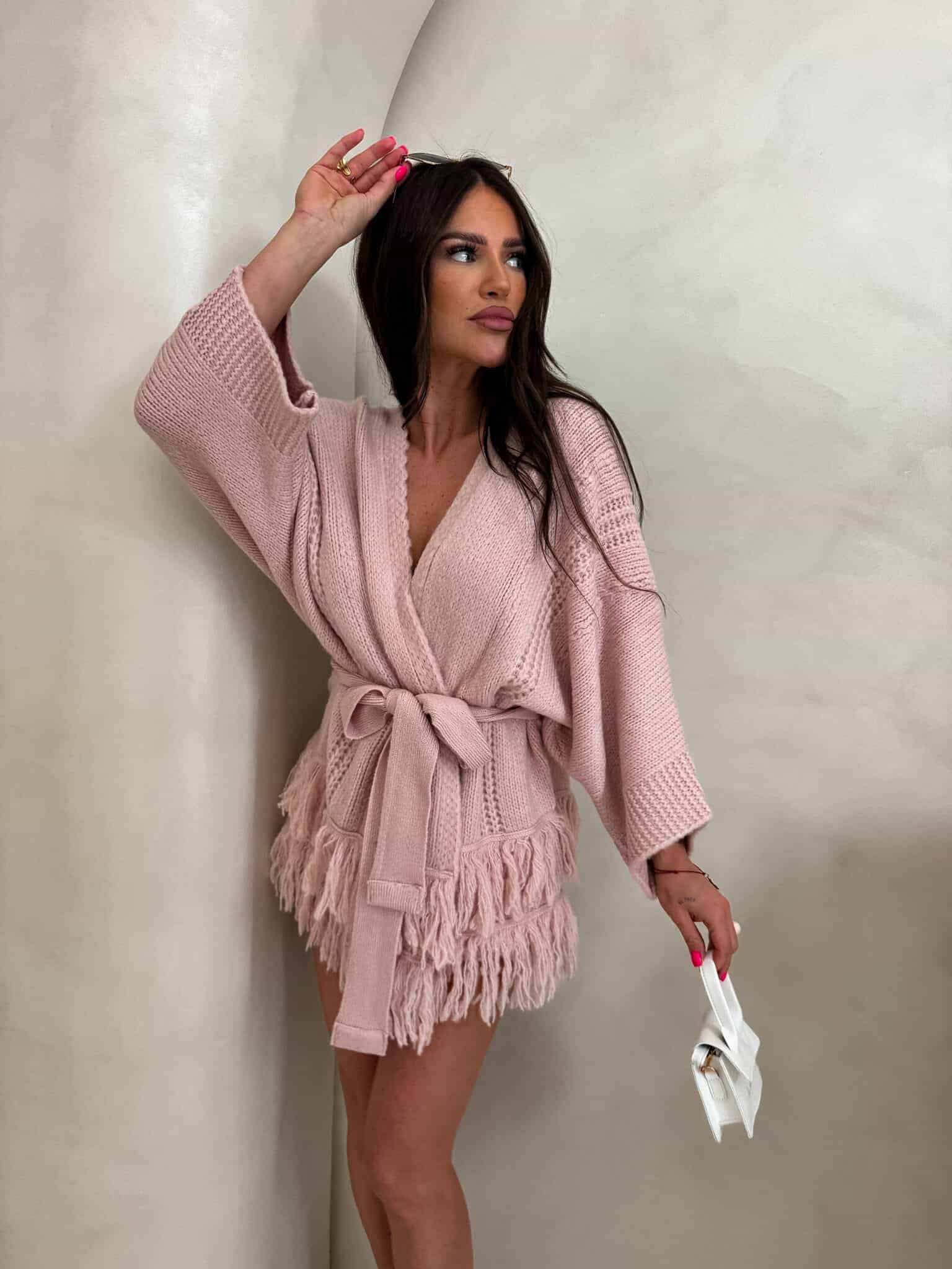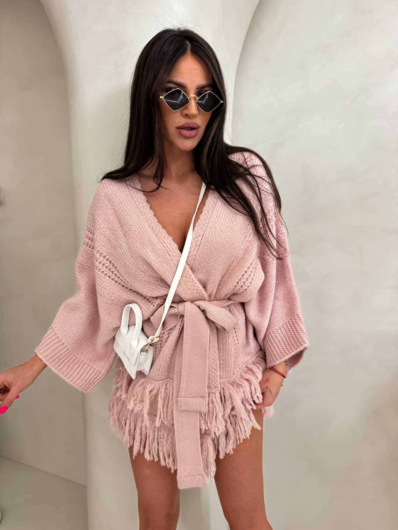 Podkreśl swój styl z kardiganem Oriana. Kardigan ma luźny, otwarty fason, a talię można podkreślić dołączonym paskiem, dzięki czemu sylwetka nabiera kobiecego kształtu. Dół kardiganu ozdobiony frędzlami, które nadają mu lekkości i boho charakteru.