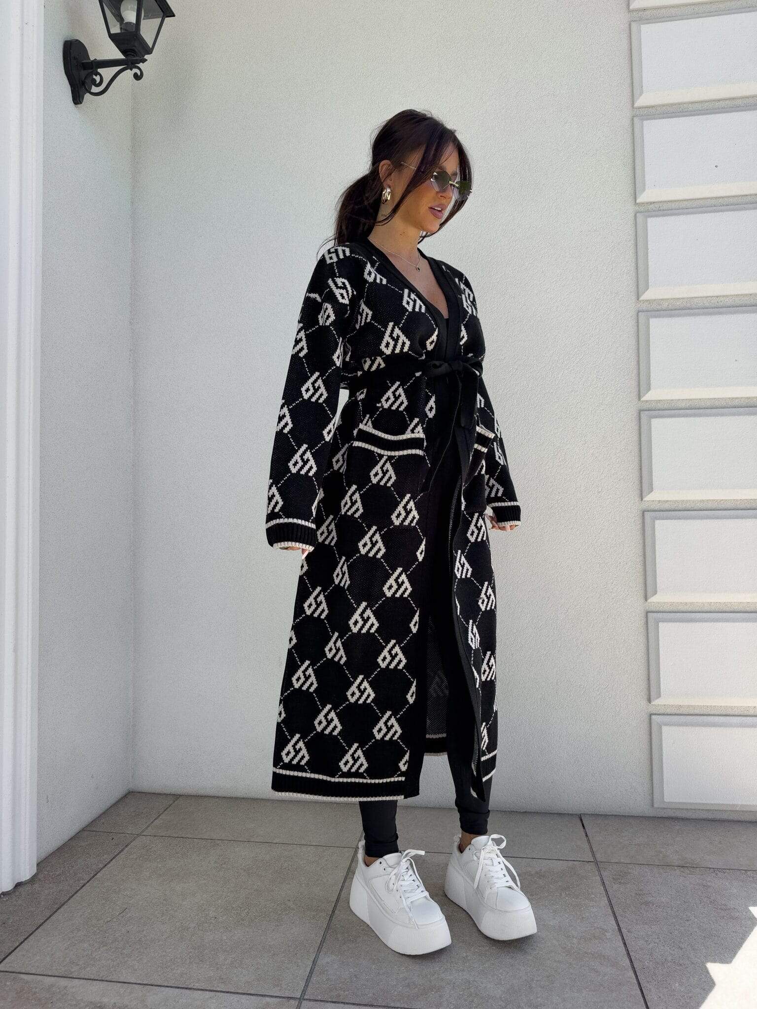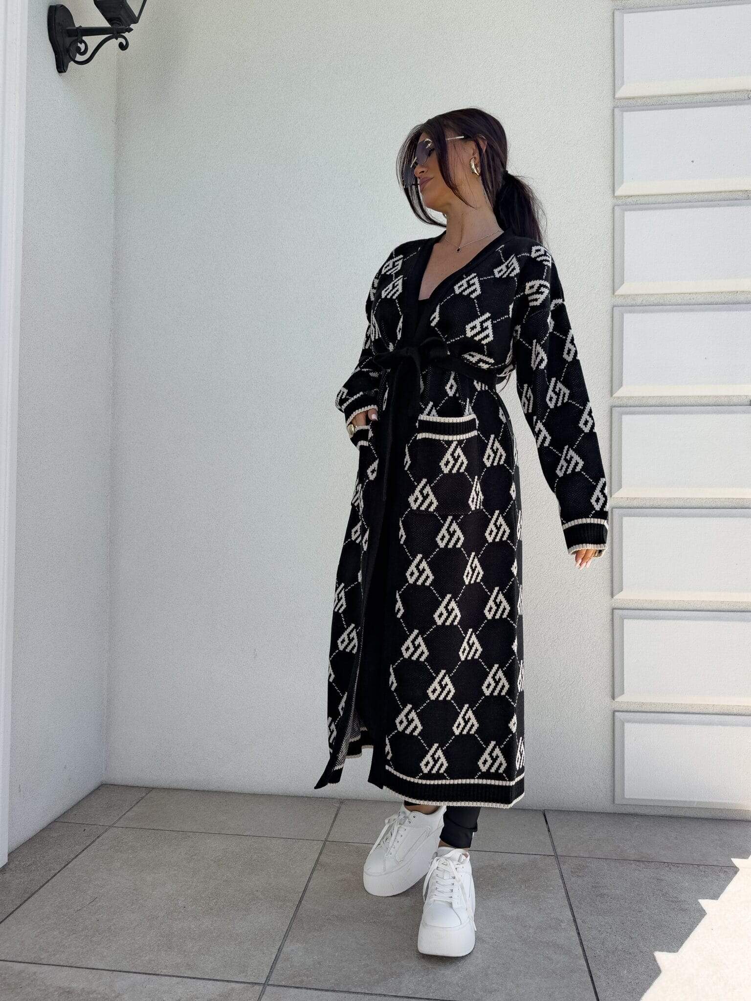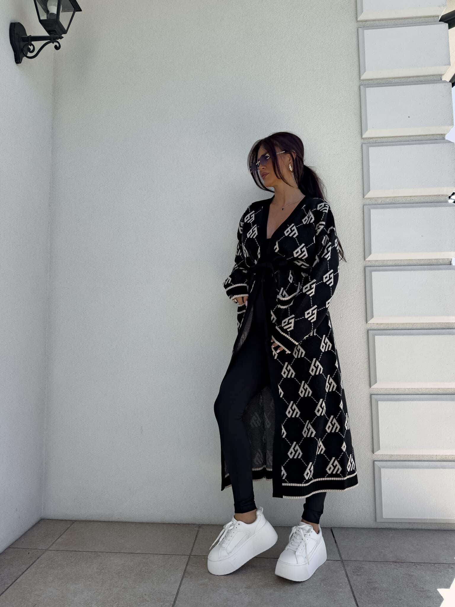 Stylowy, długi kardigan-płaszcz sięgający niemal do kostek, idealny na chłodniejsze dni. Klasyczny, lekko luźny krój zapewnia wygodę, a przewiązywany w talii pasek pięknie podkreśla sylwetkę. Długie rękawy dodają elegancji i funkcjonalności. Całość zdobi regularnie rozmieszczone logowanie na całej powierzchni materiału.