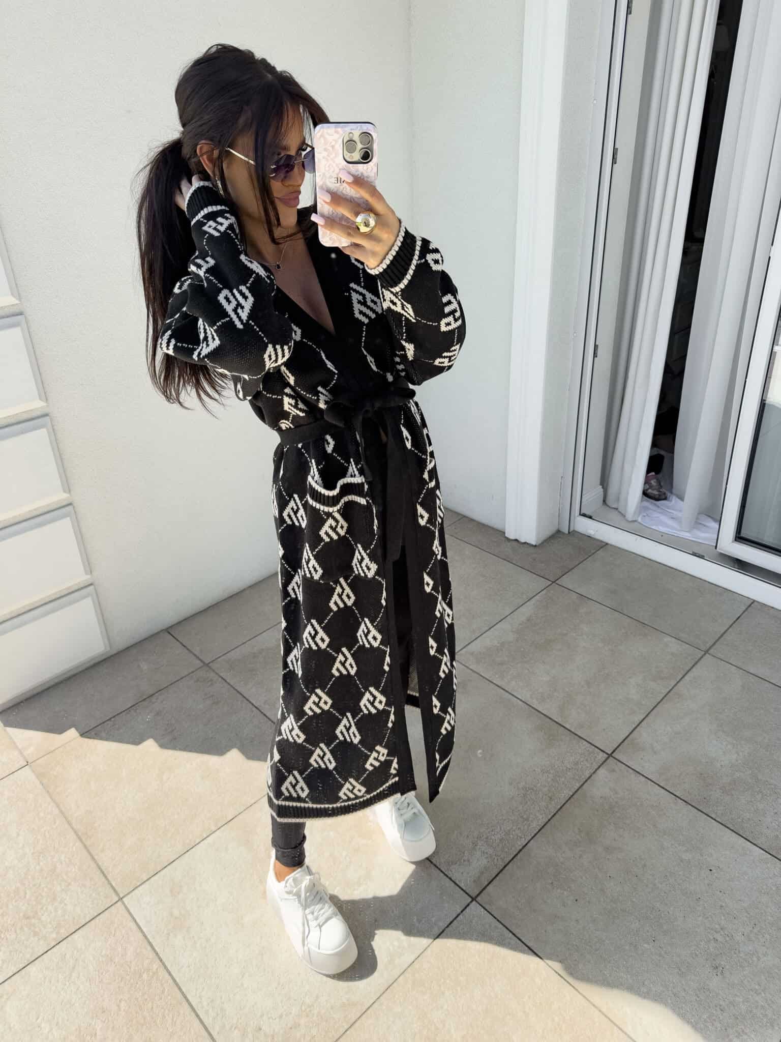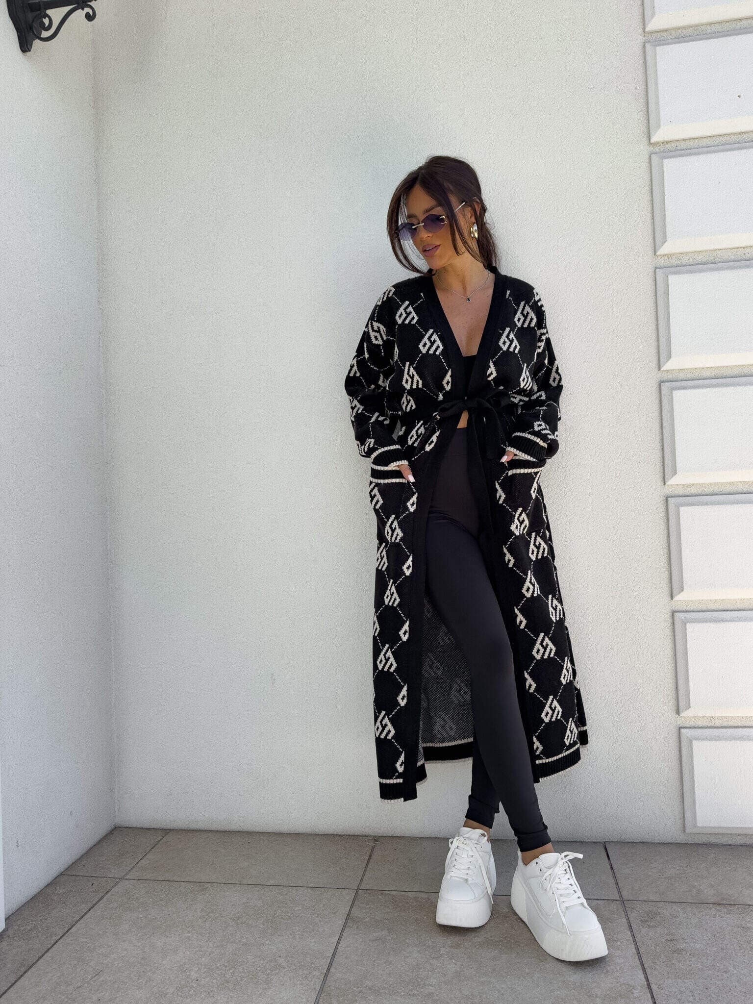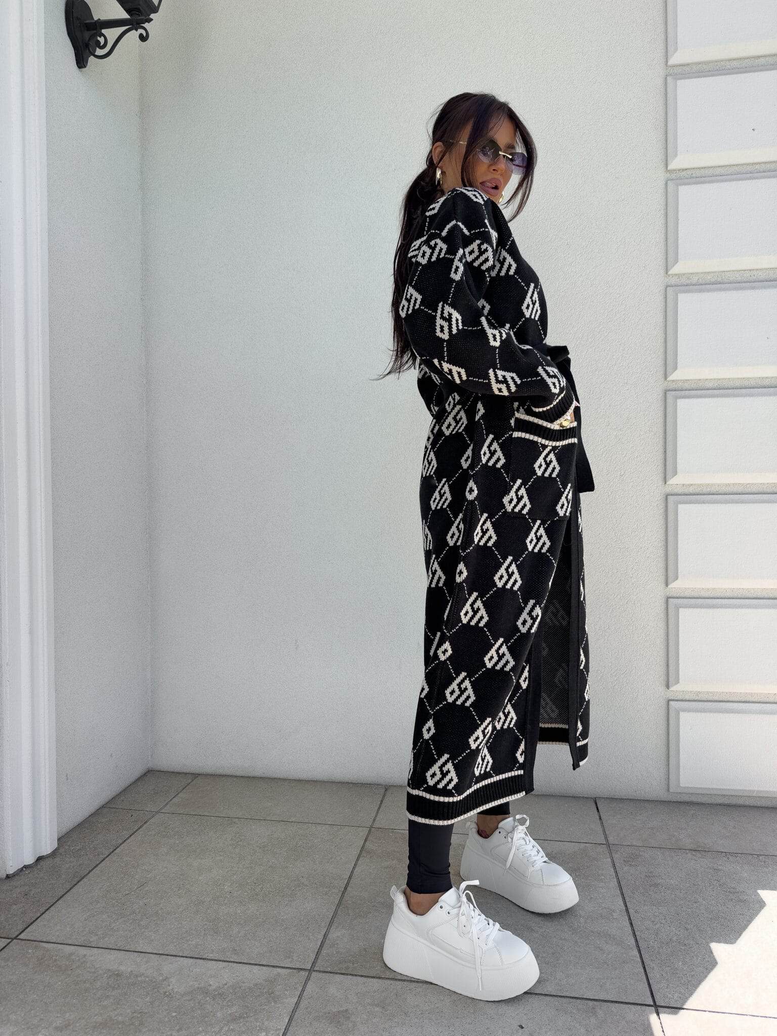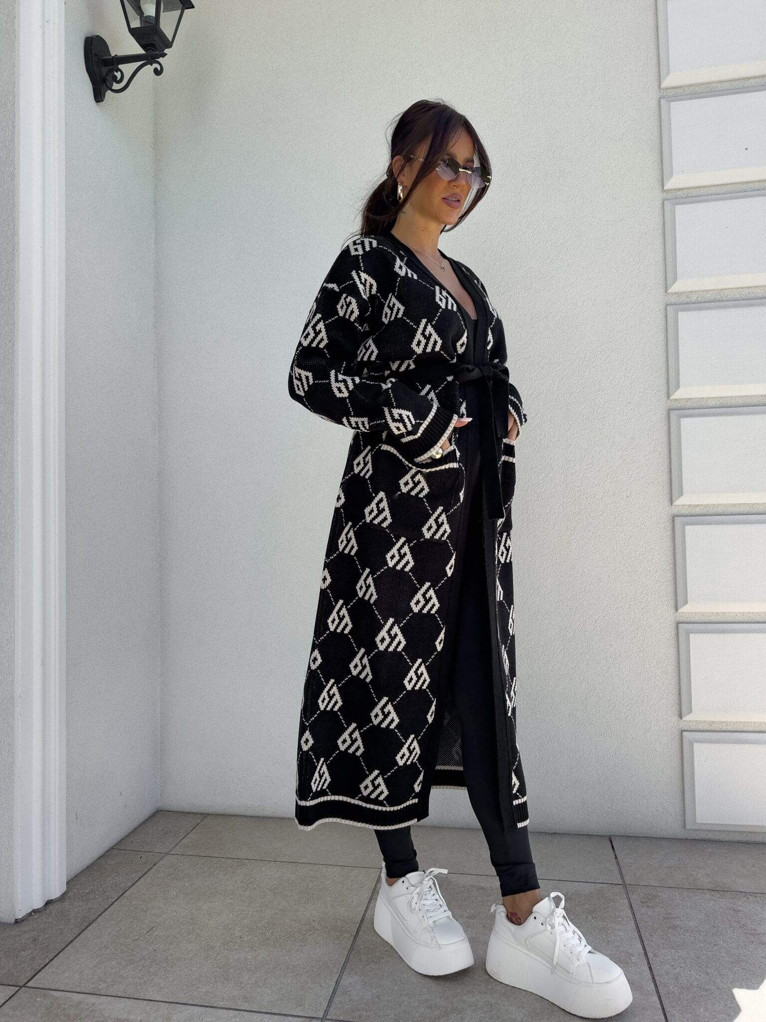 Stylowy, długi kardigan-płaszcz sięgający niemal do kostek, idealny na chłodniejsze dni. Klasyczny, lekko luźny krój zapewnia wygodę, a przewiązywany w talii pasek pięknie podkreśla sylwetkę. Długie rękawy dodają elegancji i funkcjonalności. Całość zdobi regularnie rozmieszczone logowanie na całej powierzchni materiału.