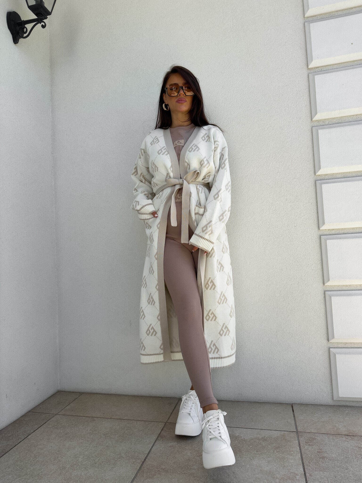 Stylowy, długi kardigan-płaszcz sięgający niemal do kostek, idealny na chłodniejsze dni. Klasyczny, lekko luźny krój zapewnia wygodę, a przewiązywany w talii pasek pięknie podkreśla sylwetkę. Długie rękawy dodają elegancji i funkcjonalności. Całość zdobi regularnie rozmieszczone logowanie na całej powierzchni materiału.