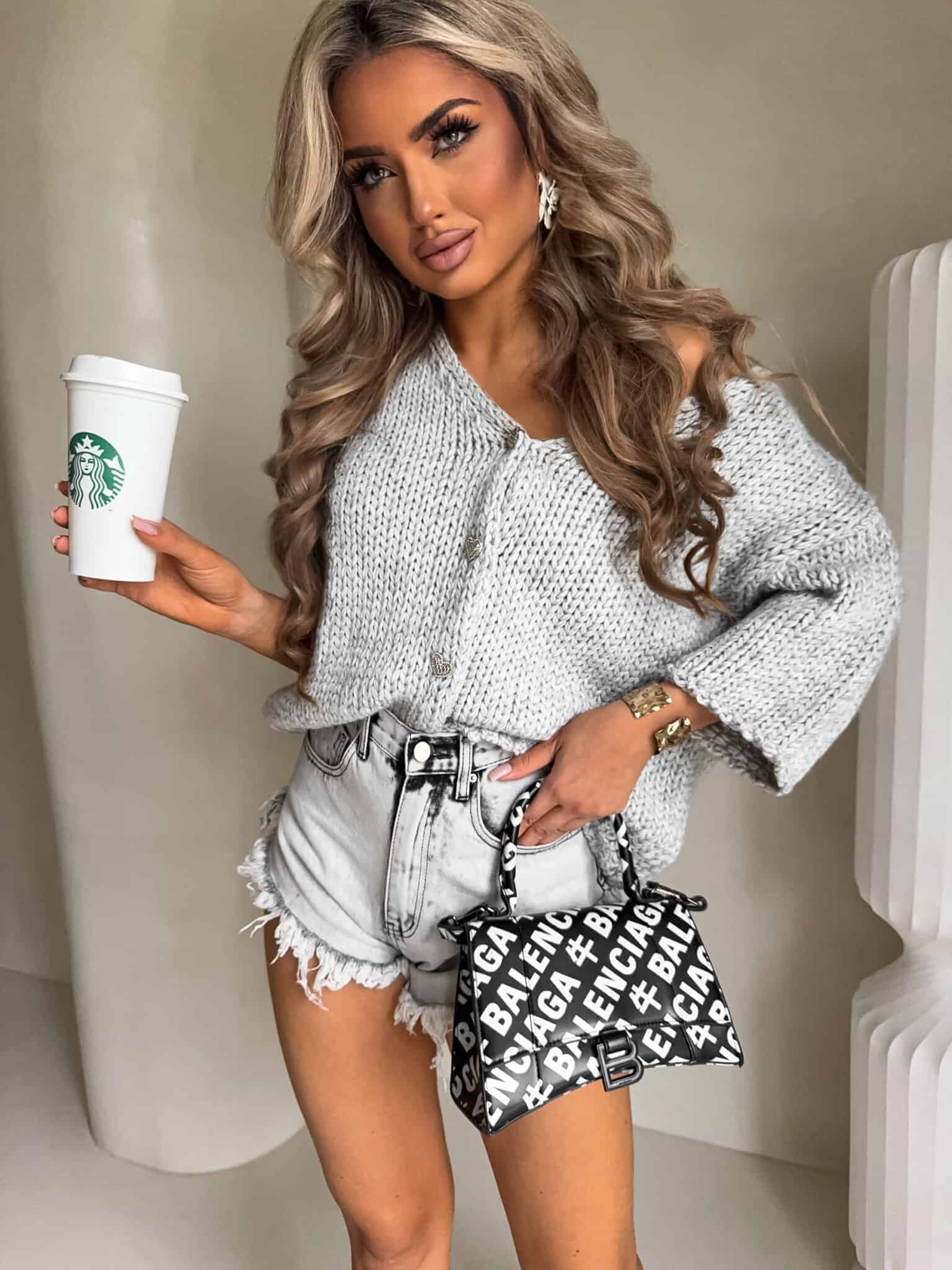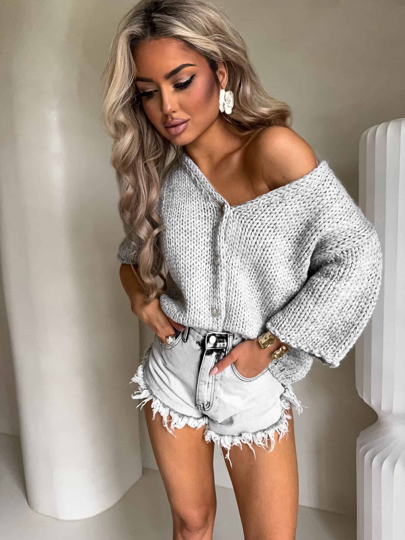 Luźny kardigan o oversizowym kroju, wykonany z miękkiej, przyjemnej w dotyku dzianiny. Model z krótkim rękawem oraz dekoltem w kształcie litery V, który subtelnie podkreśla sylwetkę. Zapinany na ozdobne guziki, stanowiące stylowy akcent całości.