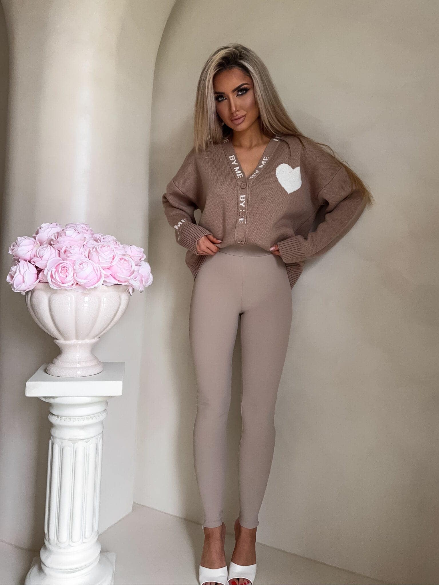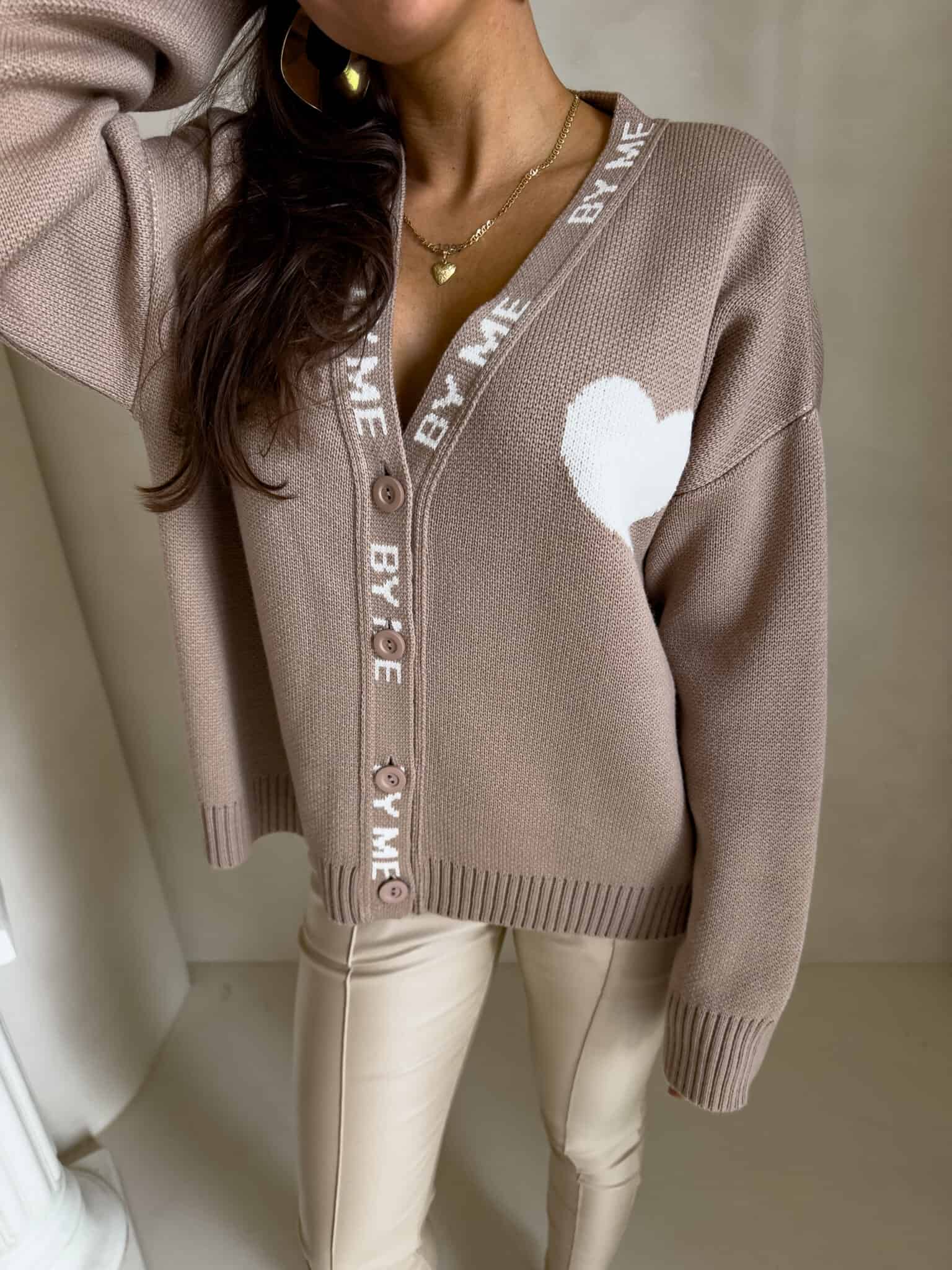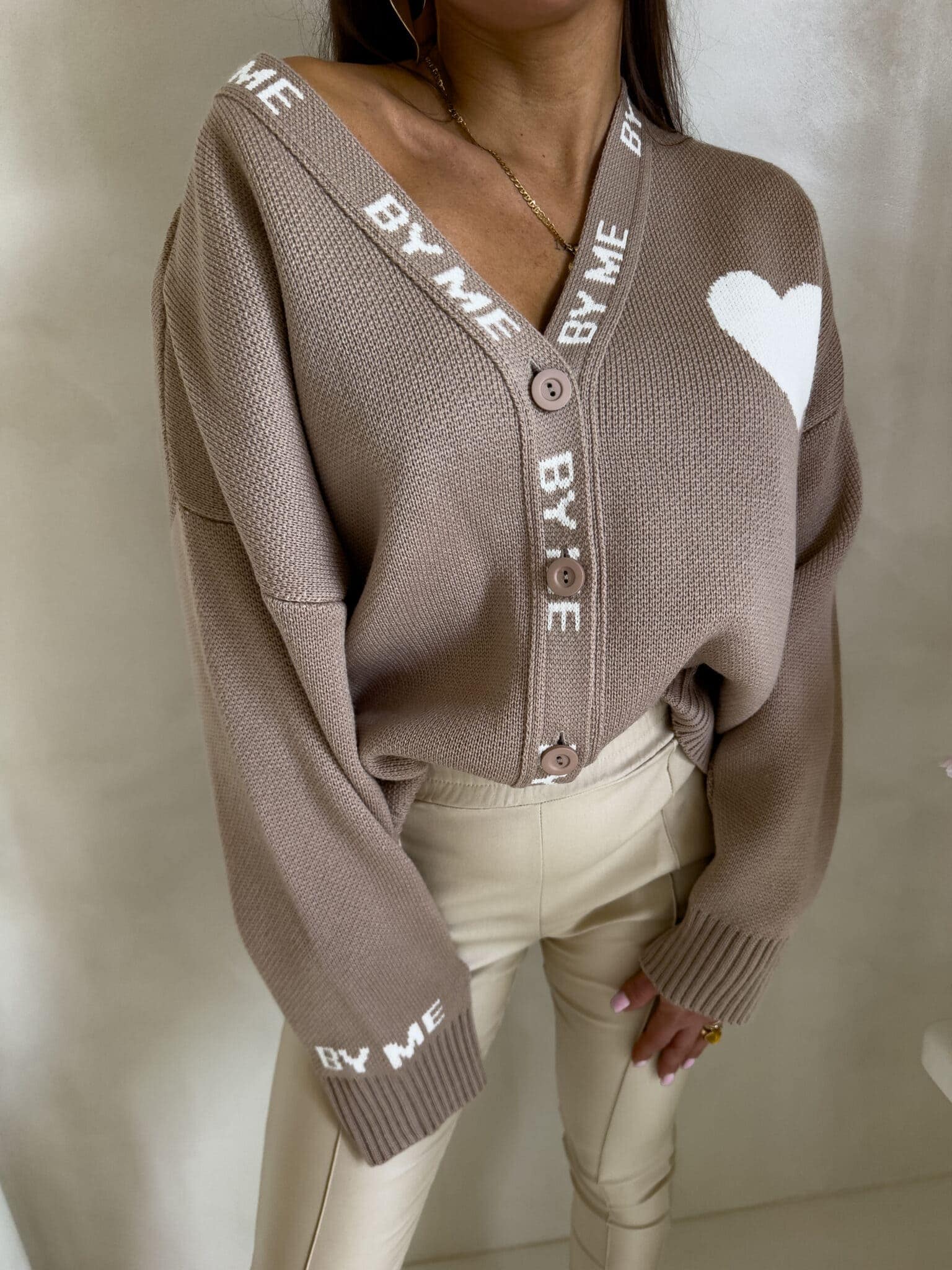 Luźny sweter o oversize’owym kroju, zapinany na guziki. Model posiada dekolt w kształcie litery V oraz długie rękawy zakończone ściągaczami – podobnie jak dół swetra – co zapewnia dobre dopasowanie i komfort noszenia. Wyrazistym akcentem są dekoracyjne napisy biegnące wzdłuż listwy z guzikami oraz na rękawach. Całość uzupełnia urocza naszywka w kształcie serca umieszczona na ramieniu