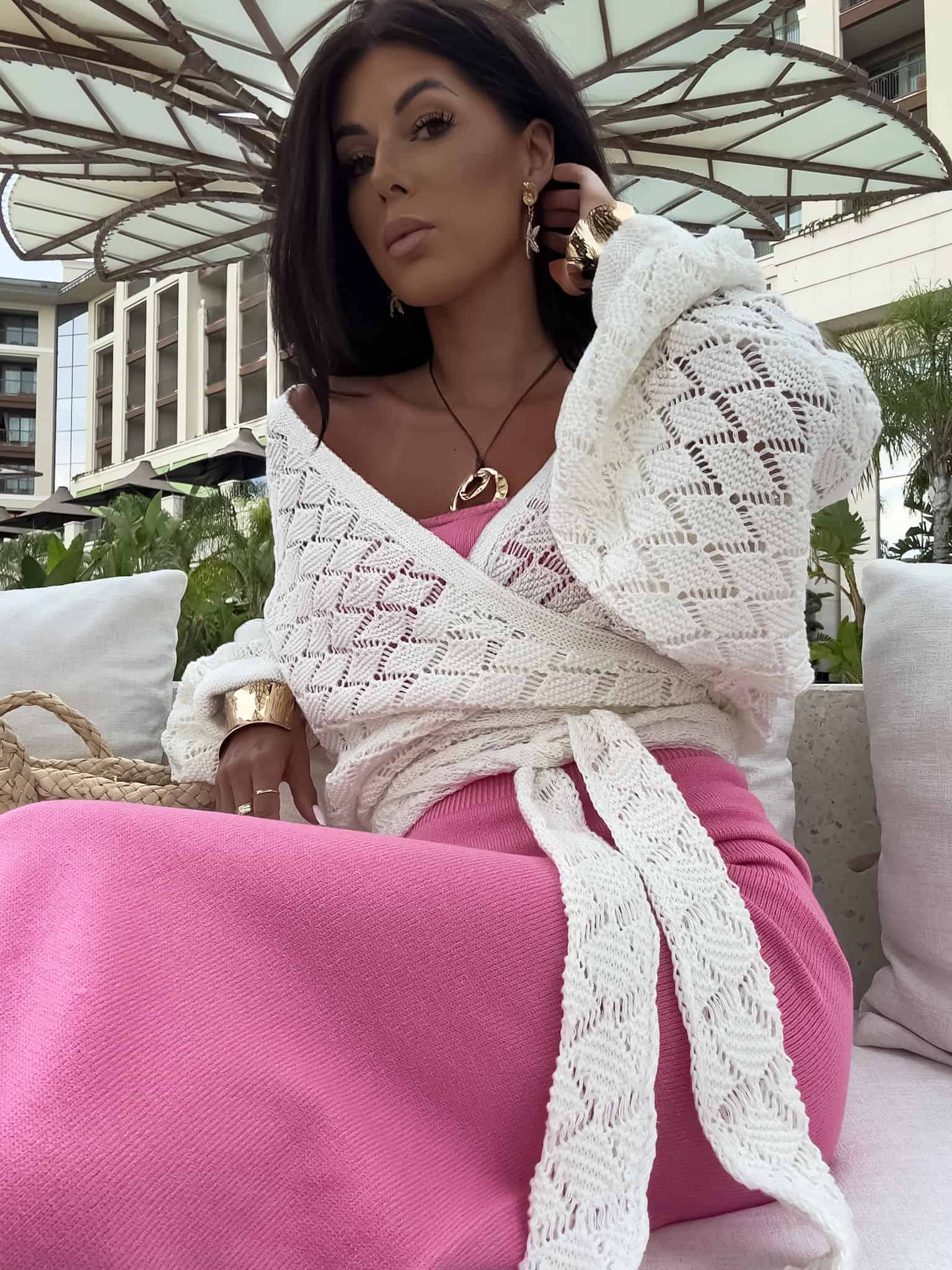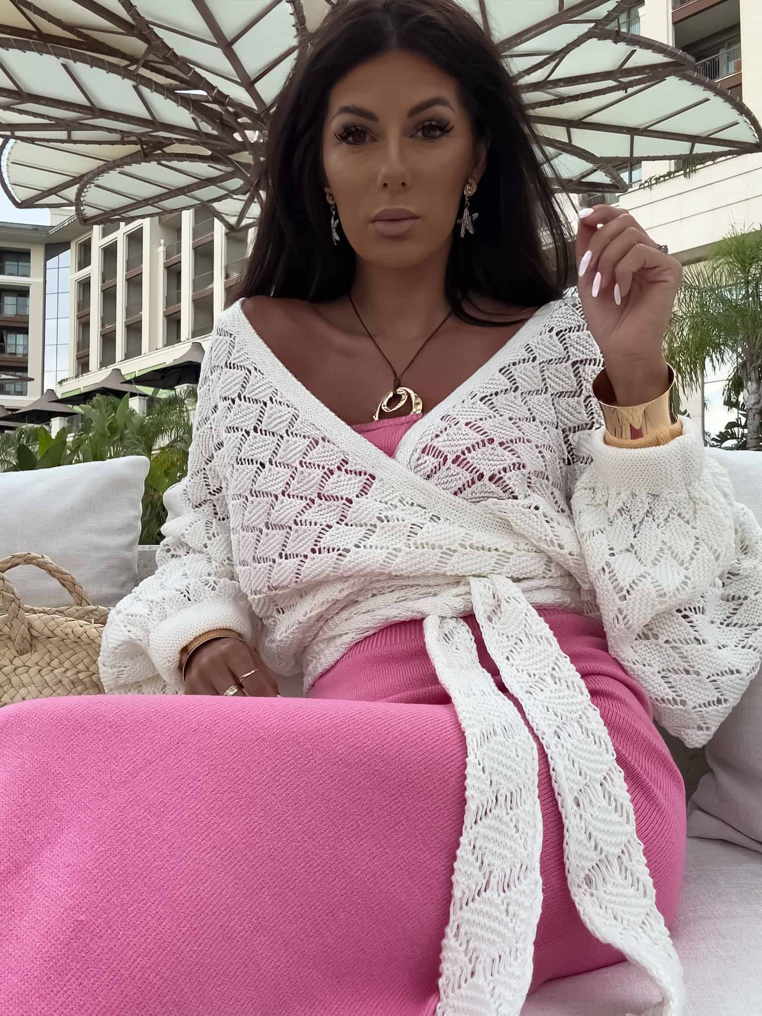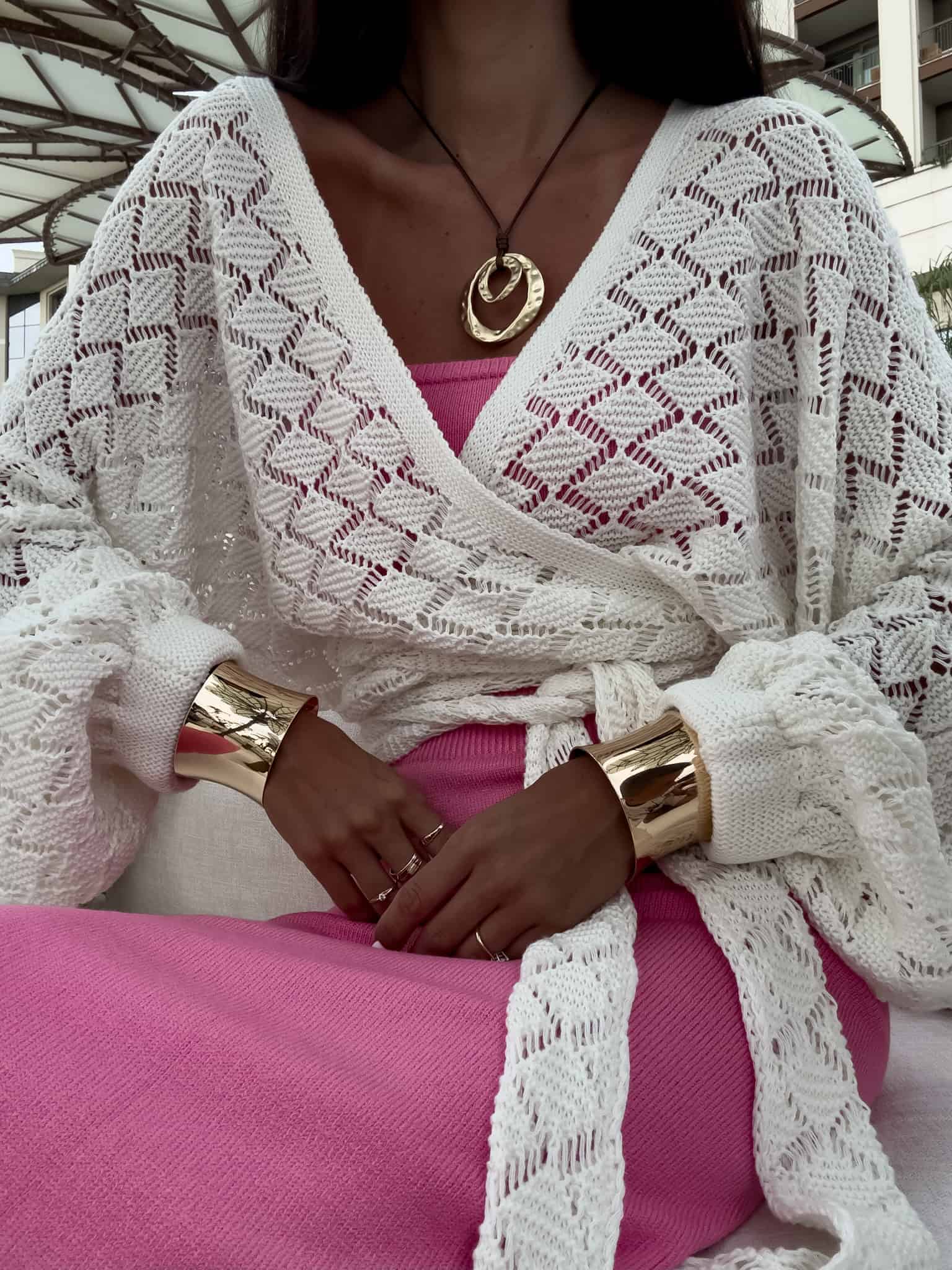 Kimono to stylowy i lekki element garderoby, który łączy w sobie elegancję z komfortem. Kimono jest przewiązywane, co pozwala na dopasowanie go do sylwetki oraz dodaje mu swobody w stylizacji. Można go nosić zarówno z przodu, jak i z tyłu, co daje szerokie możliwości noszenia i dostosowania do różnych stylizacji. Długi rękaw zakończony gumką sprawia, że kimono jest wygodne i dobrze trzyma się na ramionach, dodając całości eleganckiego wyglądu. Idealne do noszenia na co dzień lub na bardziej formalne okazje.