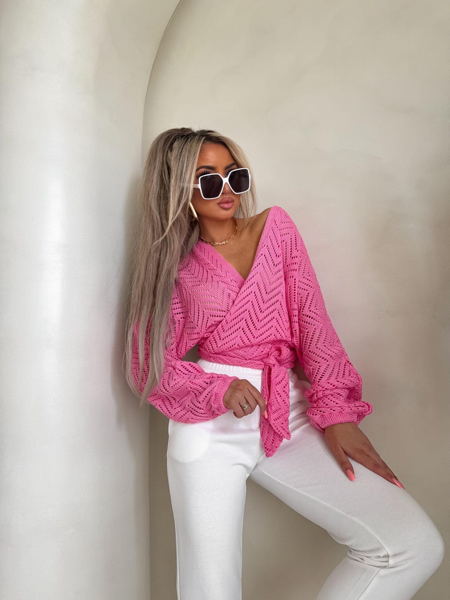 Ażurowe kimono to stylowy i lekki element garderoby, który łączy w sobie elegancję z komfortem. Wykonane z przewiewnego materiału, posiada subtelną ażurową strukturę, która nadaje mu unikalnego charakteru. Kimono jest przewiązywane, co pozwala na dopasowanie go do sylwetki oraz dodaje mu swobody w stylizacji. Można go nosić zarówno z przodu, jak i z tyłu, co daje szerokie możliwości noszenia i dostosowania do różnych stylizacji. Długi rękaw zakończony gumką sprawia, że kimono jest wygodne i dobrze trzyma się na ramionach, dodając całości eleganckiego wyglądu. Idealne do noszenia na co dzień lub na bardziej formalne okazje.