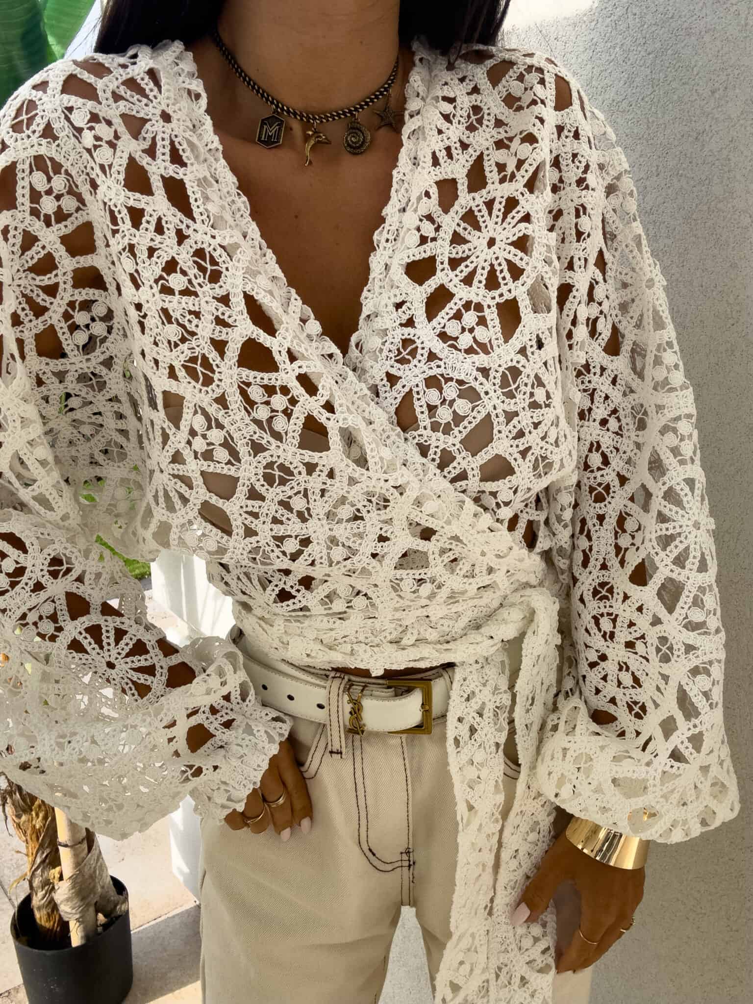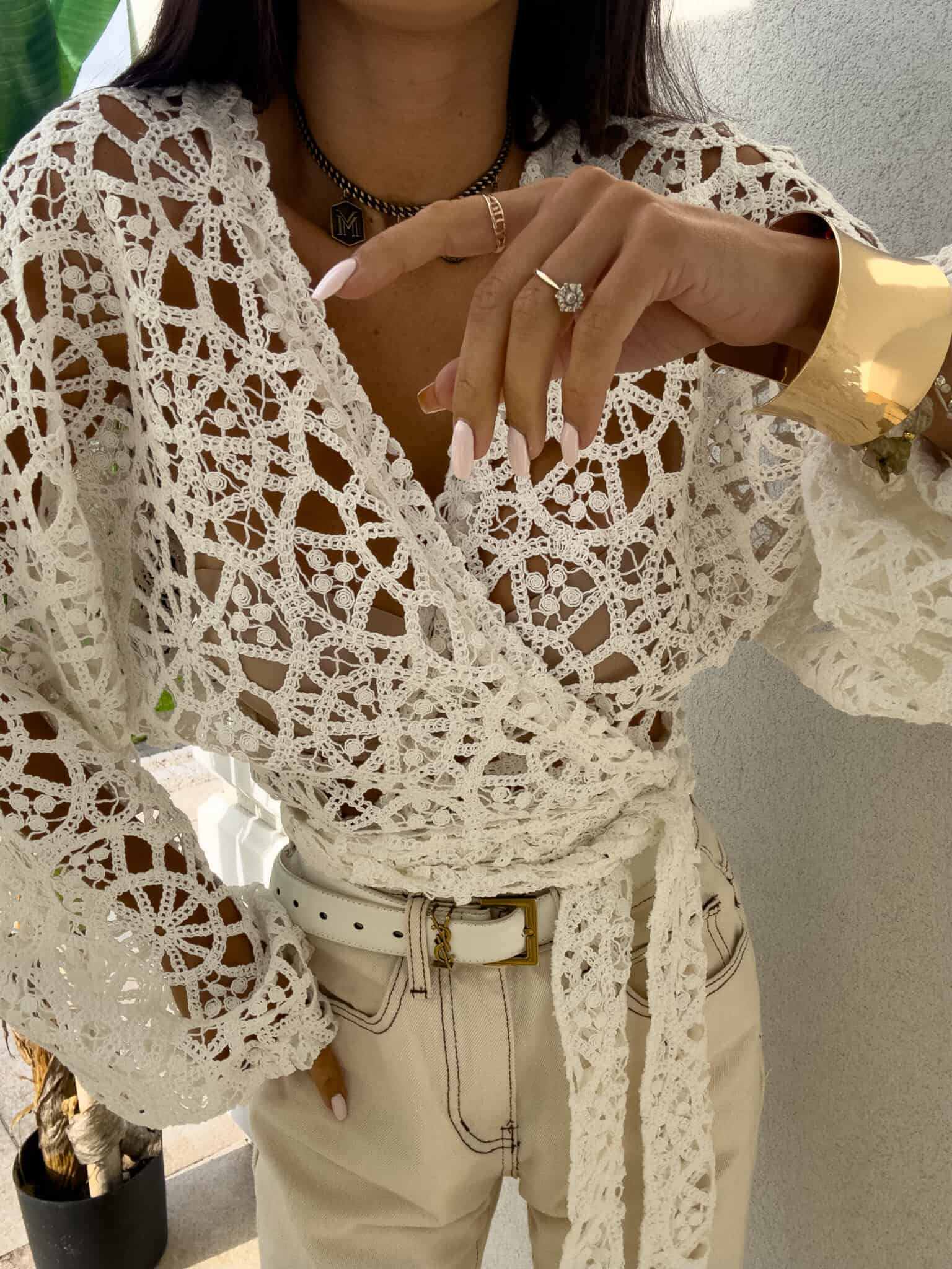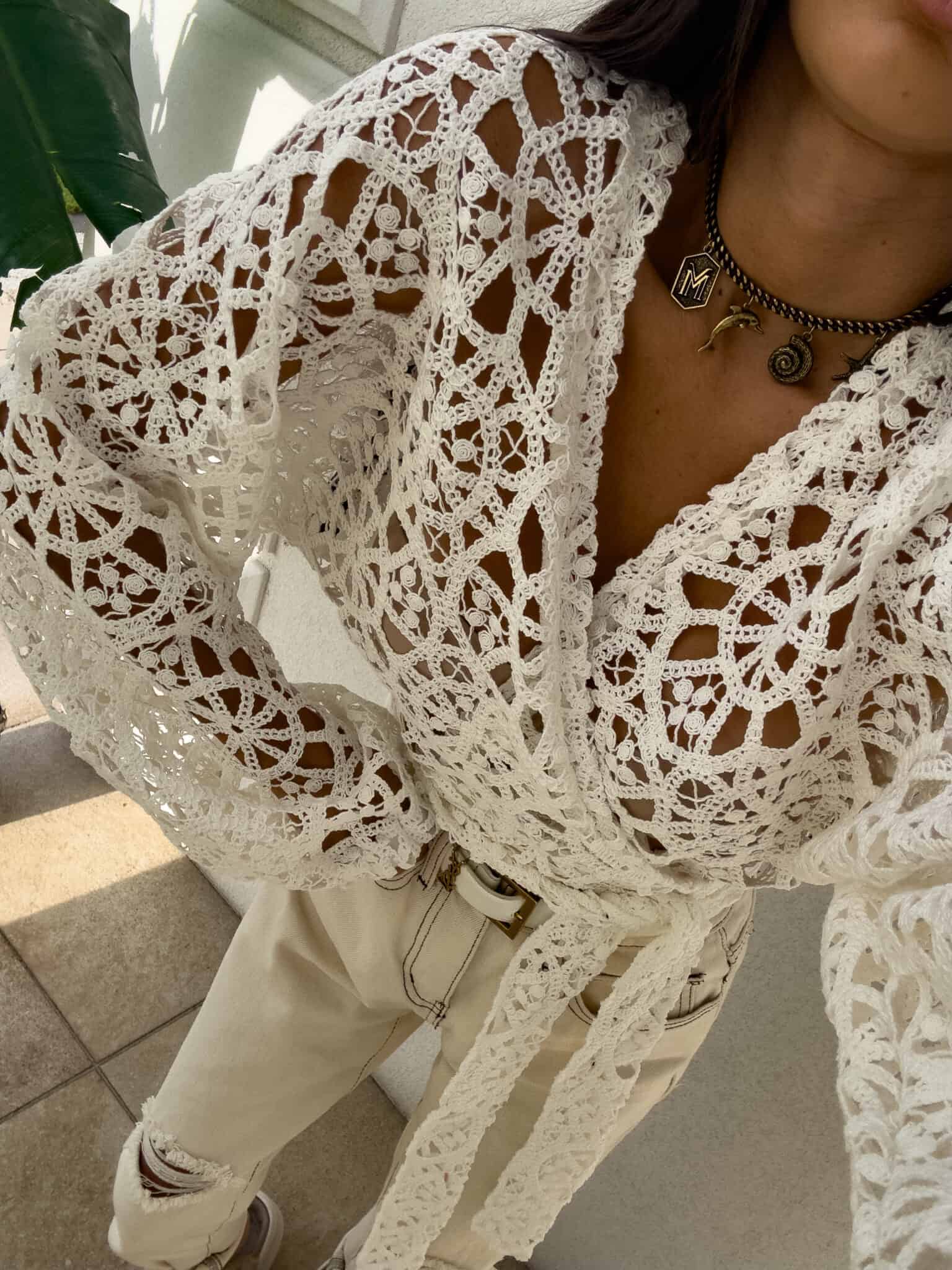 Ażurowe kimono to stylowy i lekki element garderoby, który łączy w sobie elegancję z komfortem. Wykonane z przewiewnego materiału, posiada subtelną ażurową strukturę, która nadaje mu unikalnego charakteru. Kimono jest przewiązywane, co pozwala na dopasowanie go do sylwetki oraz dodaje mu swobody w stylizacji. Można go nosić zarówno z przodu, jak i z tyłu, co daje szerokie możliwości noszenia i dostosowania do różnych stylizacji. Długi rękaw zakończony gumką sprawia, że kimono jest wygodne i dobrze trzyma się na ramionach, dodając całości eleganckiego wyglądu. Idealne do noszenia na co dzień lub na bardziej formalne okazje.