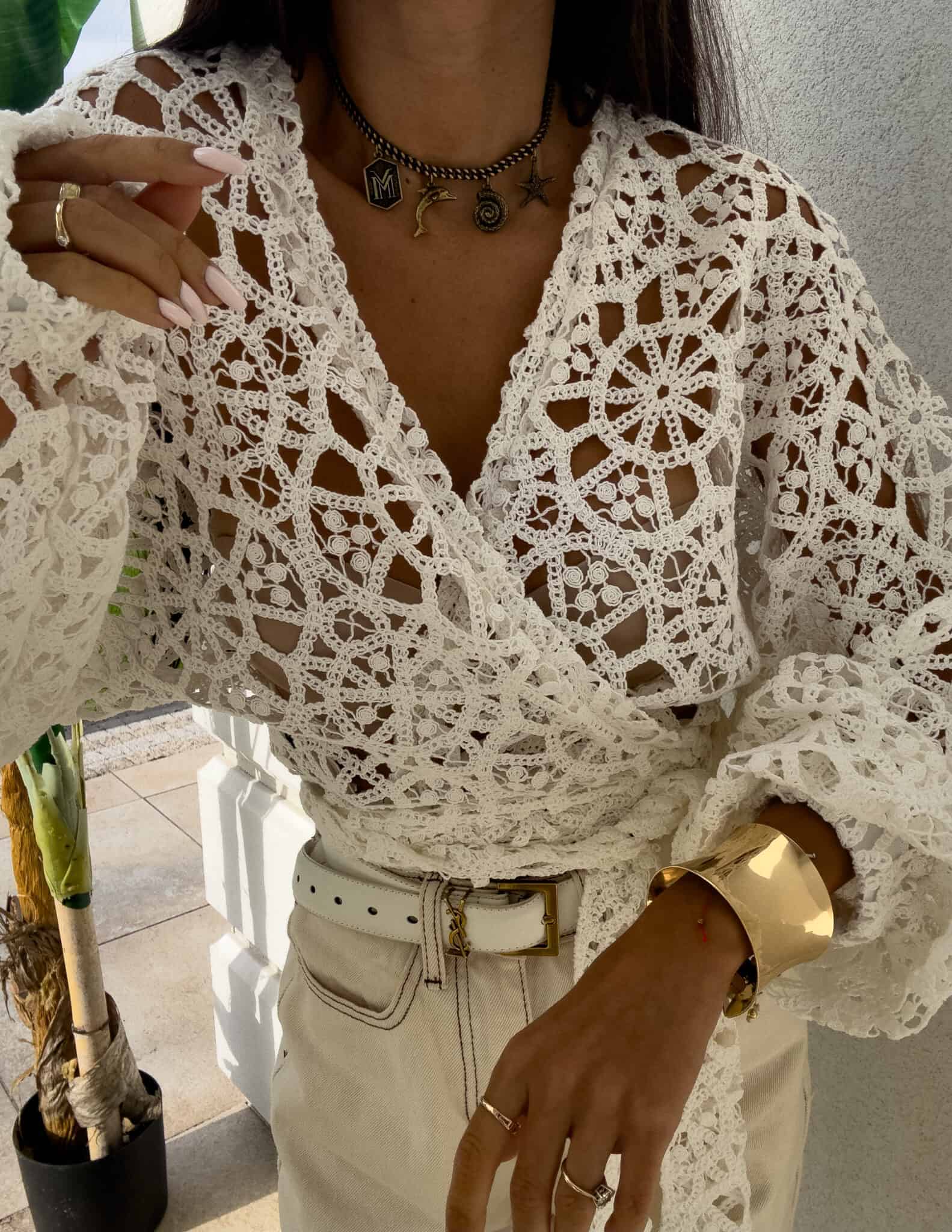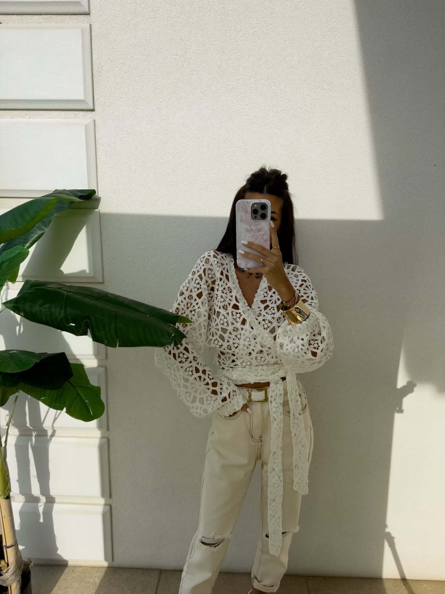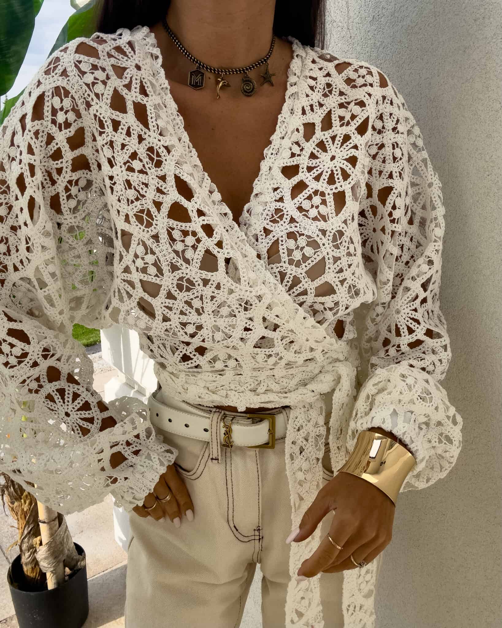 Ażurowe kimono to stylowy i lekki element garderoby, który łączy w sobie elegancję z komfortem. Wykonane z przewiewnego materiału, posiada subtelną ażurową strukturę, która nadaje mu unikalnego charakteru. Kimono jest przewiązywane, co pozwala na dopasowanie go do sylwetki oraz dodaje mu swobody w stylizacji. Można go nosić zarówno z przodu, jak i z tyłu, co daje szerokie możliwości noszenia i dostosowania do różnych stylizacji. Długi rękaw zakończony gumką sprawia, że kimono jest wygodne i dobrze trzyma się na ramionach, dodając całości eleganckiego wyglądu. Idealne do noszenia na co dzień lub na bardziej formalne okazje.