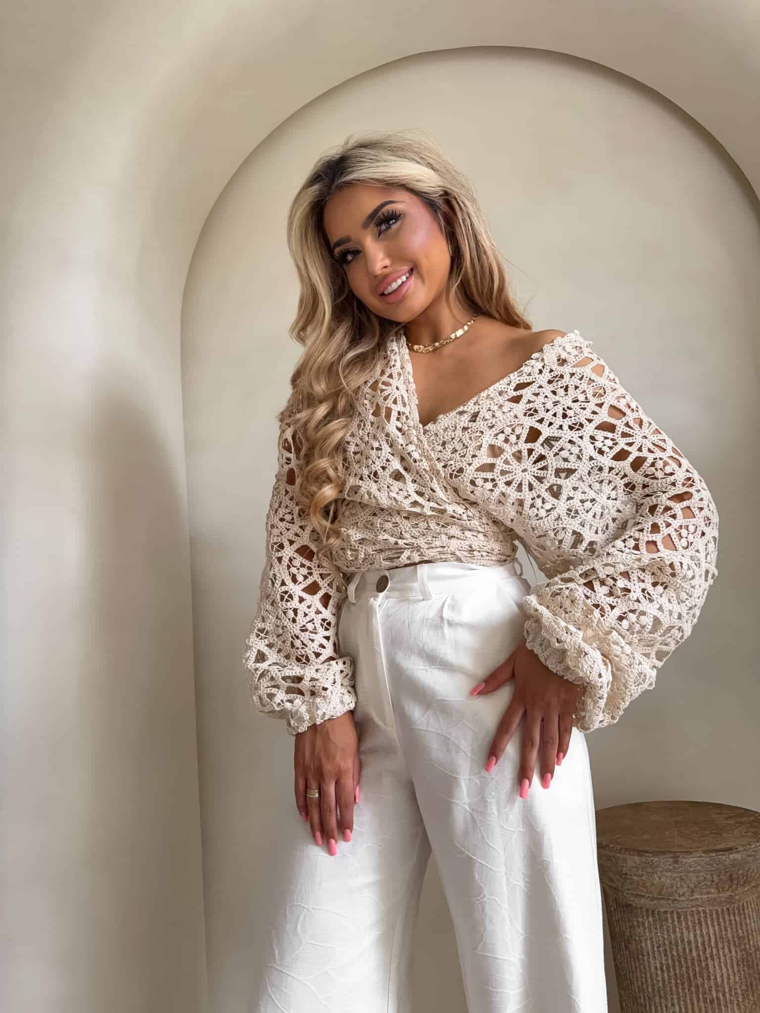 Ażurowe kimono to stylowy i lekki element garderoby, który łączy w sobie elegancję z komfortem. Wykonane z przewiewnego materiału, posiada subtelną ażurową strukturę, która nadaje mu unikalnego charakteru. Kimono jest przewiązywane, co pozwala na dopasowanie go do sylwetki oraz dodaje mu swobody w stylizacji. Można go nosić zarówno z przodu, jak i z tyłu, co daje szerokie możliwości noszenia i dostosowania do różnych stylizacji. Długi rękaw zakończony gumką sprawia, że kimono jest wygodne i dobrze trzyma się na ramionach, dodając całości eleganckiego wyglądu. Idealne do noszenia na co dzień lub na bardziej formalne okazje.