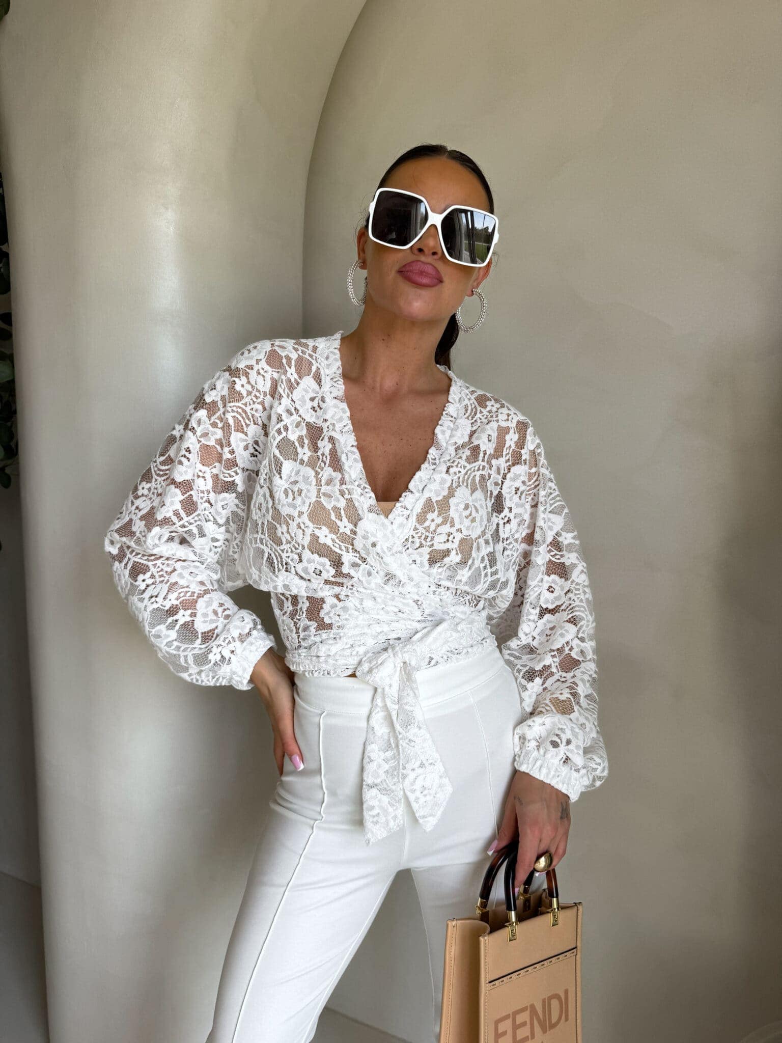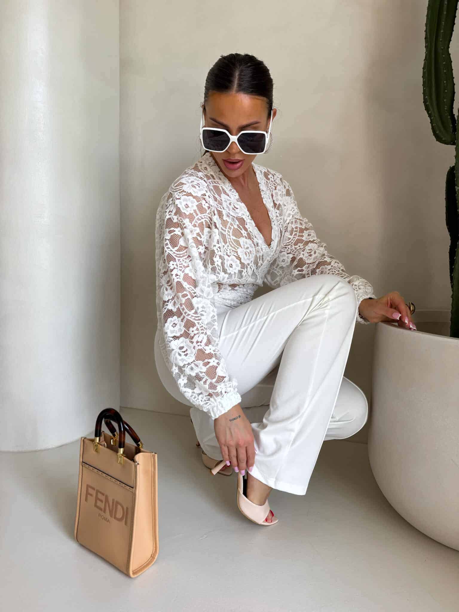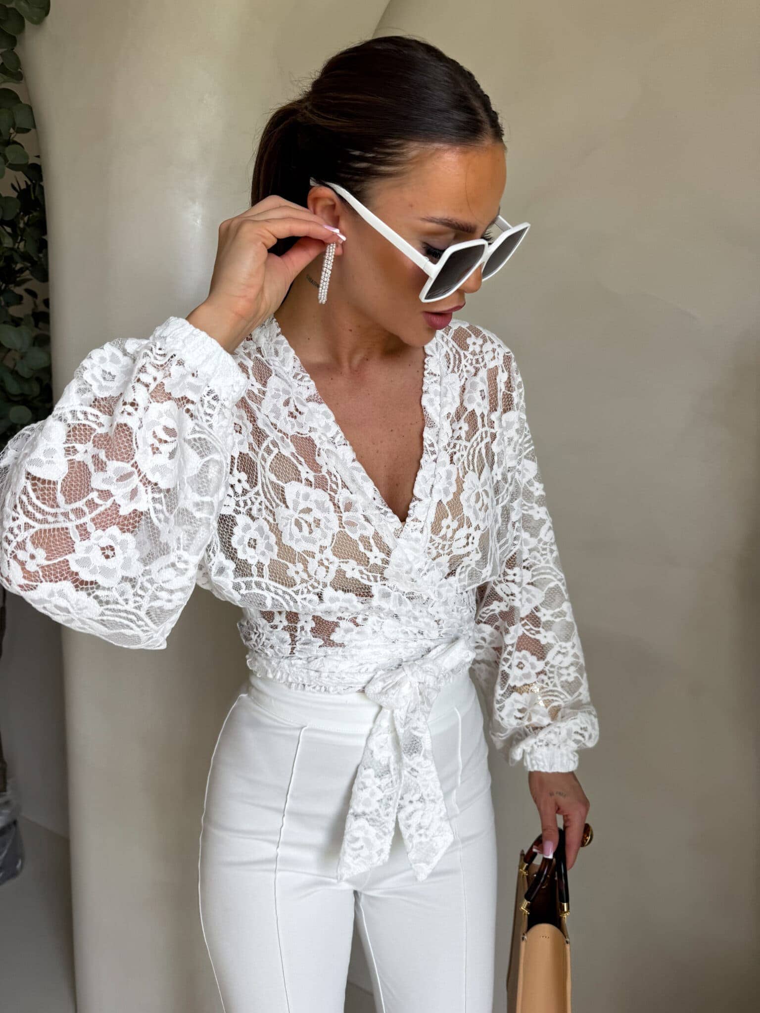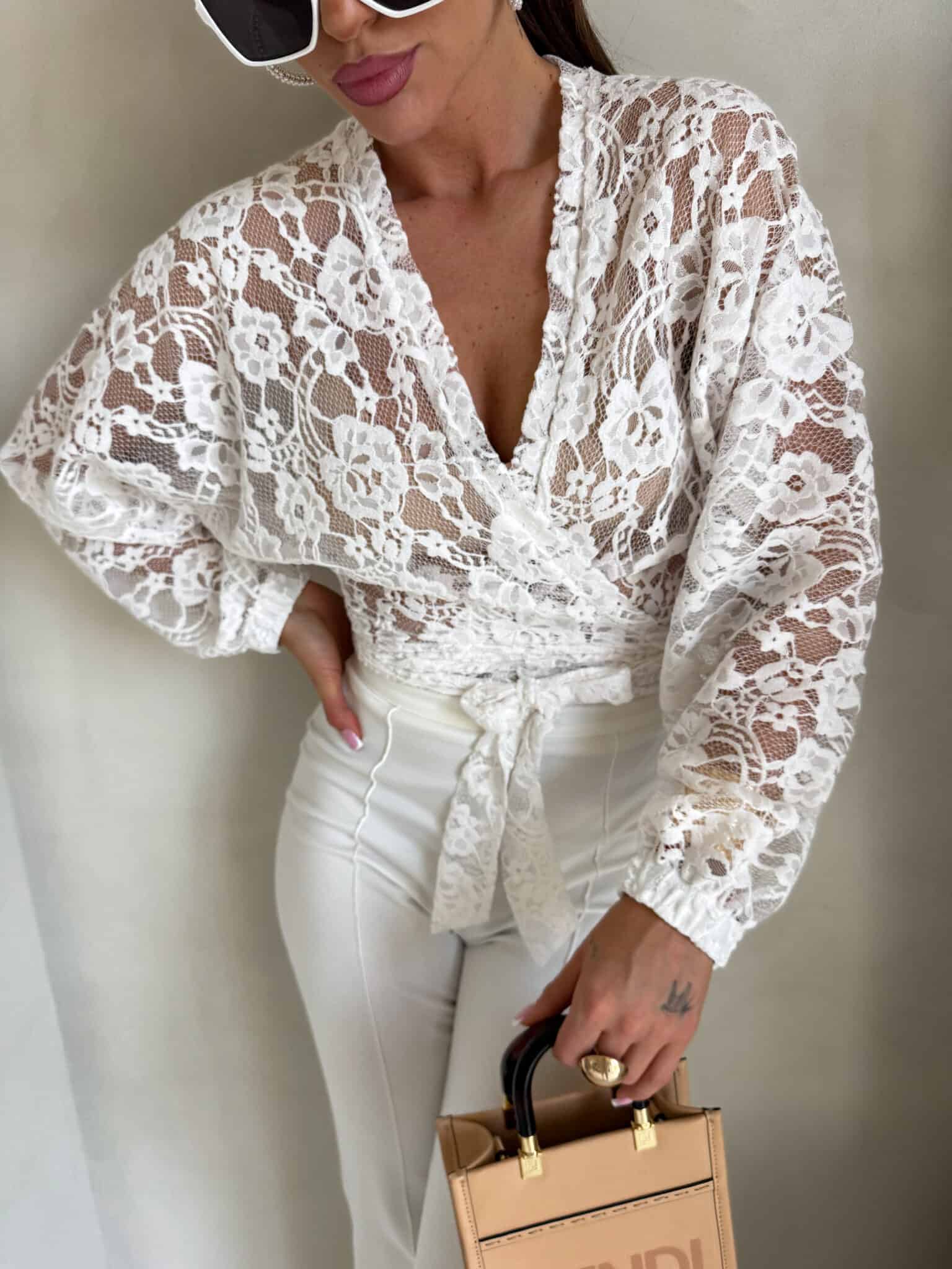 Ażurowe kimono to stylowy i lekki element garderoby, który łączy w sobie elegancję z komfortem. Wykonane z przewiewnego materiału, posiada subtelną ażurową strukturę, która nadaje mu unikalnego charakteru. Kimono jest przewiązywane, co pozwala na dopasowanie go do sylwetki oraz dodaje mu swobody w stylizacji. Można go nosić zarówno z przodu, jak i z tyłu, co daje szerokie możliwości noszenia i dostosowania do różnych stylizacji. Długi rękaw zakończony gumką sprawia, że kimono jest wygodne i dobrze trzyma się na ramionach, dodając całości eleganckiego wyglądu. Idealne do noszenia na co dzień lub na bardziej formalne okazje.