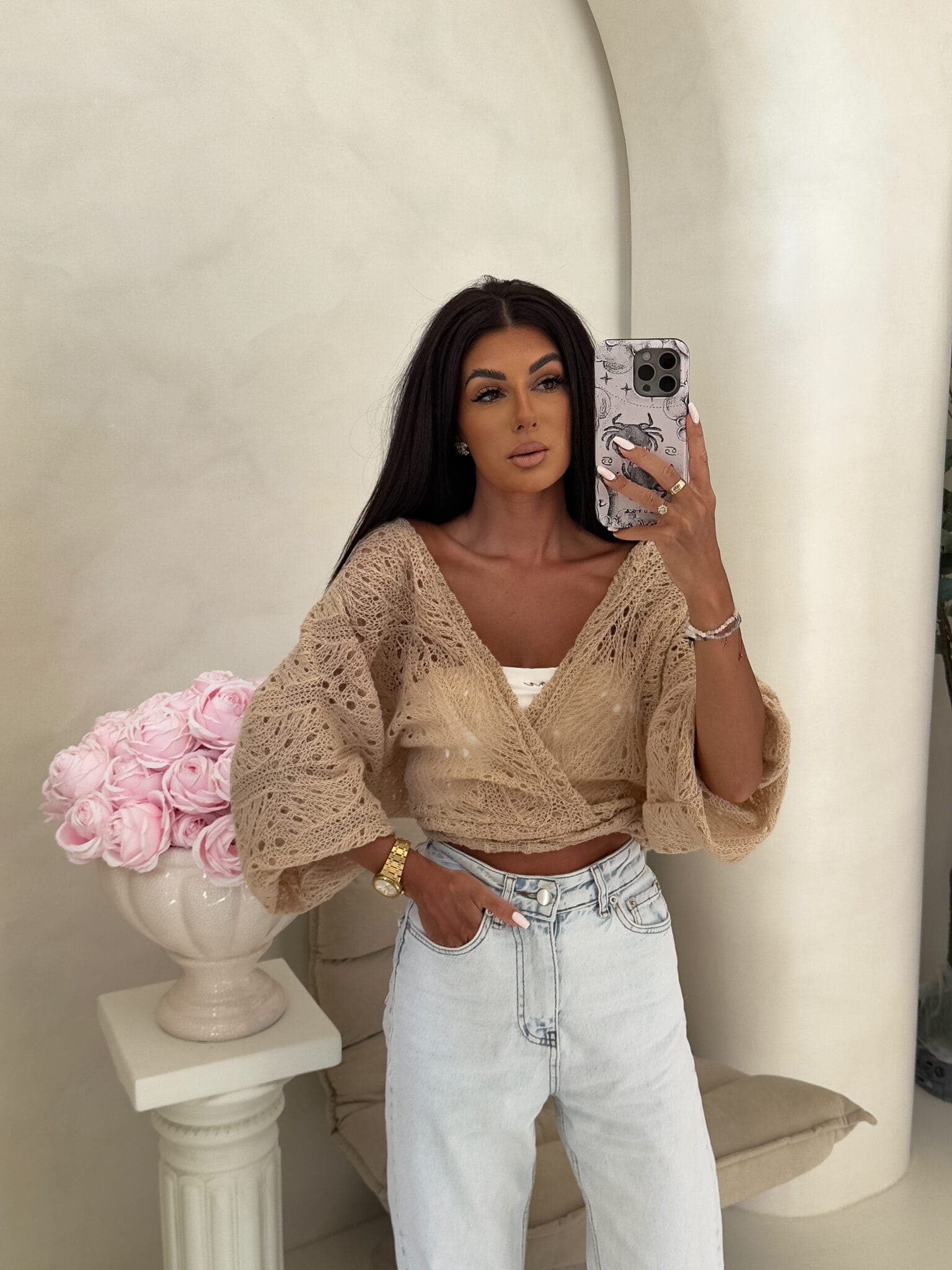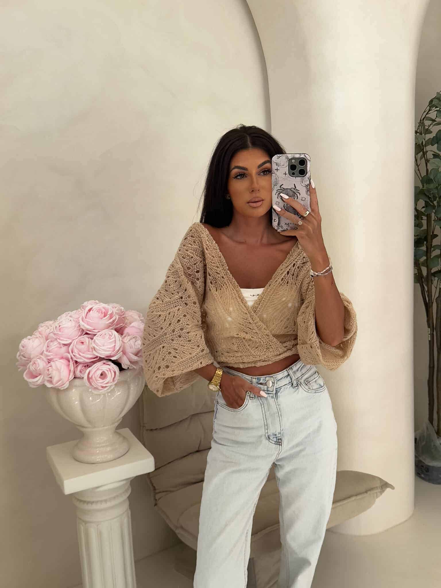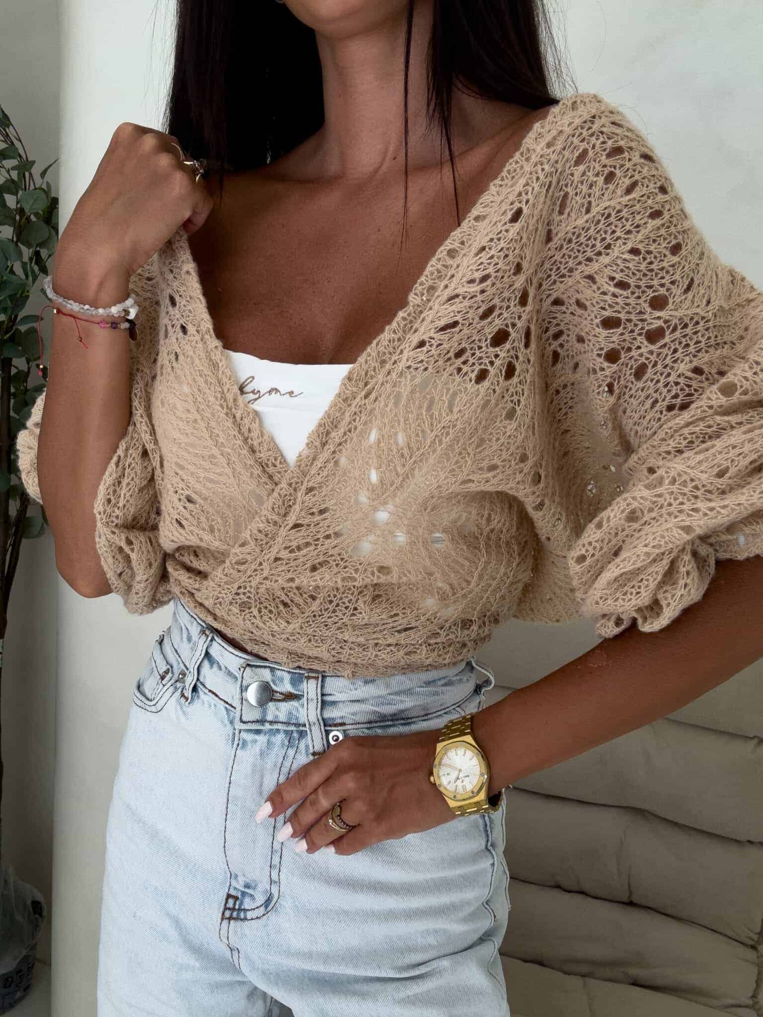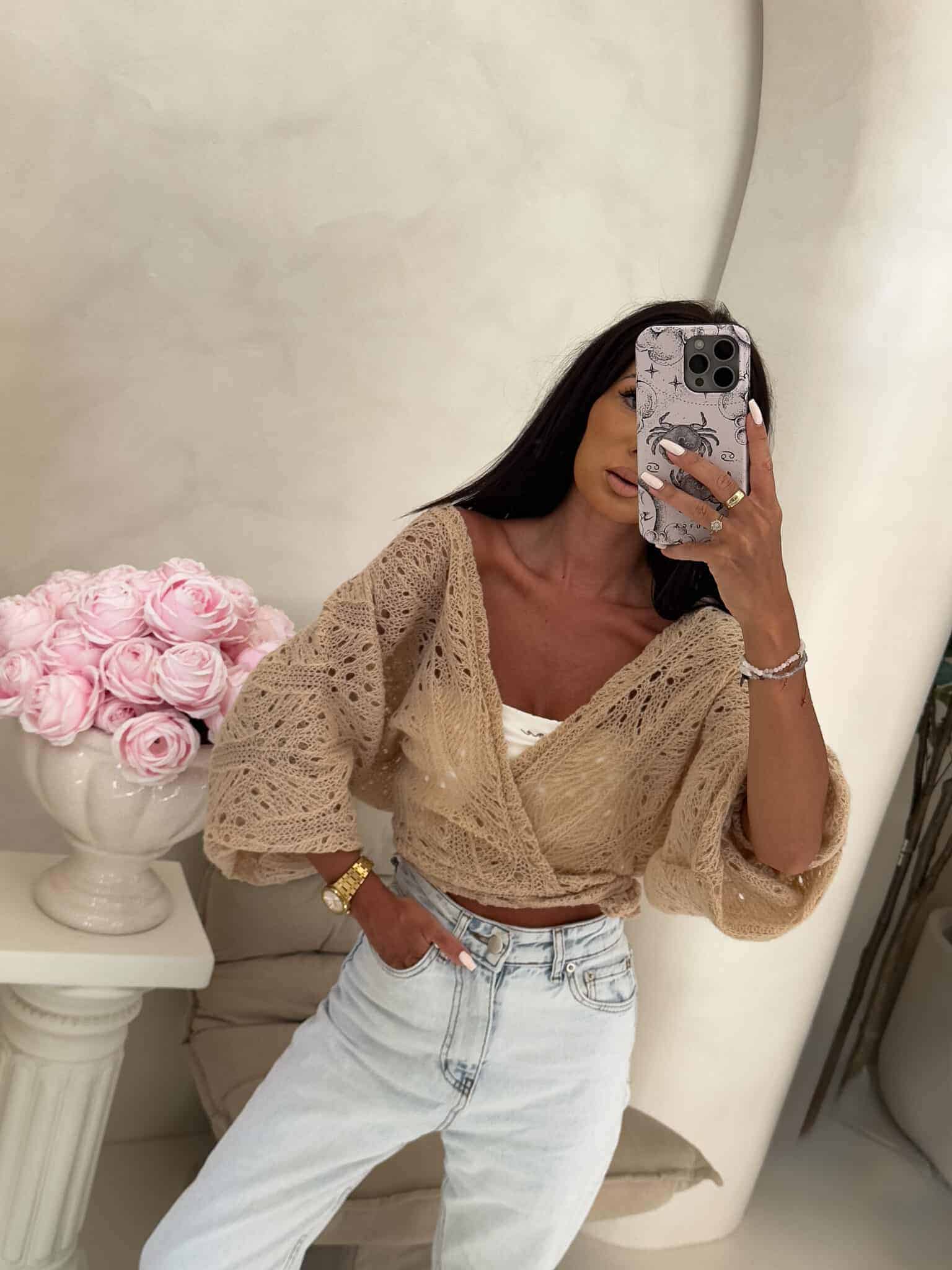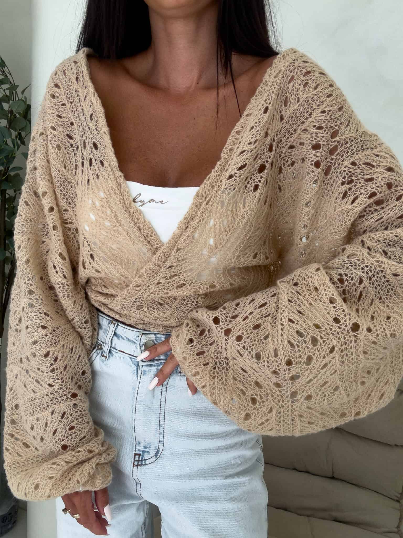 Ażurowe kimono to stylowy i lekki element garderoby, który łączy w sobie elegancję z komfortem. Wykonane z przewiewnego materiału, posiada subtelną ażurową strukturę, która nadaje mu unikalnego charakteru. Kimono jest przewiązywane, co pozwala na dopasowanie go do sylwetki oraz dodaje mu swobody w stylizacji. Można go nosić zarówno z przodu, jak i z tyłu, co daje szerokie możliwości noszenia i dostosowania do różnych stylizacji. Idealne do noszenia na co dzień lub na bardziej formalne okazje.