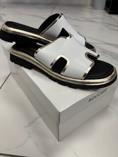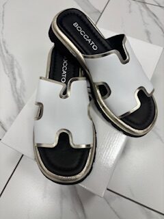 Stylowe i wygodne klapki damskie Boccato to idealna propozycja na ciepłe dni. Wykonane z wysokiej jakości skóry naturalnej, zachwycają modnym designem i komfortem użytkowania. Biały kolor w połączeniu z subtelnym złotym wykończeniem sprawia, że te klapki będą doskonałym uzupełnieniem letnich stylizacji.