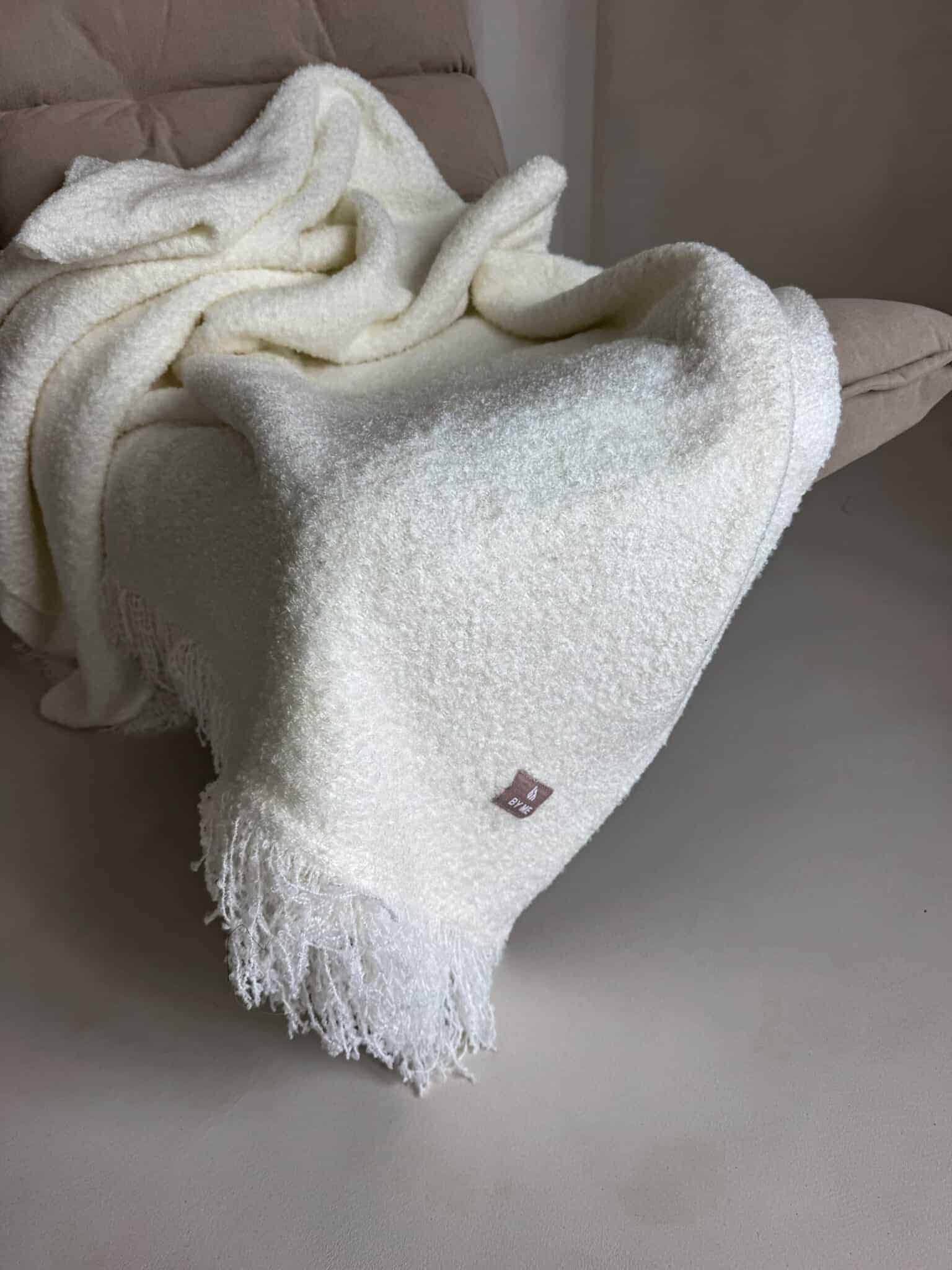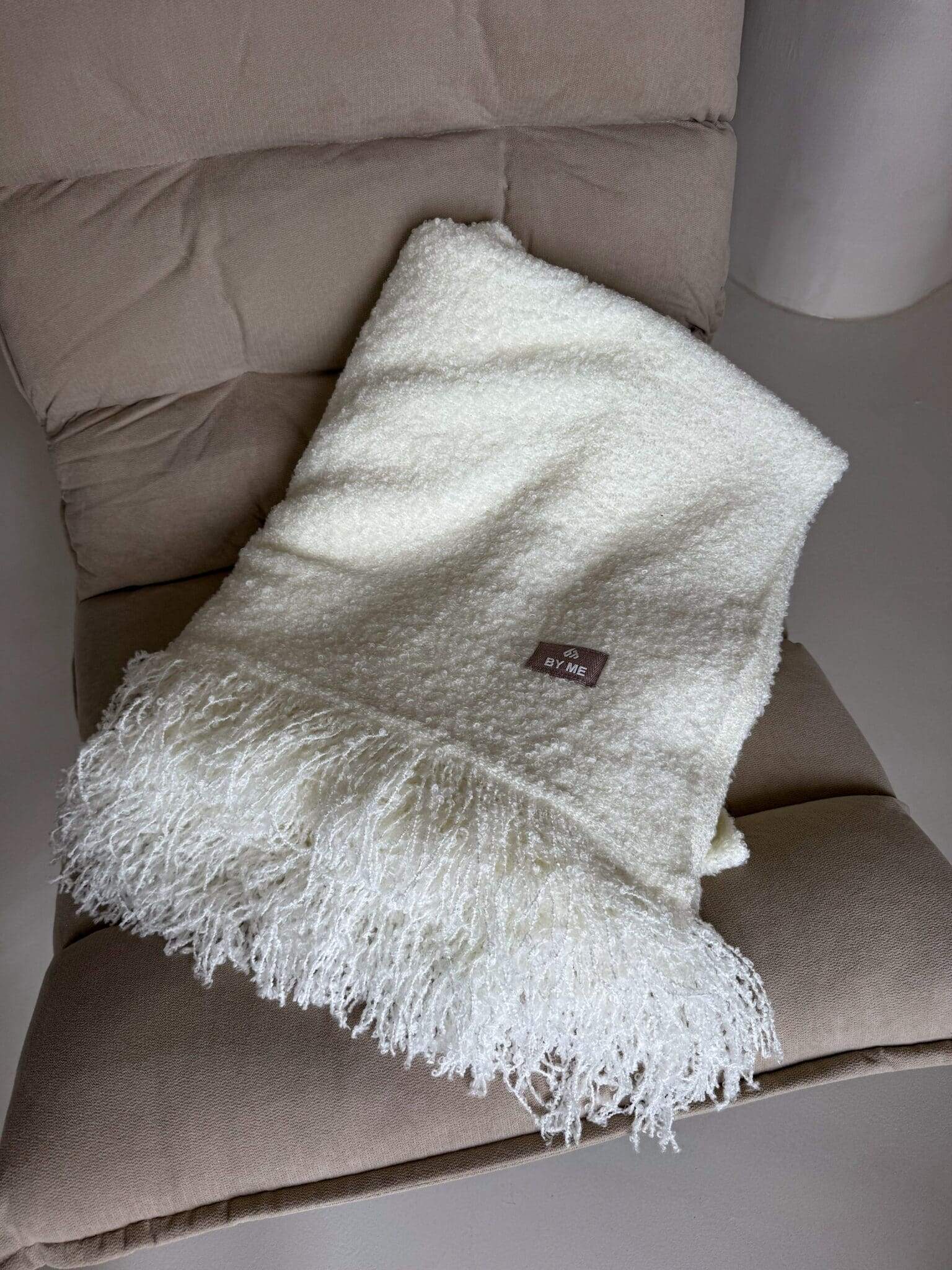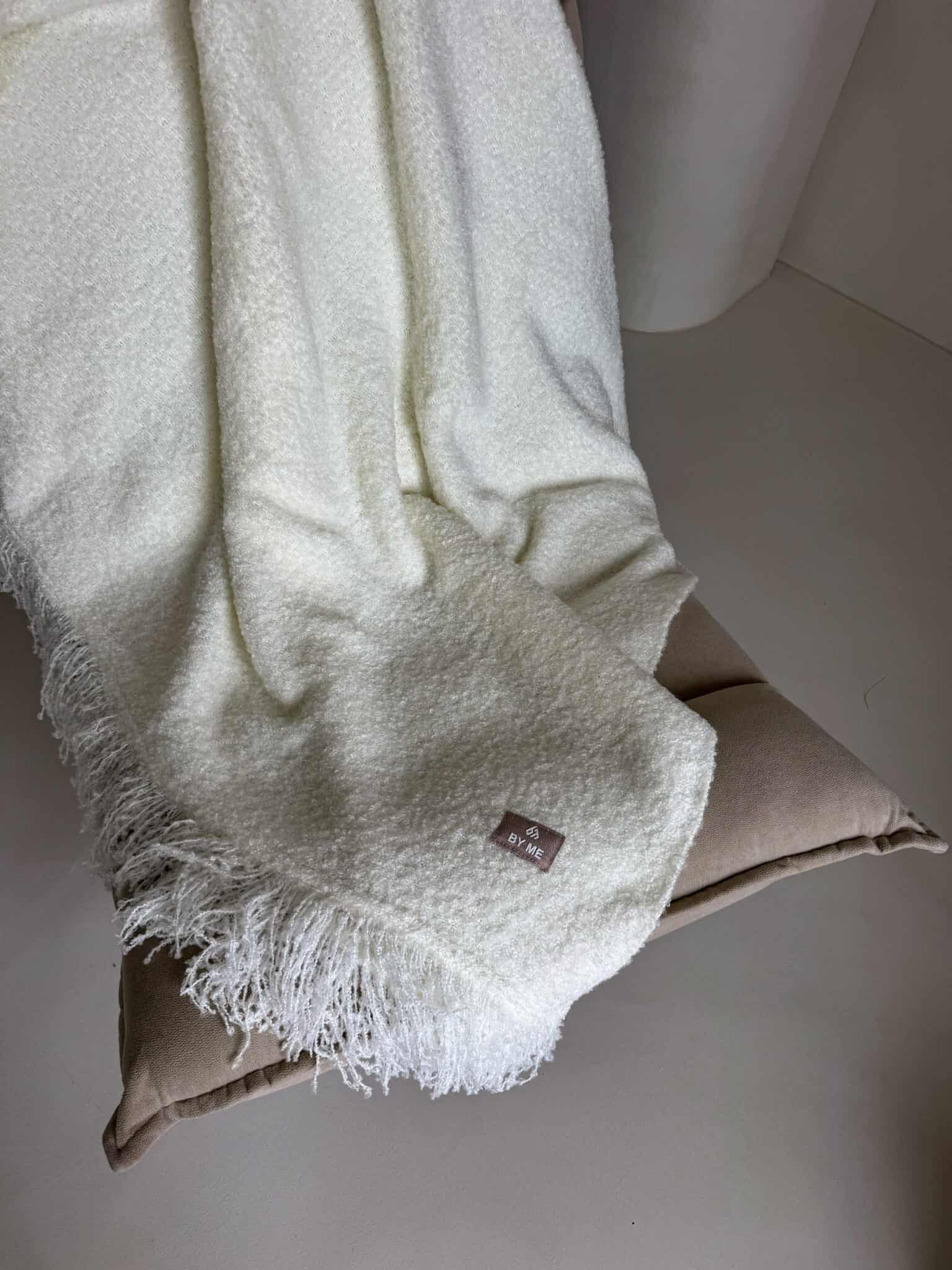 Piękny koc wykonany z puszystej, przyjemnej w dotyku tkaniny typu bouclé, która nadaje mu wyjątkową miękkość. Jego duży rozmiar zapewnia komfort i otulenie. Brzegi koca wykończone są długimi, dekoracyjnymi frędzlami, a w jednym z rogów znajduje się mała, dyskretna naszywka z logo.
