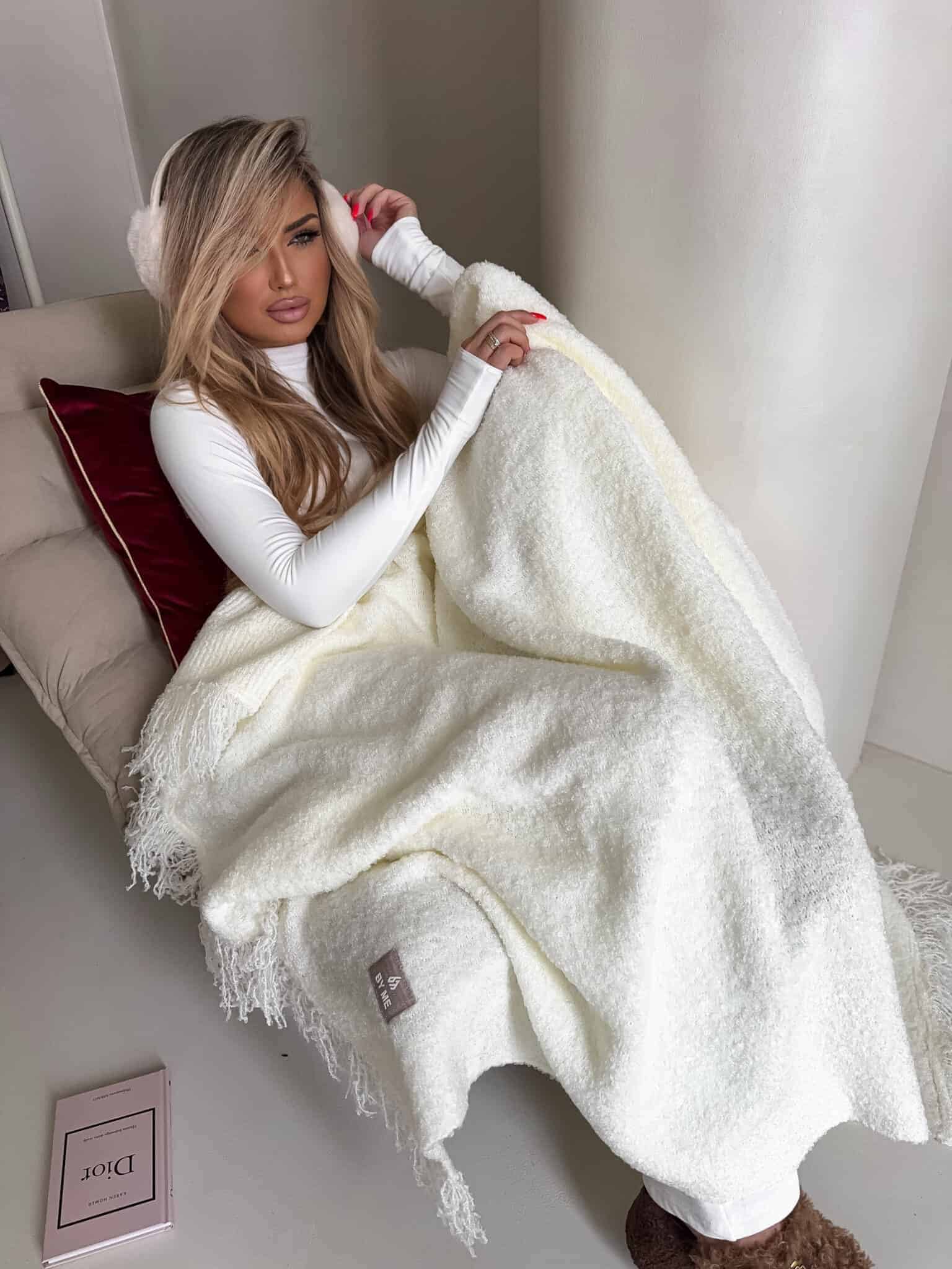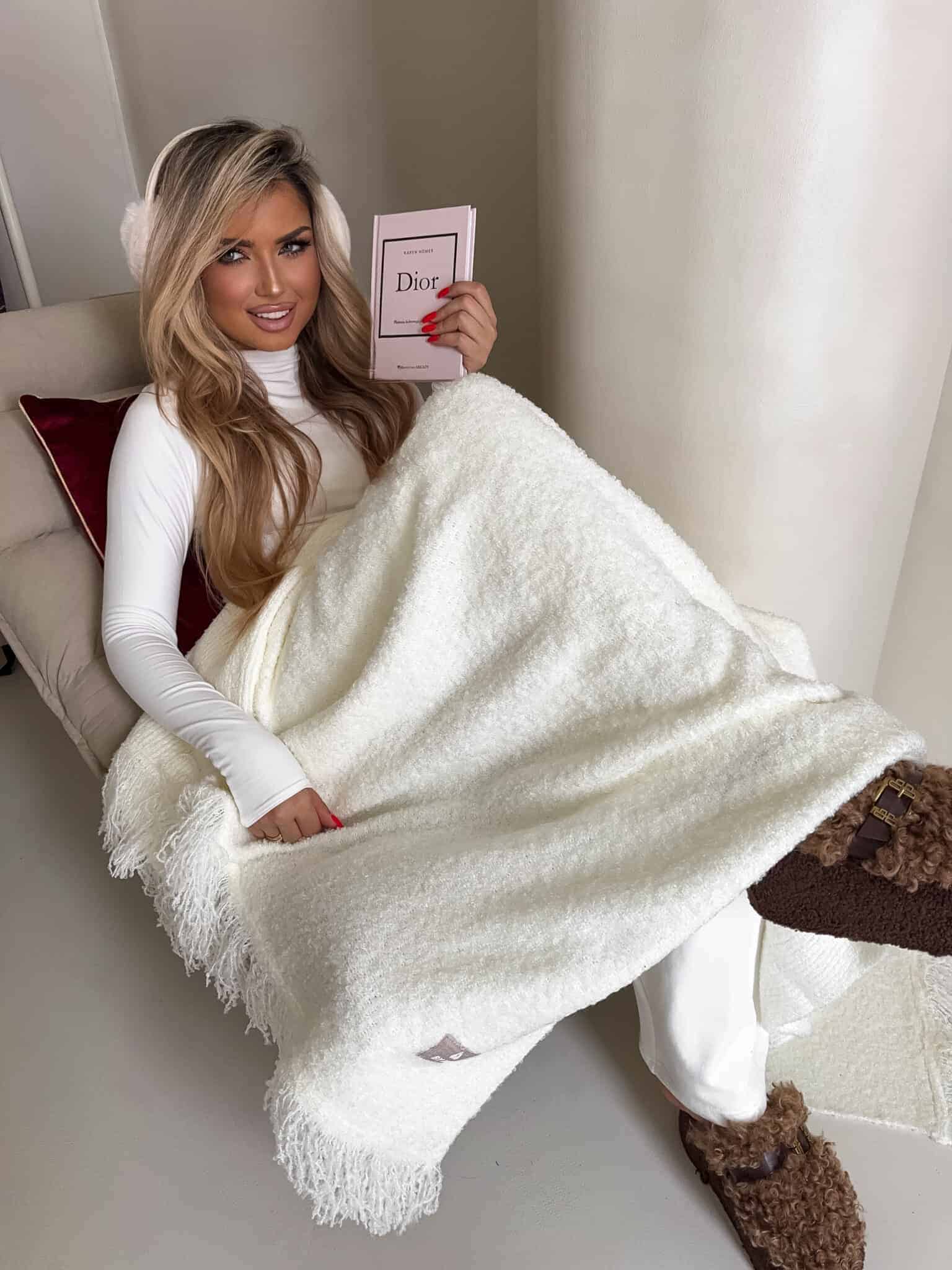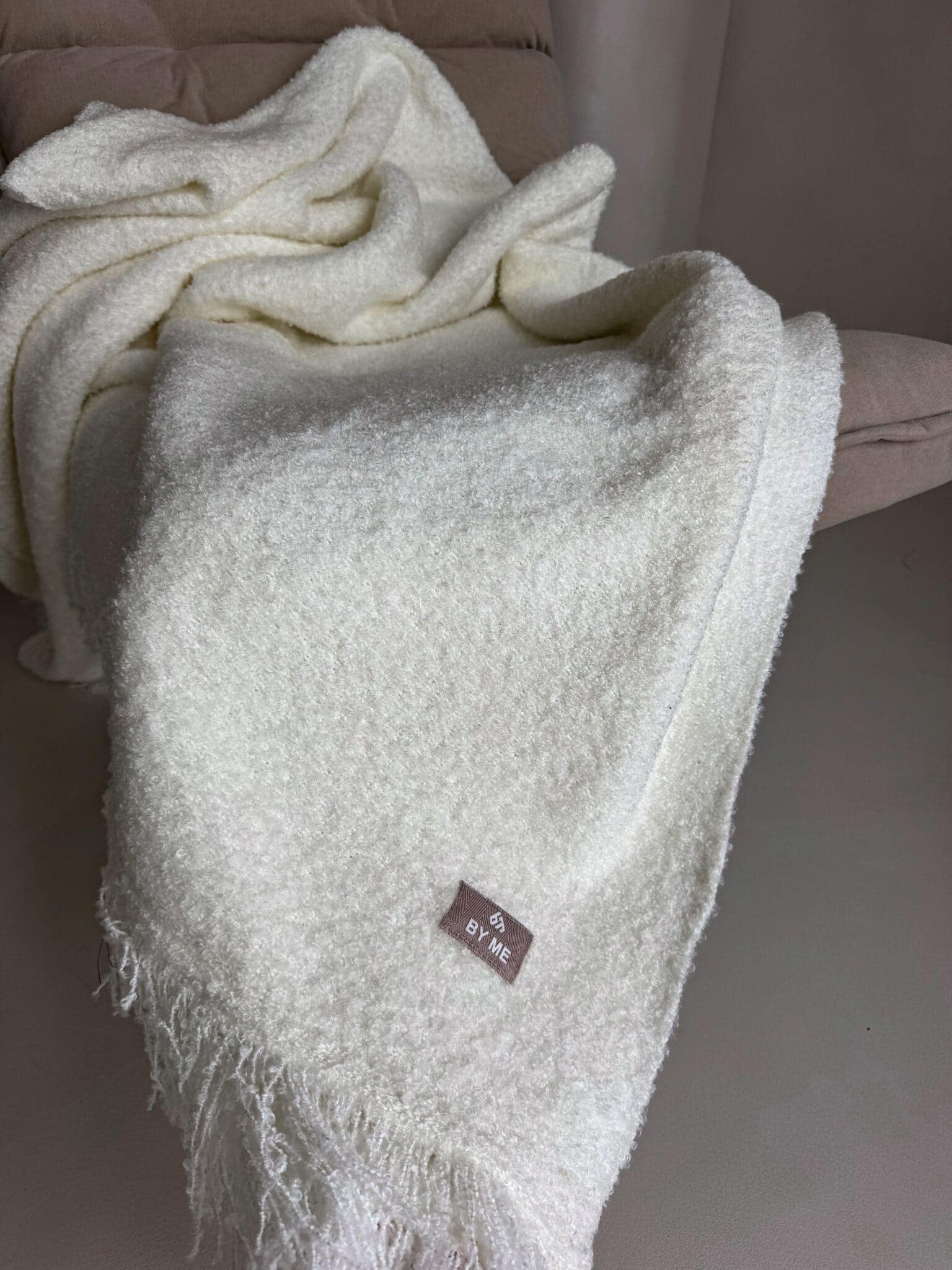 Piękny koc wykonany z puszystej, przyjemnej w dotyku tkaniny typu bouclé, która nadaje mu wyjątkową miękkość. Jego duży rozmiar zapewnia komfort i otulenie. Brzegi koca wykończone są długimi, dekoracyjnymi frędzlami, a w jednym z rogów znajduje się mała, dyskretna naszywka z logo.