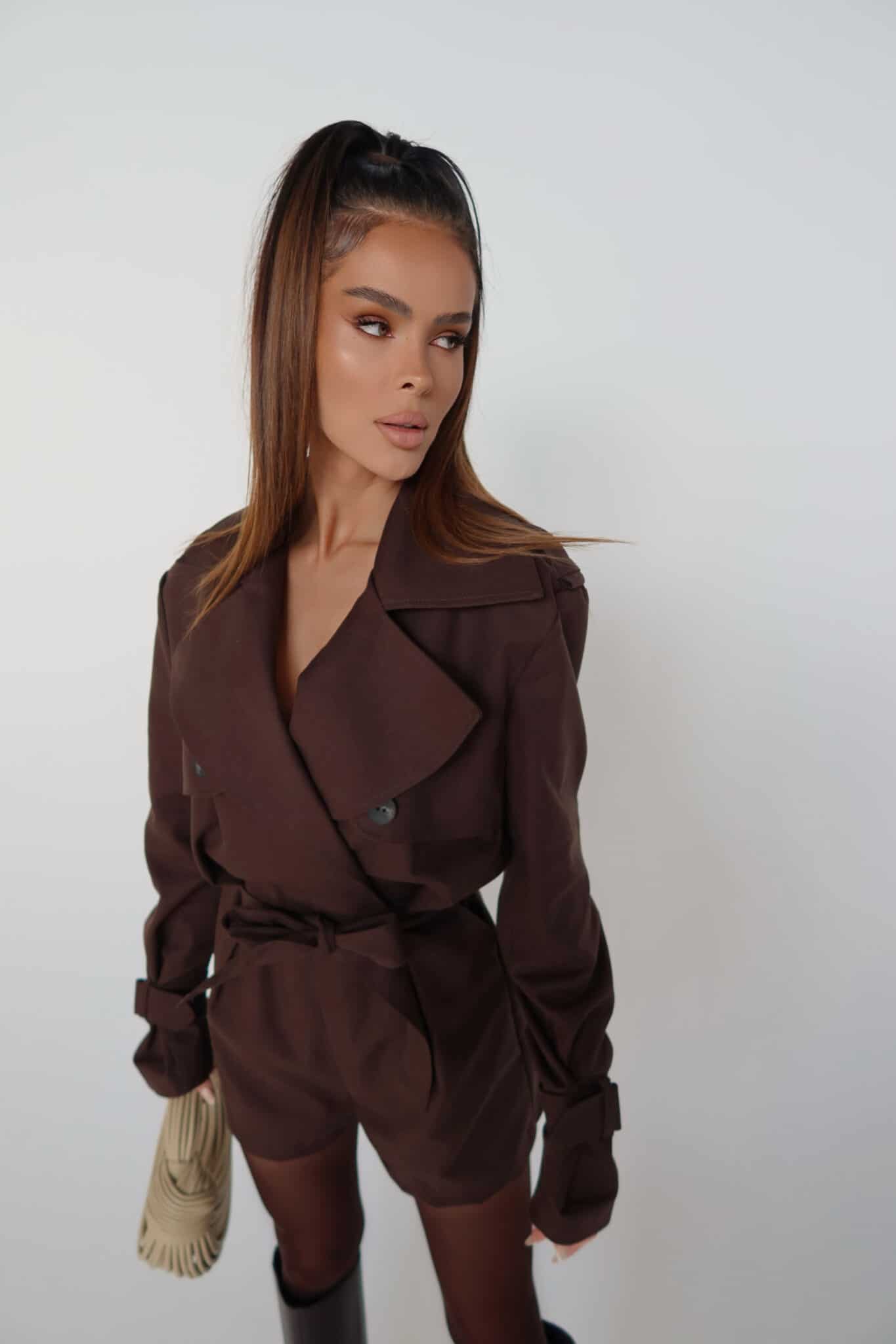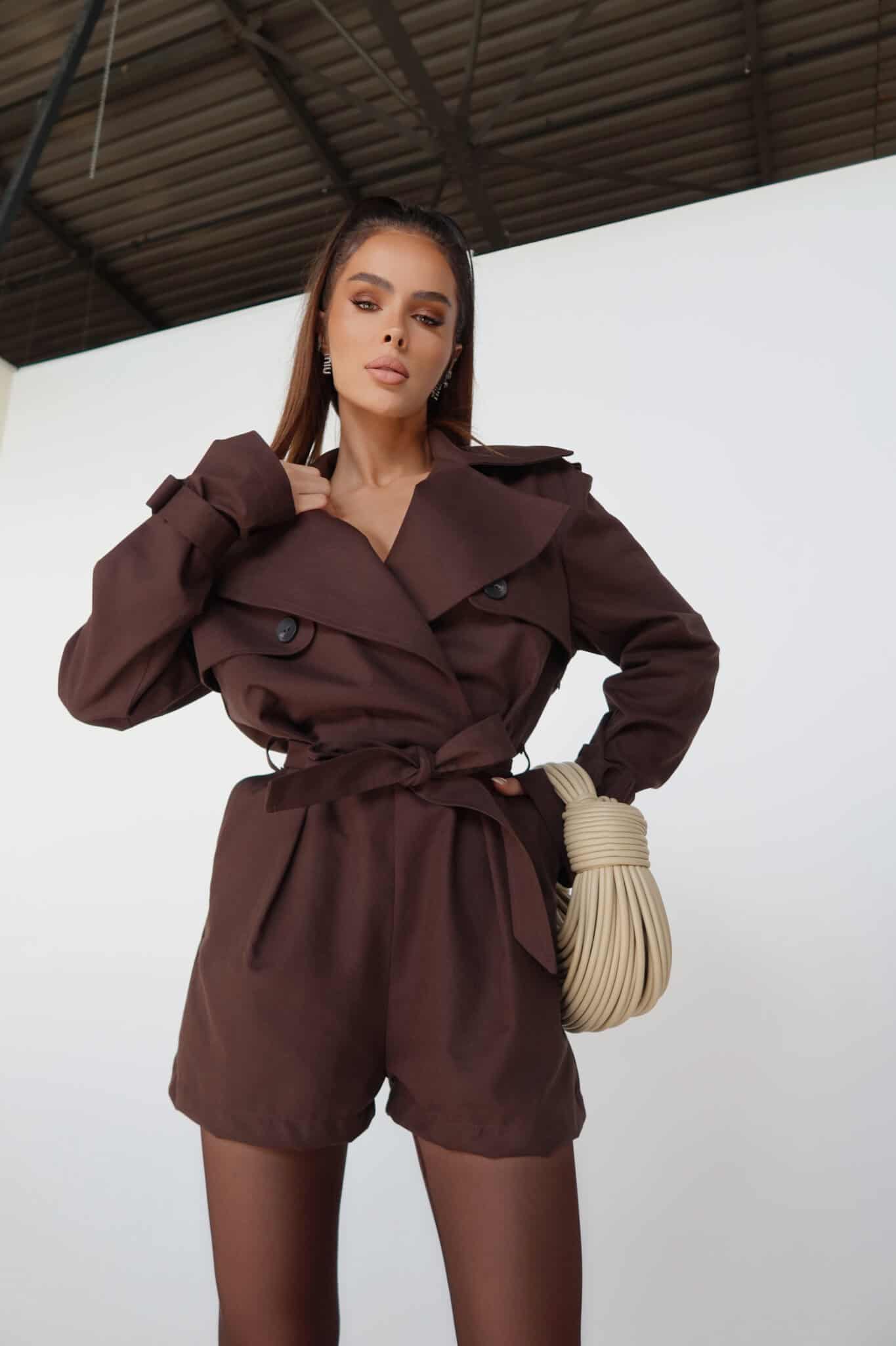 Kombinezon o kroju inspirowanym klasycznym trenczem, z wyraźnie zaznaczoną talią i szerokim kołnierzem. Dwurzędowe guziki, mankiety z patkami i naramienniki nawiązują do ponadczasowej formy, a krótkie nogawki i boczny zamek nadają mu nowoczesnego, kobiecego charakteru. Model dopełnia pasek wiązany w talii, który pozwala regulować sylwetkę. Idealny na sezon przejściowy – wystarczy dodać kozaki lub szpilki i gotowe.Skład: 50% wiskoza 50% bawełna