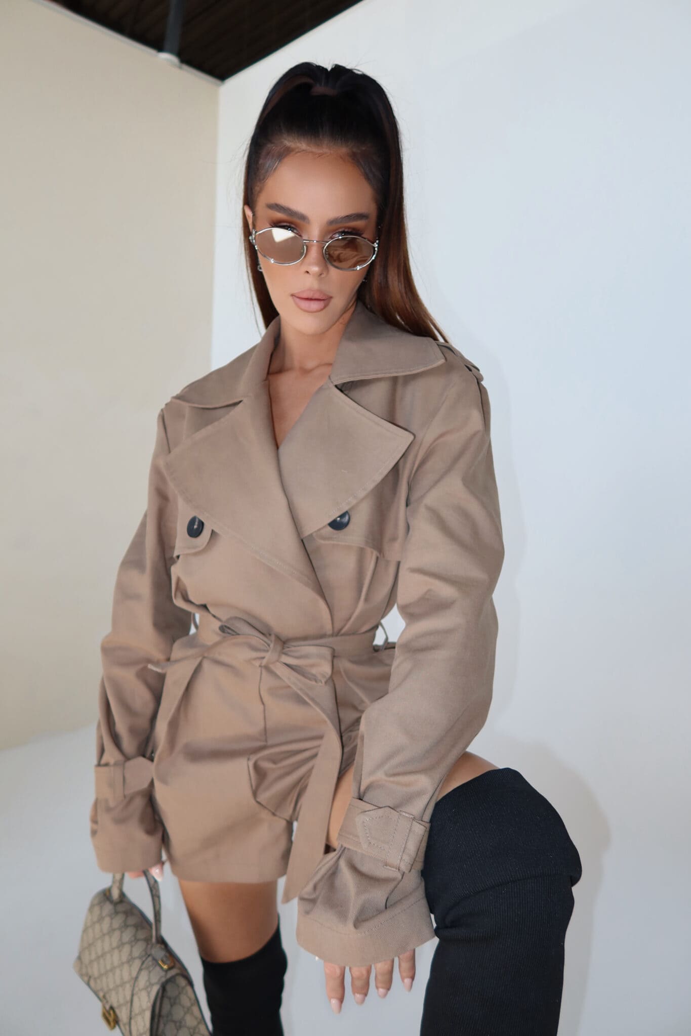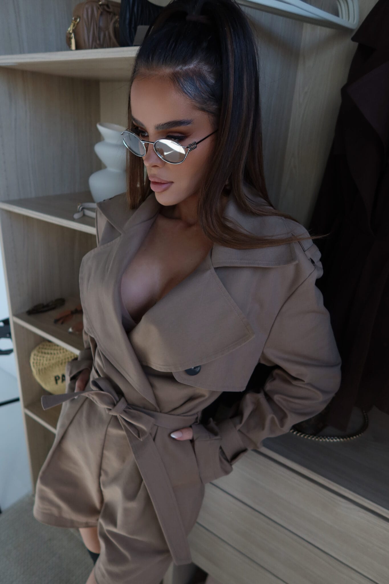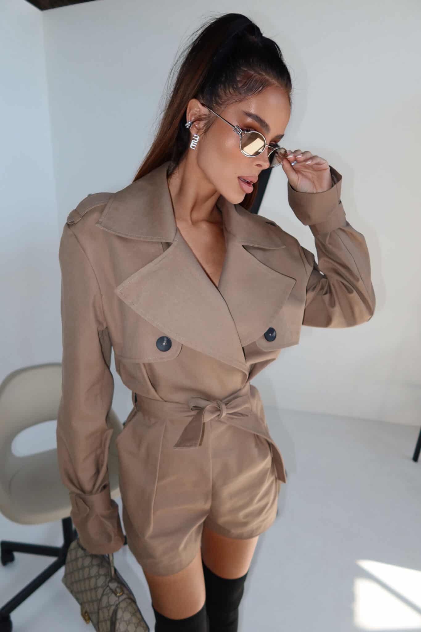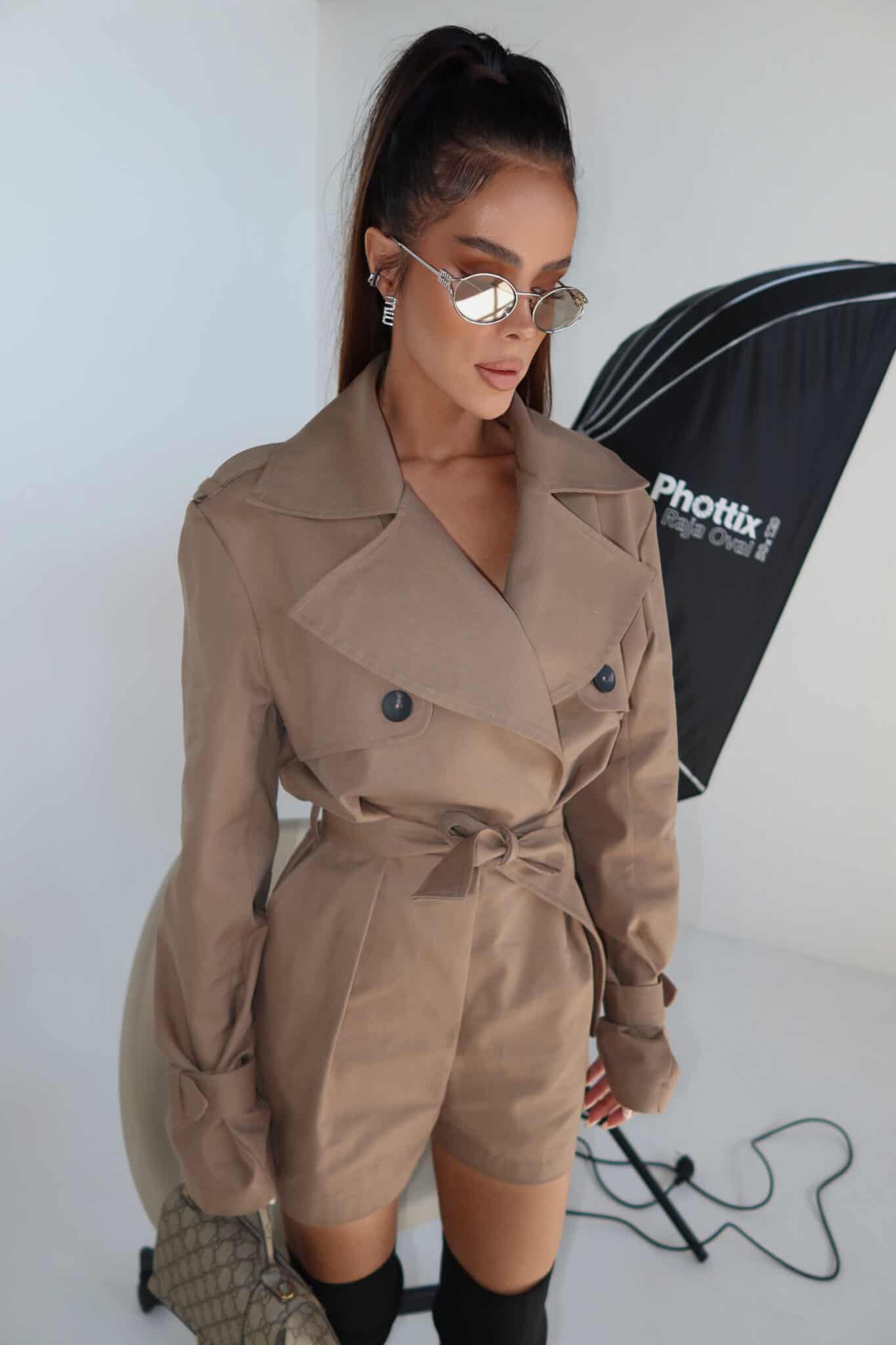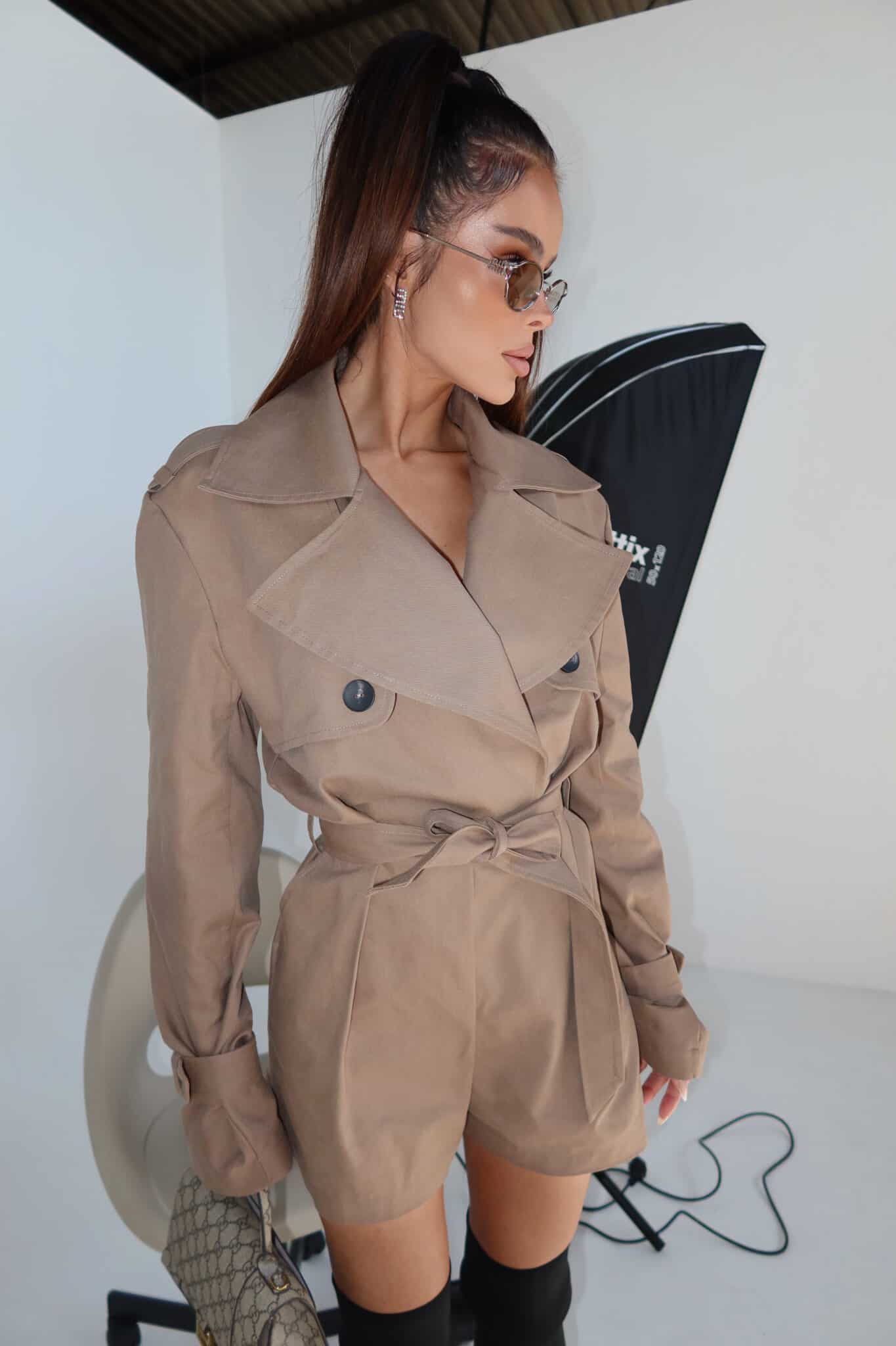 Kombinezon o kroju inspirowanym klasycznym trenczem, z wyraźnie zaznaczoną talią i szerokim kołnierzem. Dwurzędowe guziki, mankiety z patkami i naramienniki nawiązują do ponadczasowej formy, a krótkie nogawki i boczny zamek nadają mu nowoczesnego, kobiecego charakteru. Model dopełnia pasek wiązany w talii, który pozwala regulować sylwetkę. Idealny na sezon przejściowy – wystarczy dodać kozaki lub szpilki i gotowe.Skład: 50% wiskoza 50% bawełna