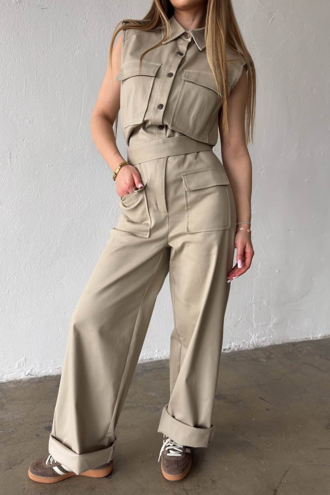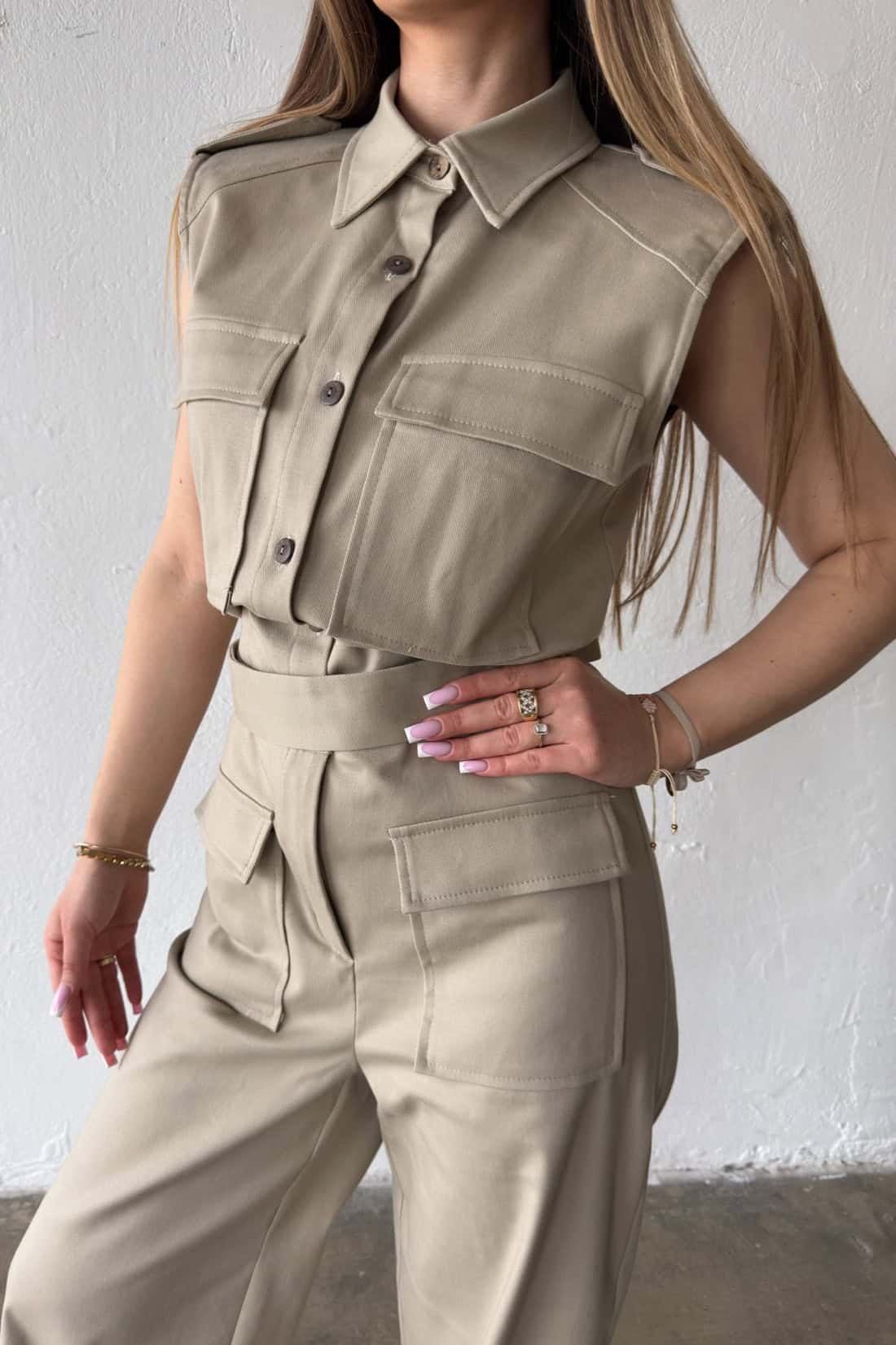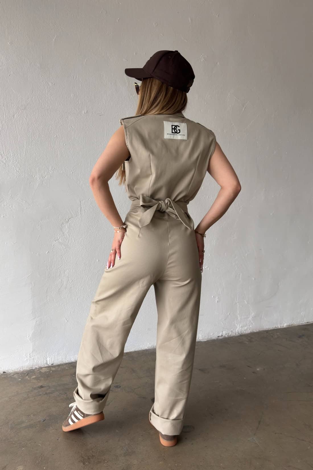 Opis produktu: Kombinezon damski BG MANGO z bawełnianego jeansu. Model zapinany na suwak oraz kokosowe guziki. Pasek w zestawie do wiązania. Prosta nogawka. Logowanie marką BG na plecach. Poduszki w ramionach. Model kombinezonu świetnie sprawdzi się do casualowych oraz eleganckich stylizacji.