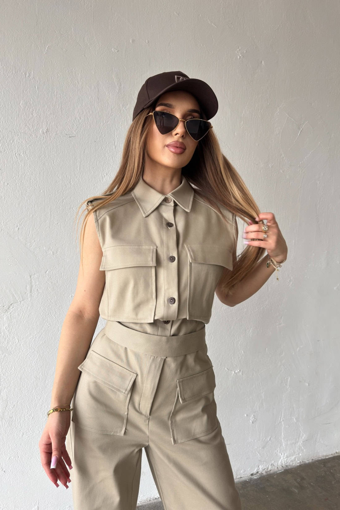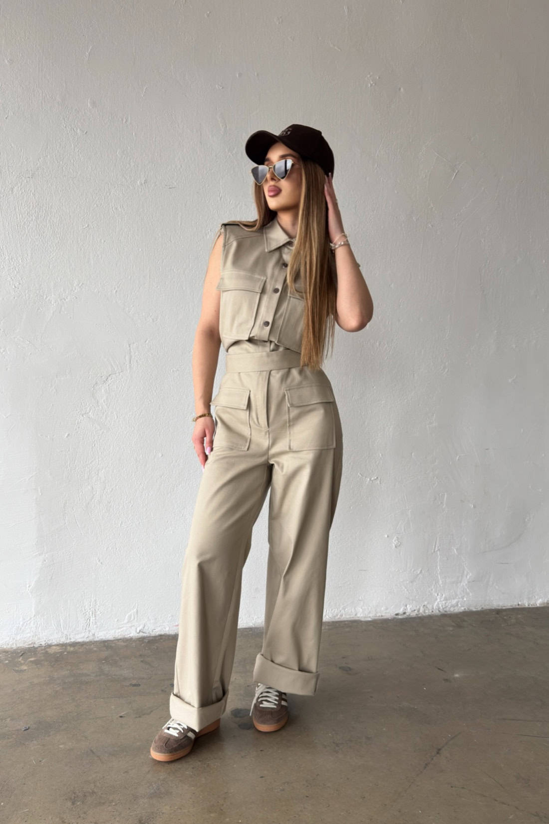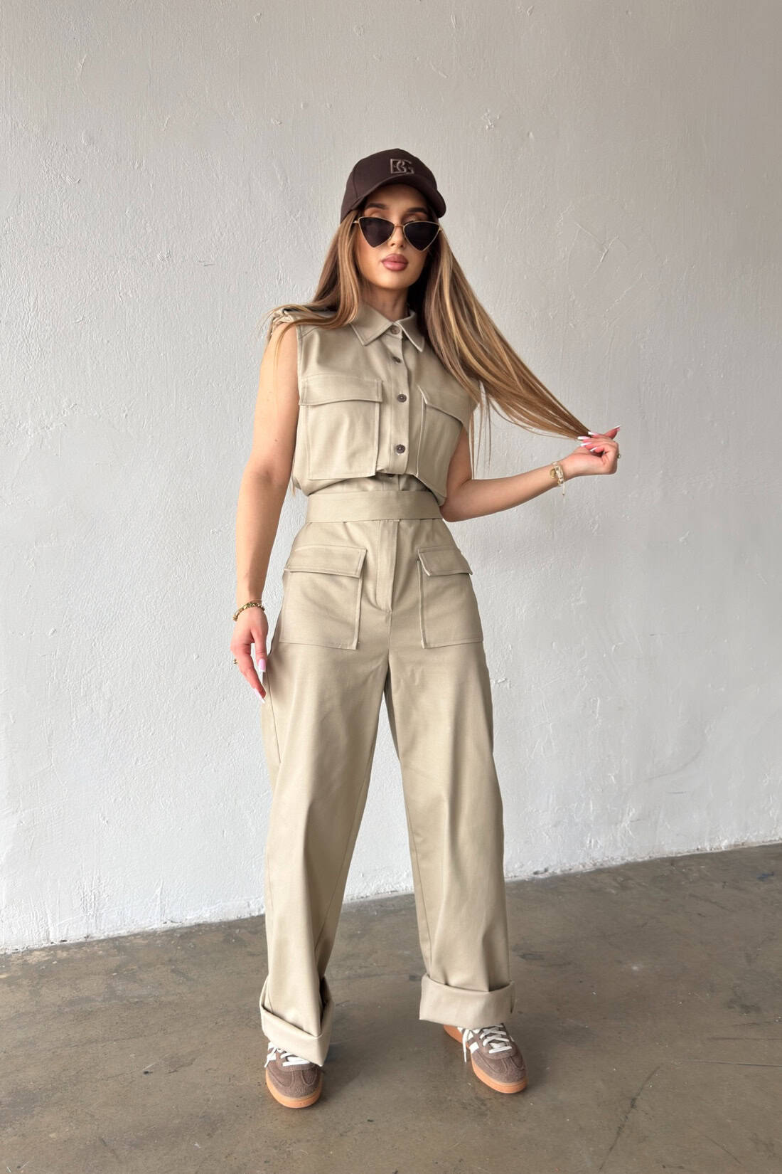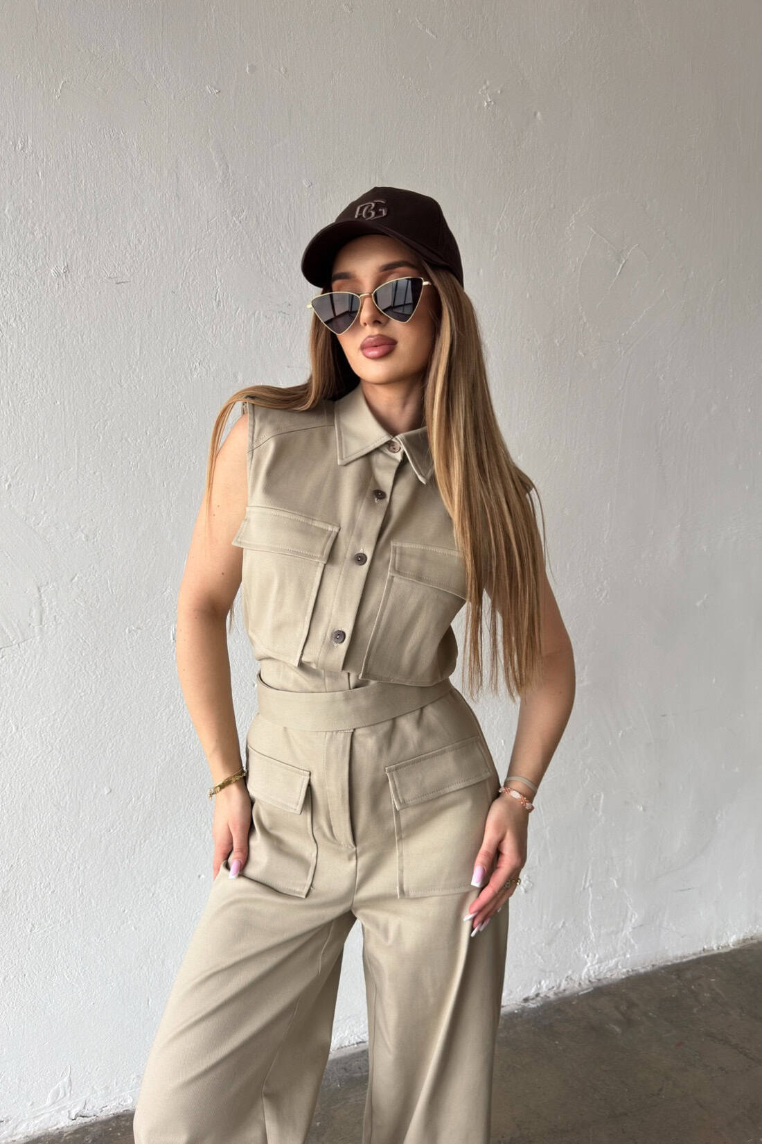 Opis produktu: Kombinezon damski BG MANGO z bawełnianego jeansu. Model zapinany na suwak oraz kokosowe guziki. Pasek w zestawie do wiązania. Prosta nogawka. Logowanie marką BG na plecach. Poduszki w ramionach. Model kombinezonu świetnie sprawdzi się do casualowych oraz eleganckich stylizacji.