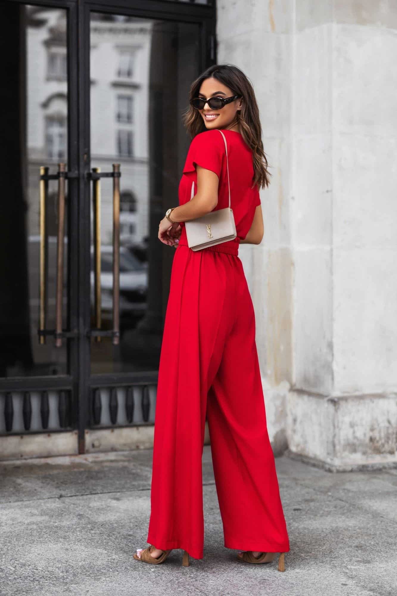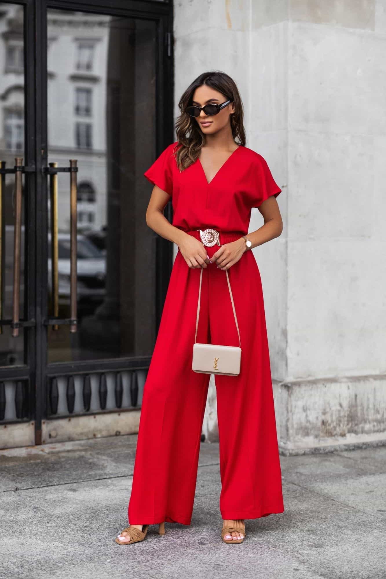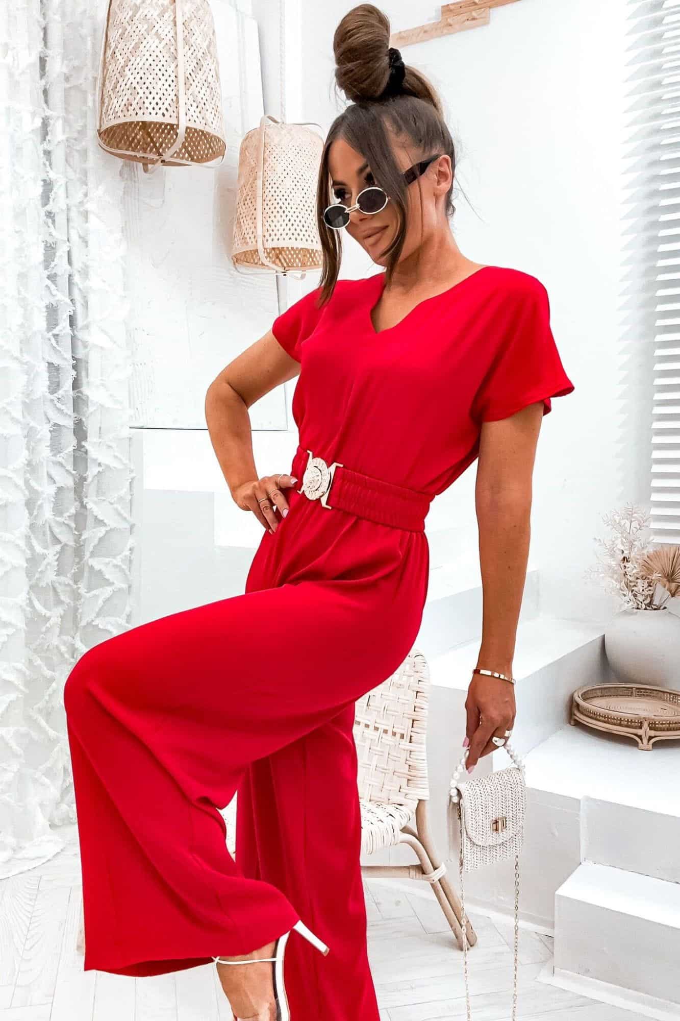 Kombinezon damski Hanna z szerokimi nogawkami złoty pasek czerwony