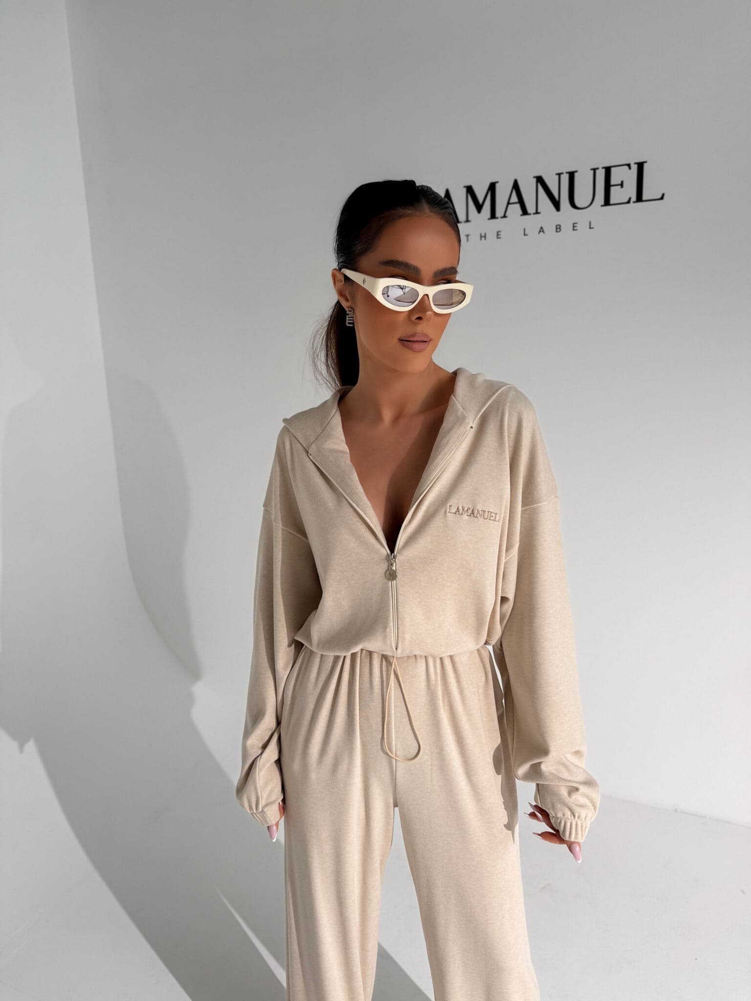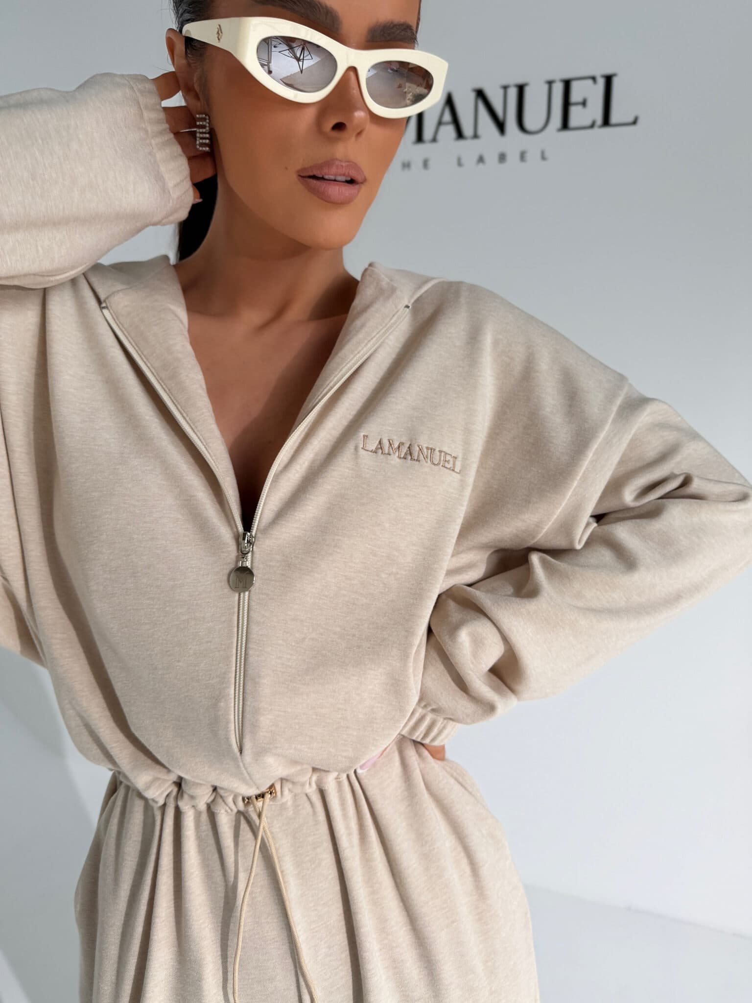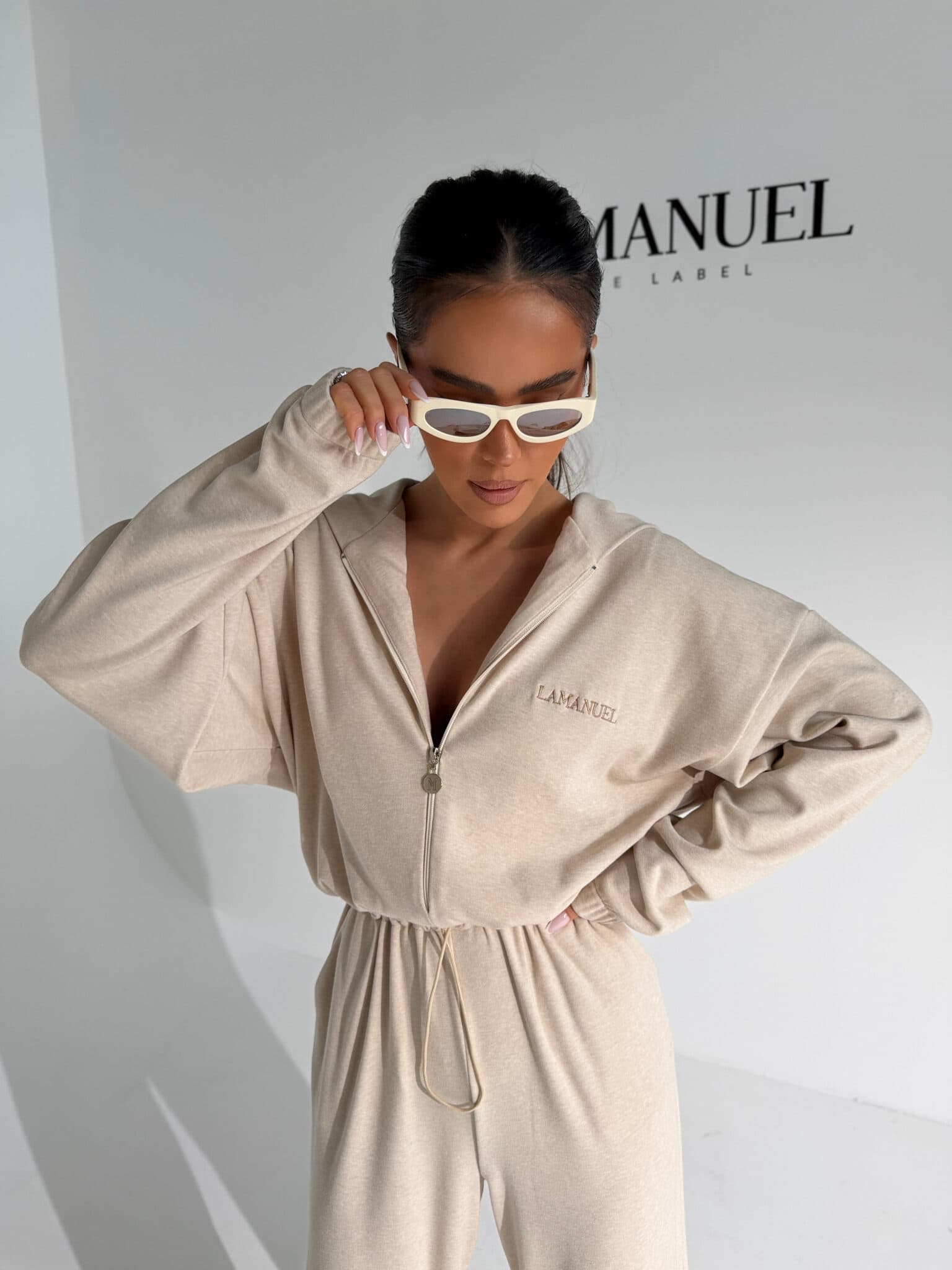 Kombinezon z przyjemnego w dotyku rayonu o lejącej, cięższej strukturze, która pięknie układa się na sylwetce i dodaje całości premium charakteru. Góra zapinana na suwak, z kapturem i długim rękawem zakończonym gumką. W talii elastyczny gumosznurek z możliwością regulacji, który podkreśla proporcje i pozwala dopasować fason do figury. Z przodu i z tyłu wyhaftowane logo lamanuel – subtelne, ale wyraziste. Świetna propozycja dla klientek szukających komfortu w dopracowanej, nowoczesnej formie.Skład: 45% rayon 28% nylon 22% poliester 5% spandex