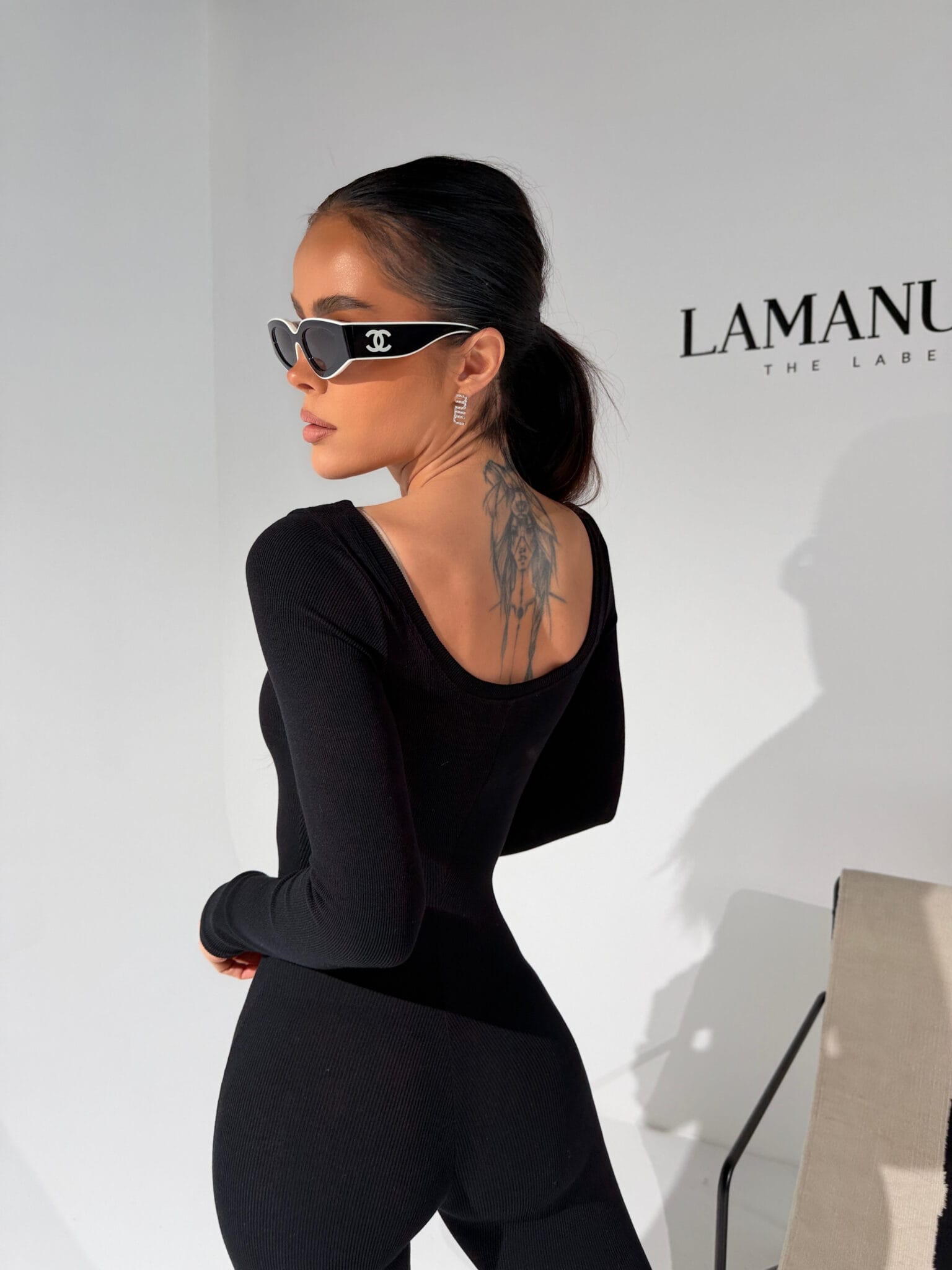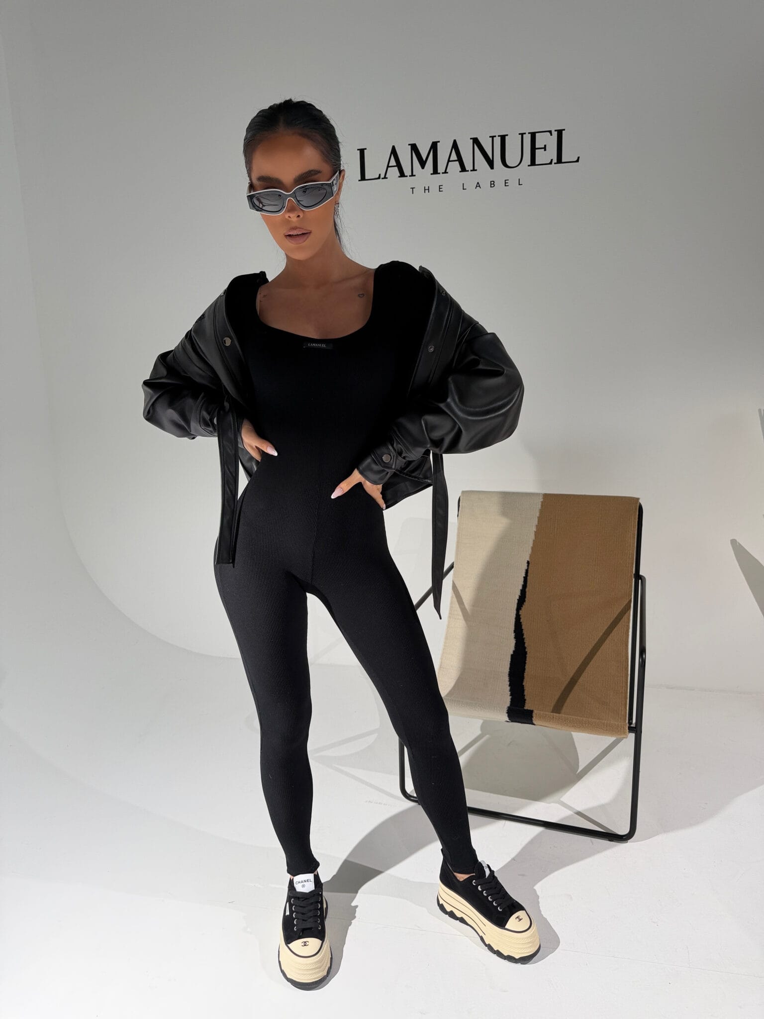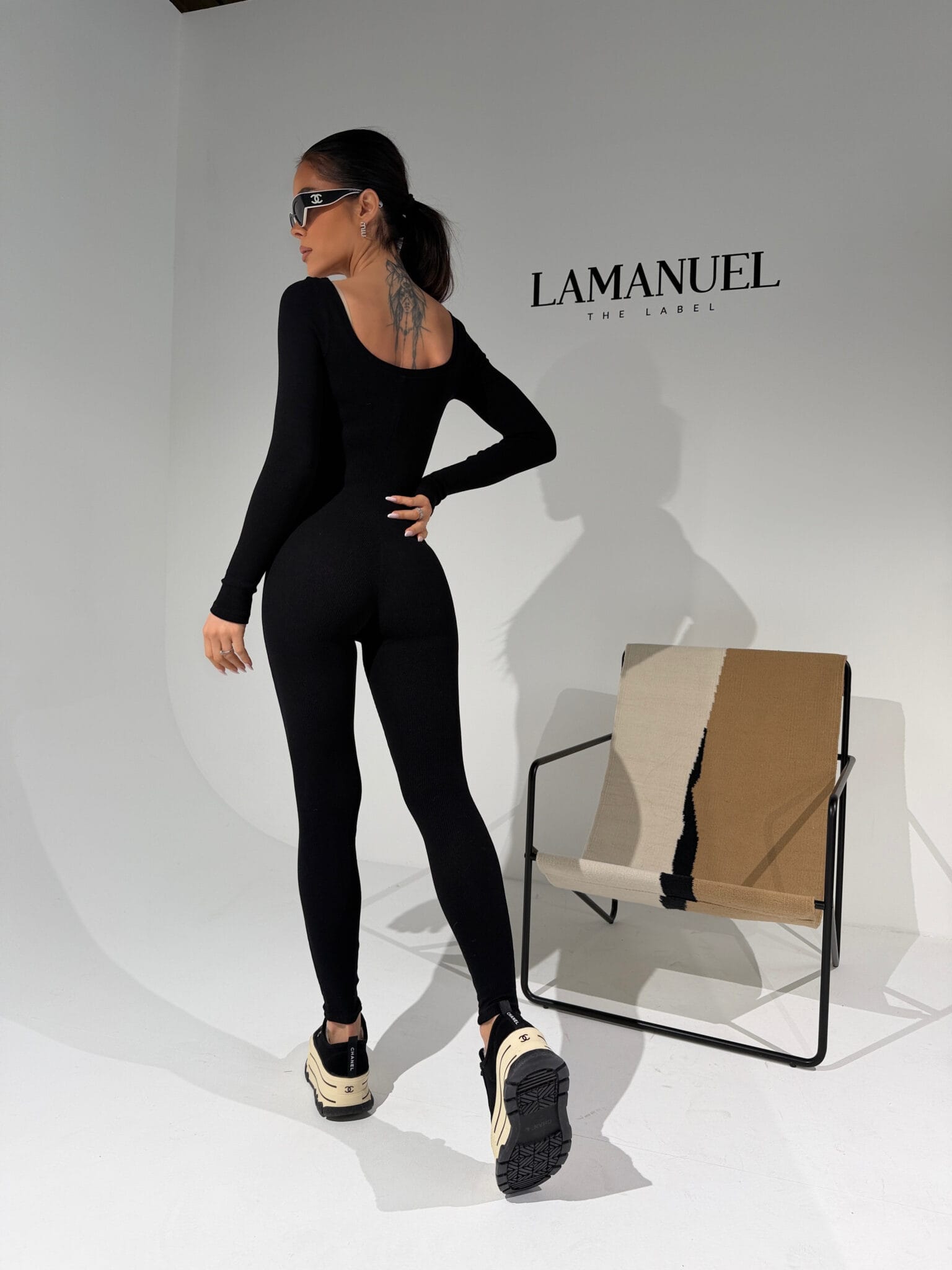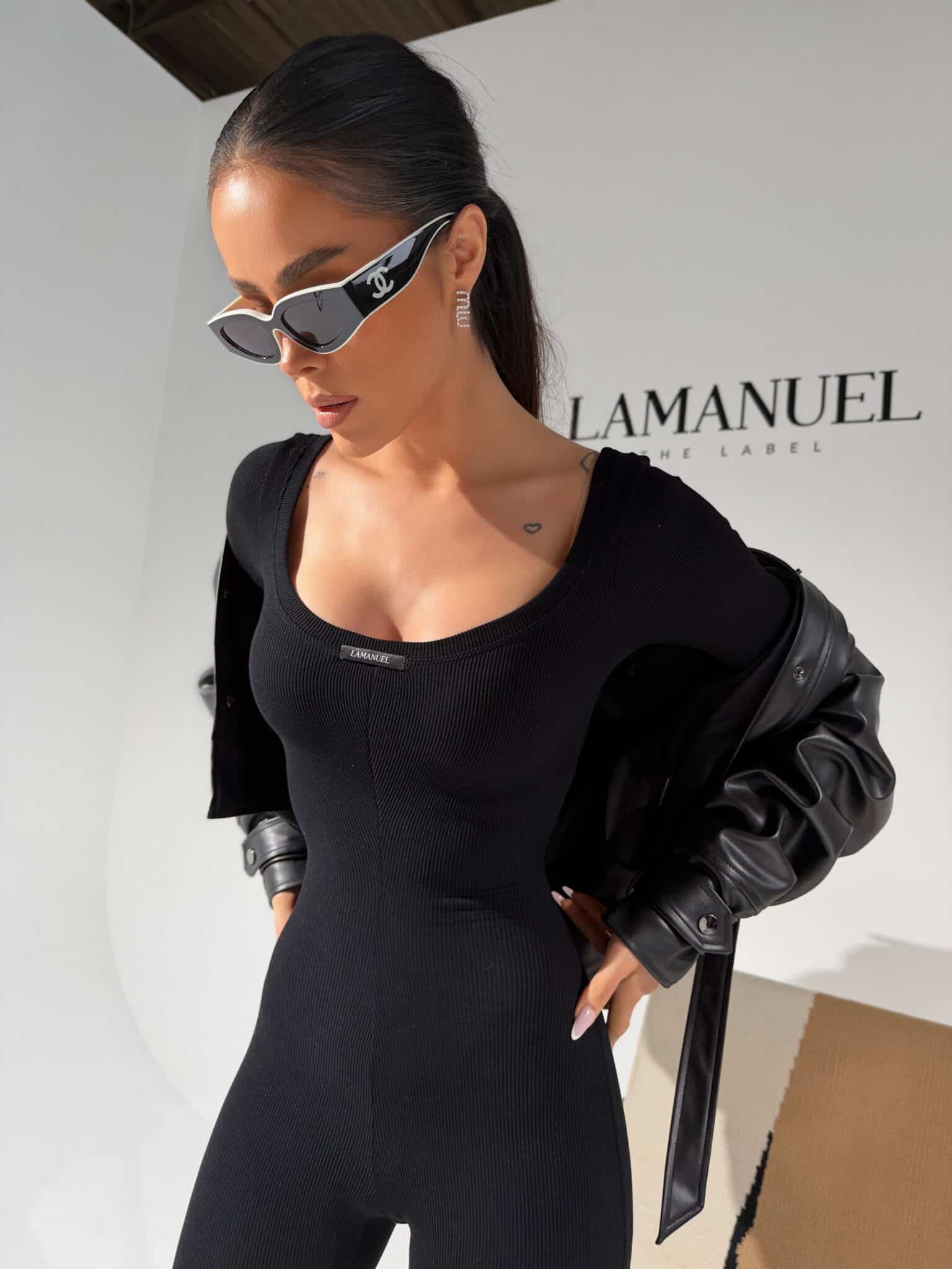 Kombinezon z prążkowanej dzianiny, która perfekcyjnie dopasowuje się do sylwetki i zapewnia maksymalną elastyczność. Długie rękawy, głęboki dekolt z przodu i z tyłu oraz przedłużony krój nogawki podkreślają proporcje i wydłużają optycznie ciało. Materiał jest miękki, wygodny i świetnie układa się na każdej figurze. Na przodzie subtelna metka lamanuel. Idealny do noszenia solo lub w zestawie z oversize’ową marynarką czy sportową kurtką – kobieco, nowocześnie i bez wysiłku.Skład: 95% bawełna 5% elastan