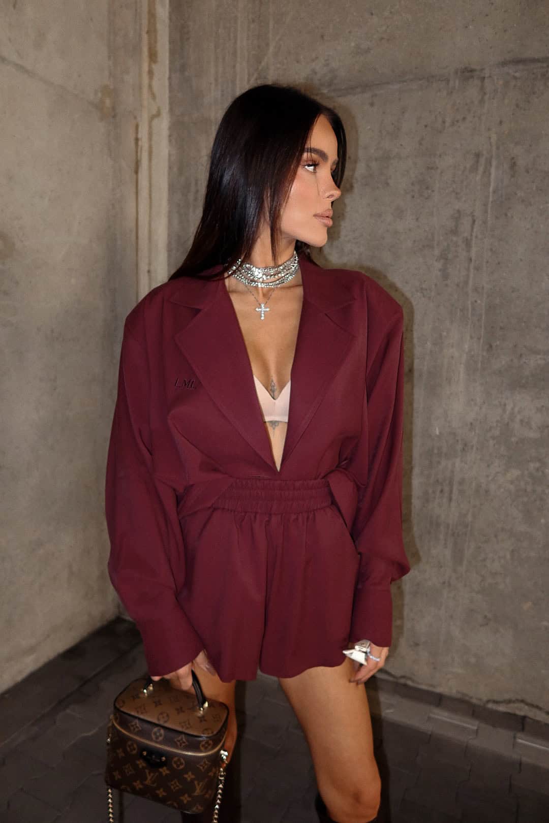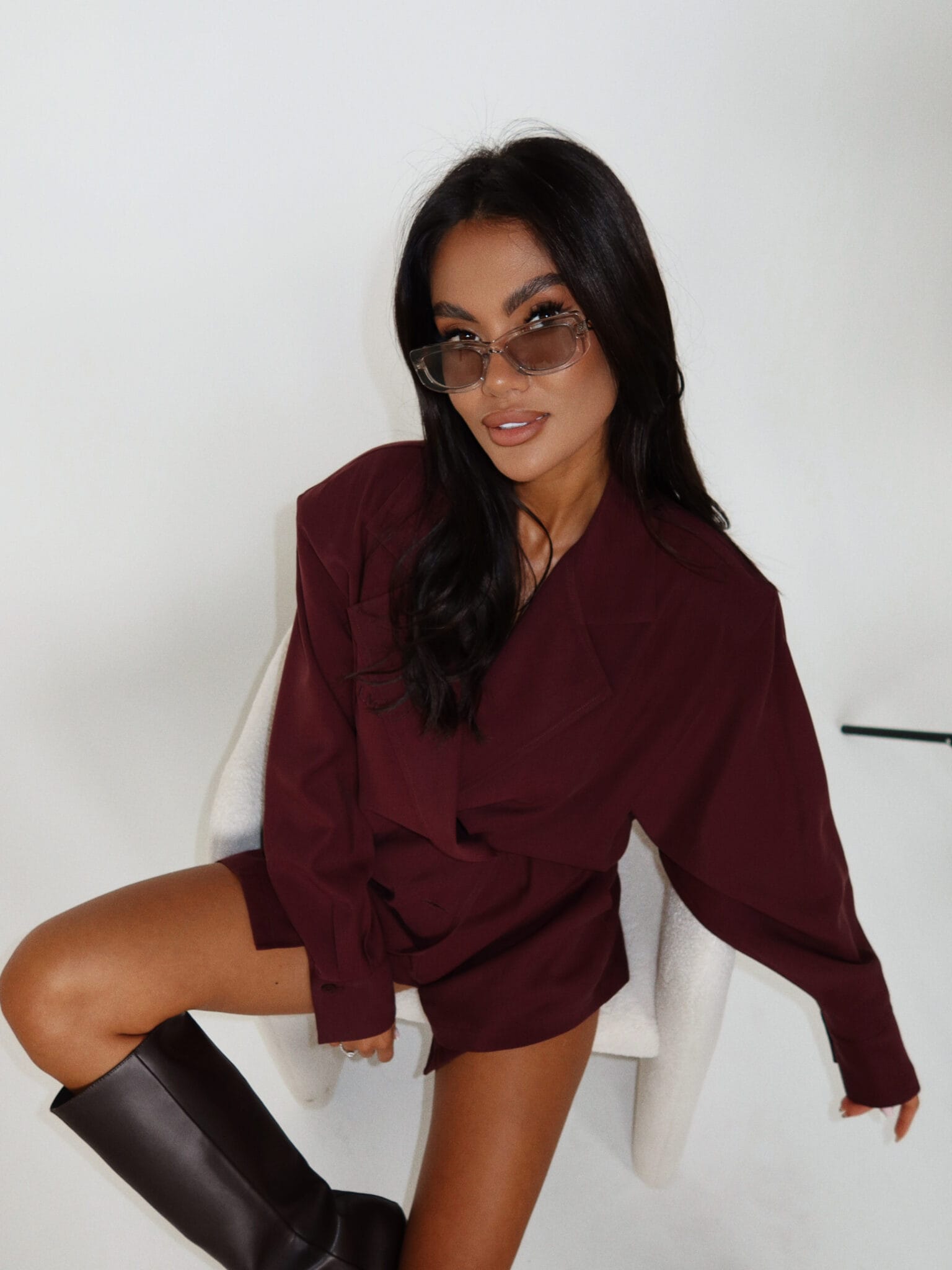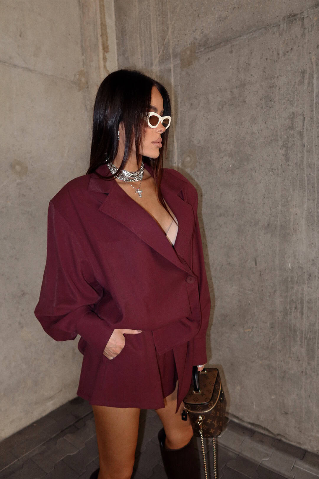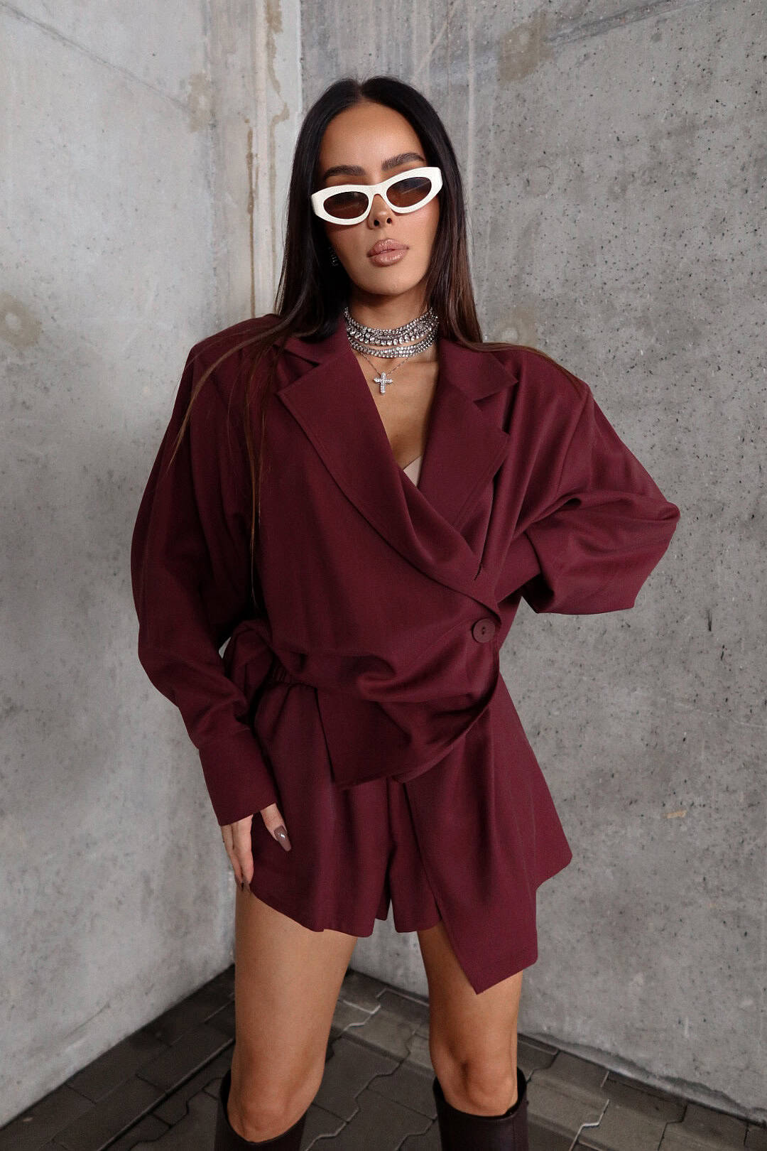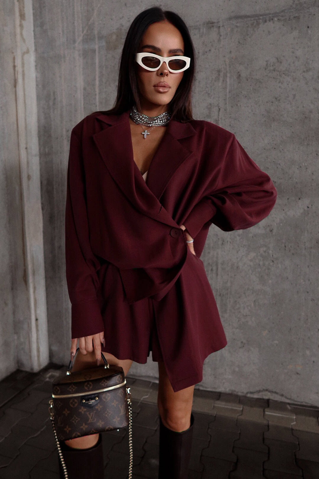 Ten komplet to esencja miejskiej elegancji z modowym pazurem. Oversize’owa koszulo-marynarka z mocno zarysowanymi ramionami została wyposażona w niestandardowe rozmieszczenie guzików, które pozwala Ci bawić się formą – możesz nosić ją luźno rozpiętą, klasycznie zapinaną na środku, albo nonszalancko na skos, tworząc efekt asymetrycznego taliowania. Do tego krótkie spodenki z wysokim stanem, które pięknie podkreślają talię i równoważą objętość góry.Skład: 90% rayon 10% poliester