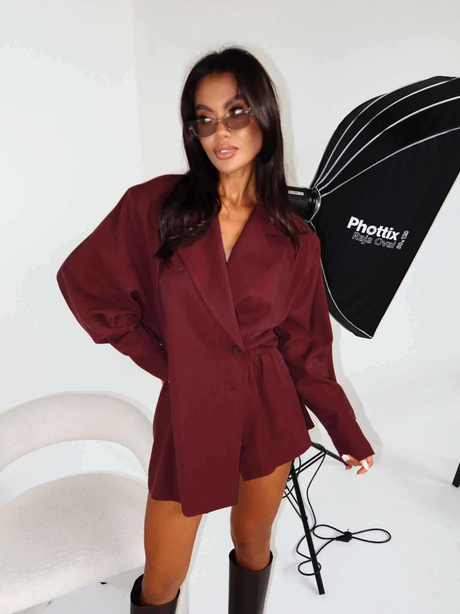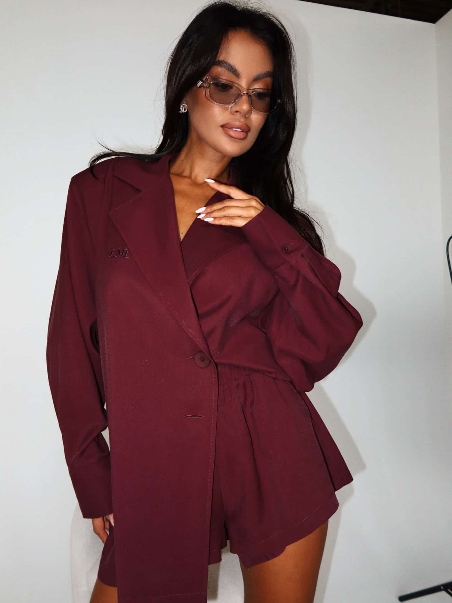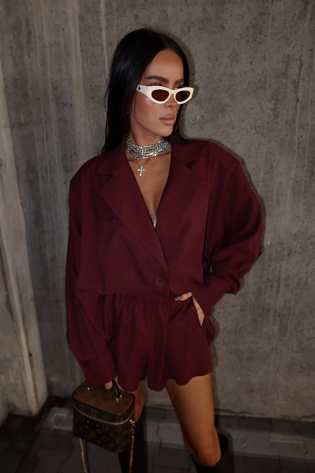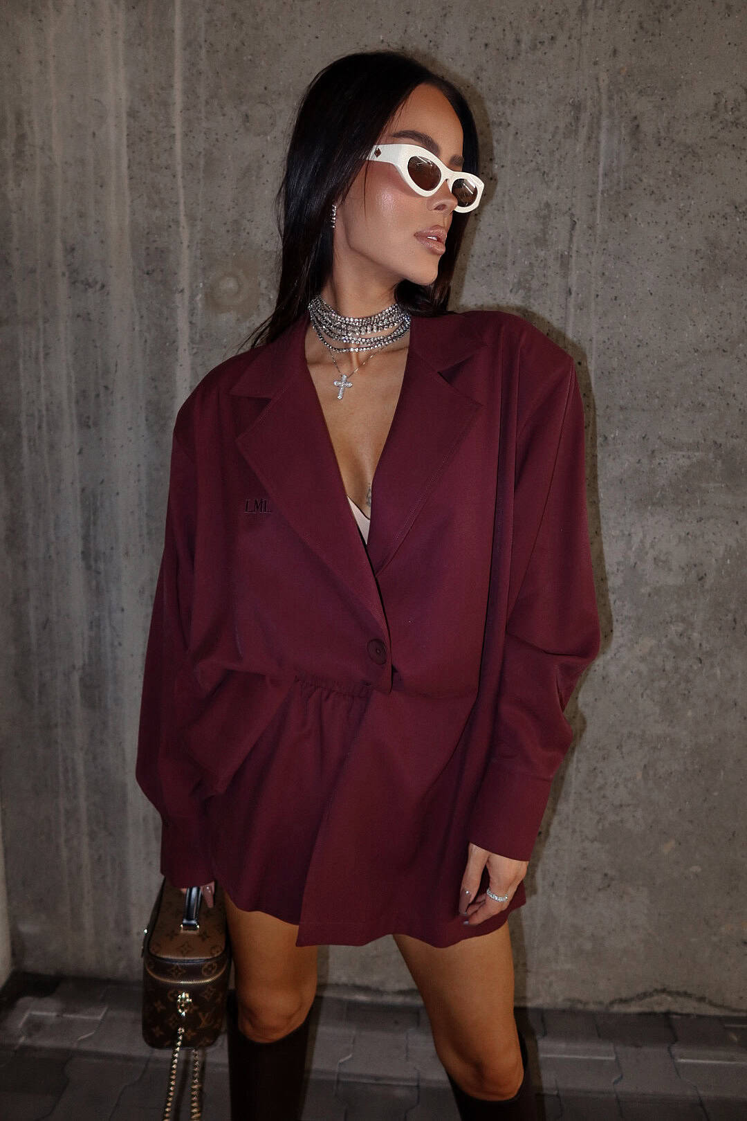 Ten komplet to esencja miejskiej elegancji z modowym pazurem. Oversize’owa koszulo-marynarka z mocno zarysowanymi ramionami została wyposażona w niestandardowe rozmieszczenie guzików, które pozwala Ci bawić się formą – możesz nosić ją luźno rozpiętą, klasycznie zapinaną na środku, albo nonszalancko na skos, tworząc efekt asymetrycznego taliowania. Do tego krótkie spodenki z wysokim stanem, które pięknie podkreślają talię i równoważą objętość góry.Skład: 90% rayon 10% poliester