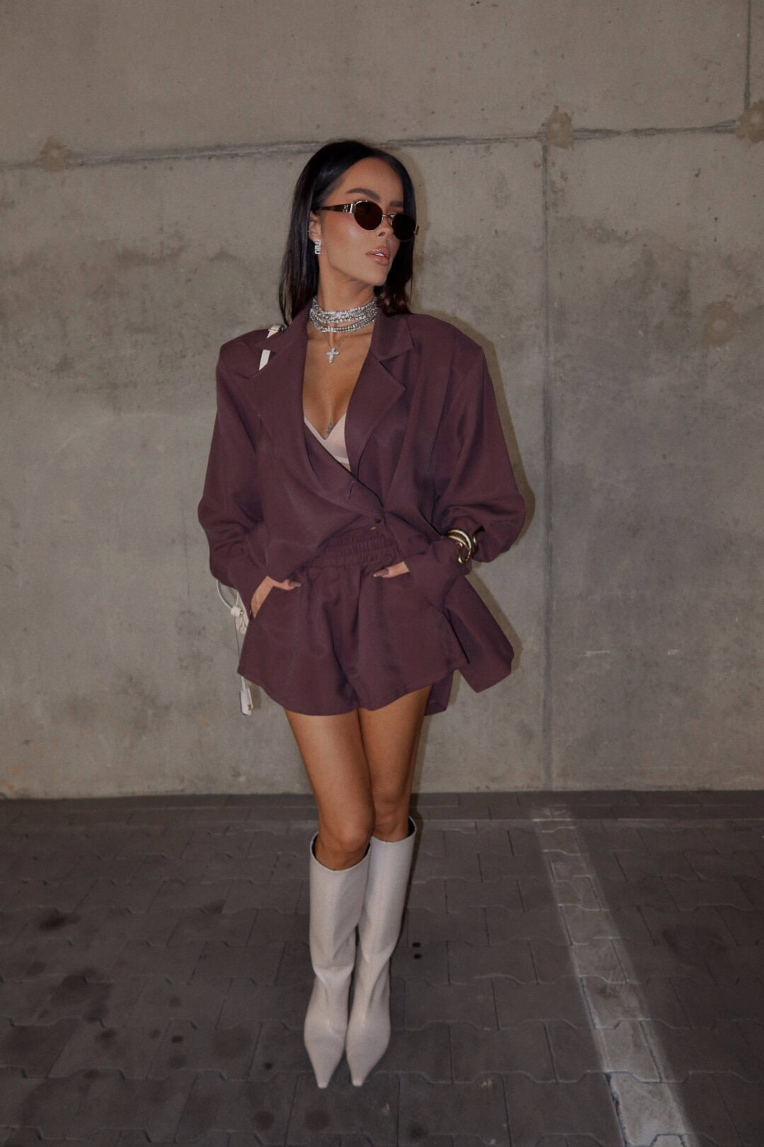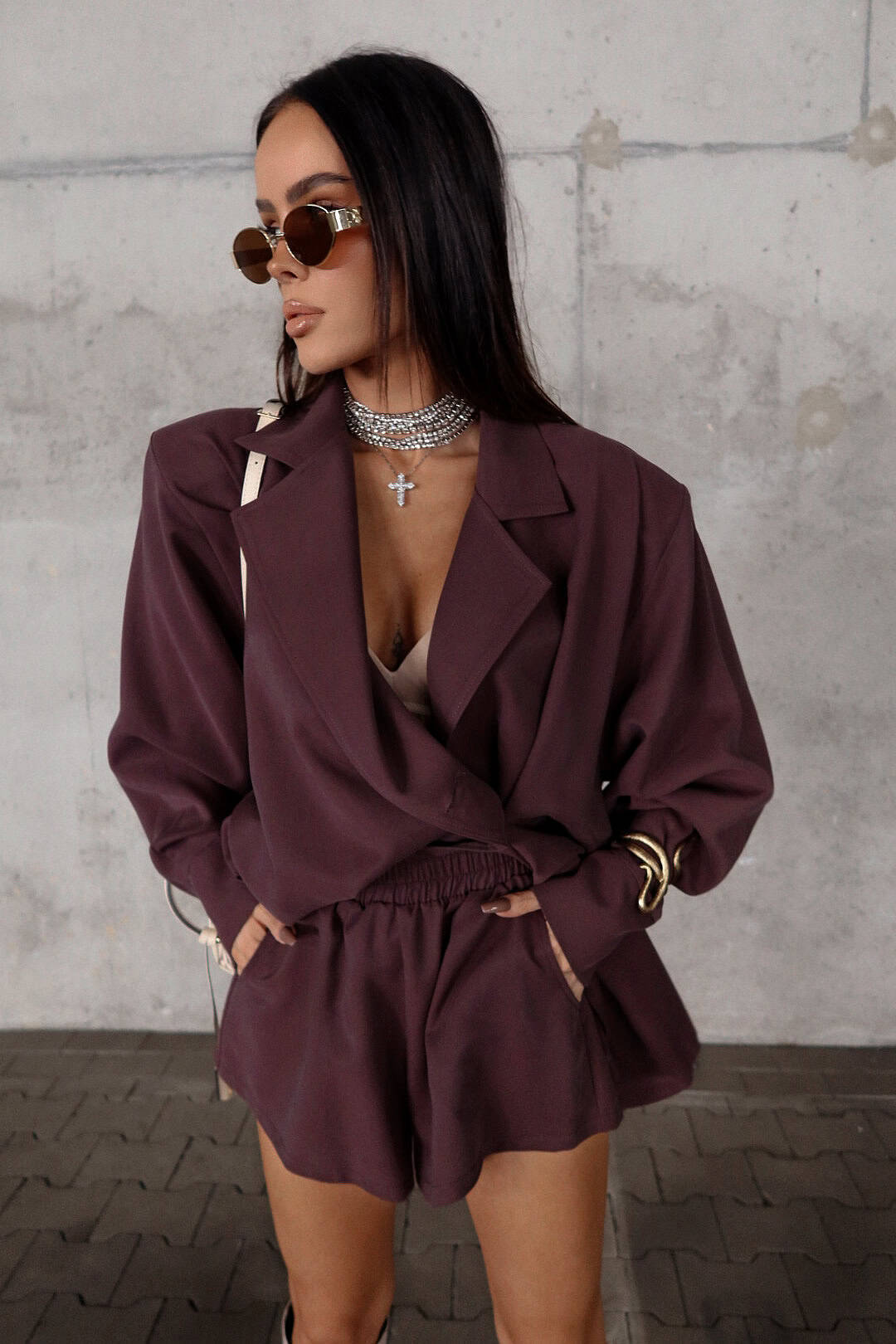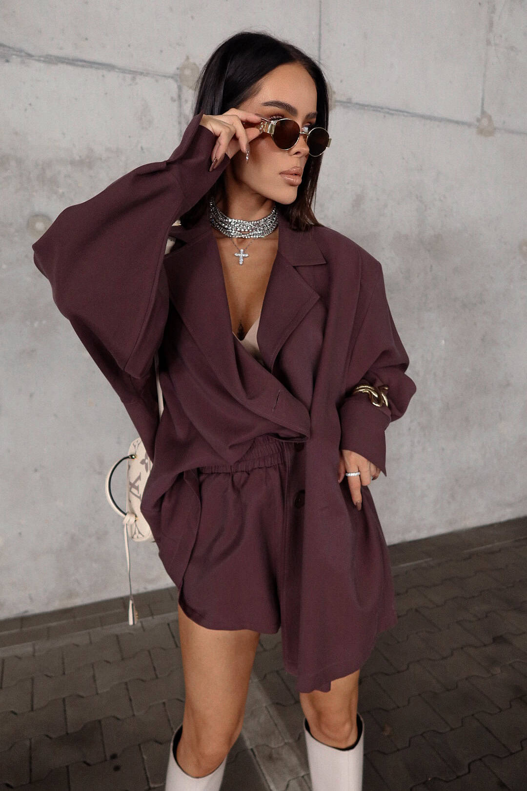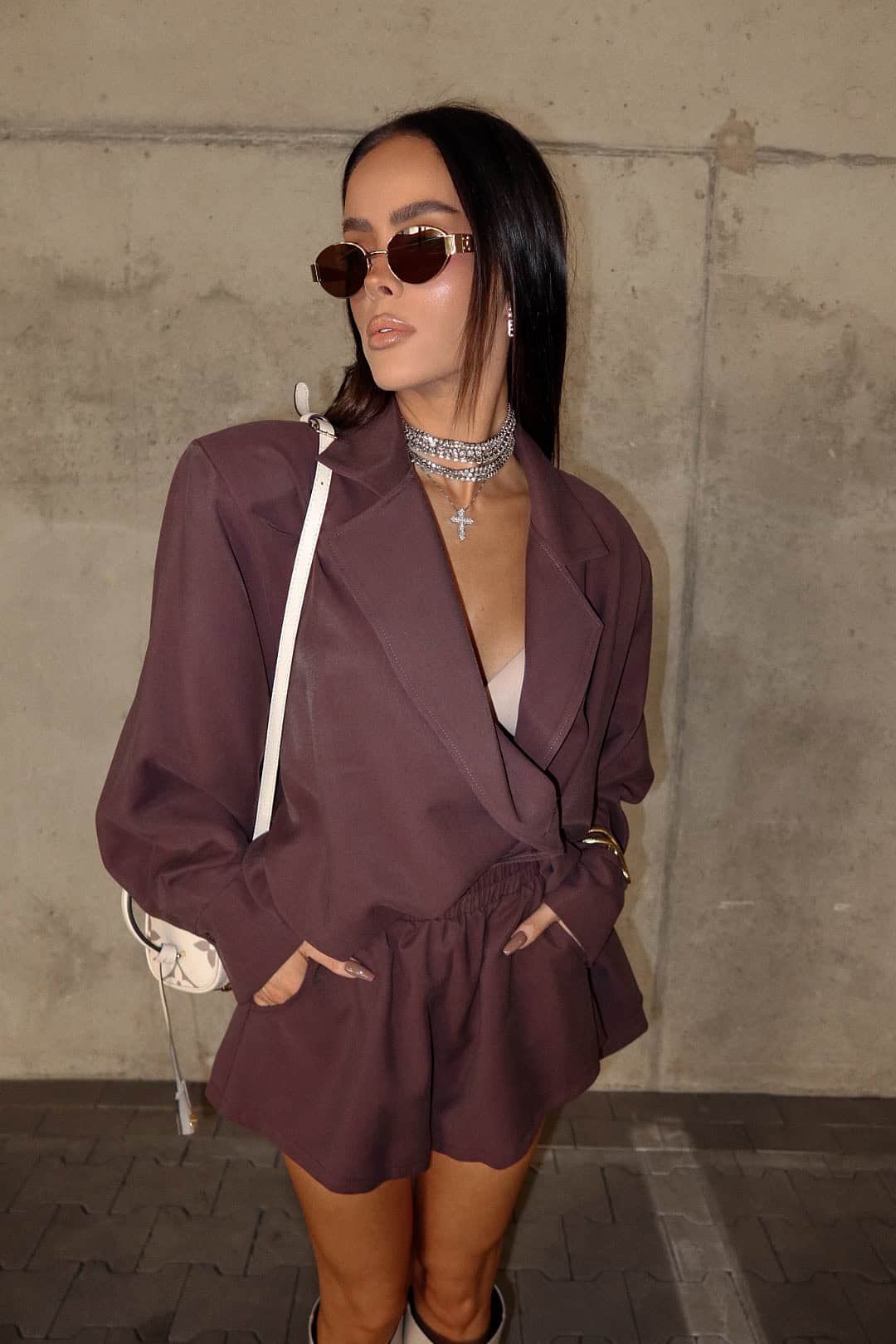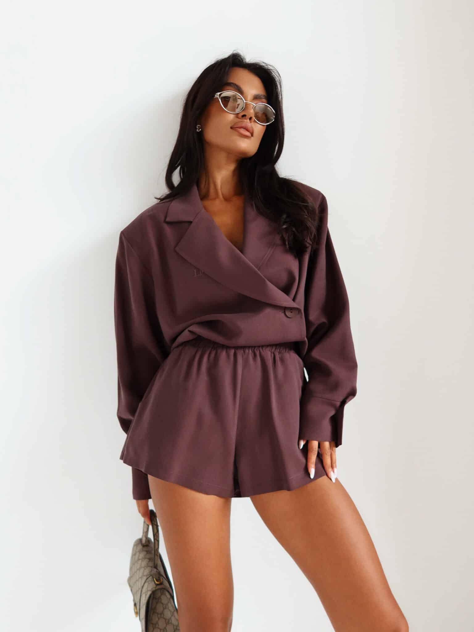 Ten komplet to esencja miejskiej elegancji z modowym pazurem. Oversize’owa koszulo-marynarka z mocno zarysowanymi ramionami została wyposażona w niestandardowe rozmieszczenie guzików, które pozwala Ci bawić się formą – możesz nosić ją luźno rozpiętą, klasycznie zapinaną na środku, albo nonszalancko na skos, tworząc efekt asymetrycznego taliowania. Do tego krótkie spodenki z wysokim stanem, które pięknie podkreślają talię i równoważą objętość góry.Skład: 90% rayon 10% poliester