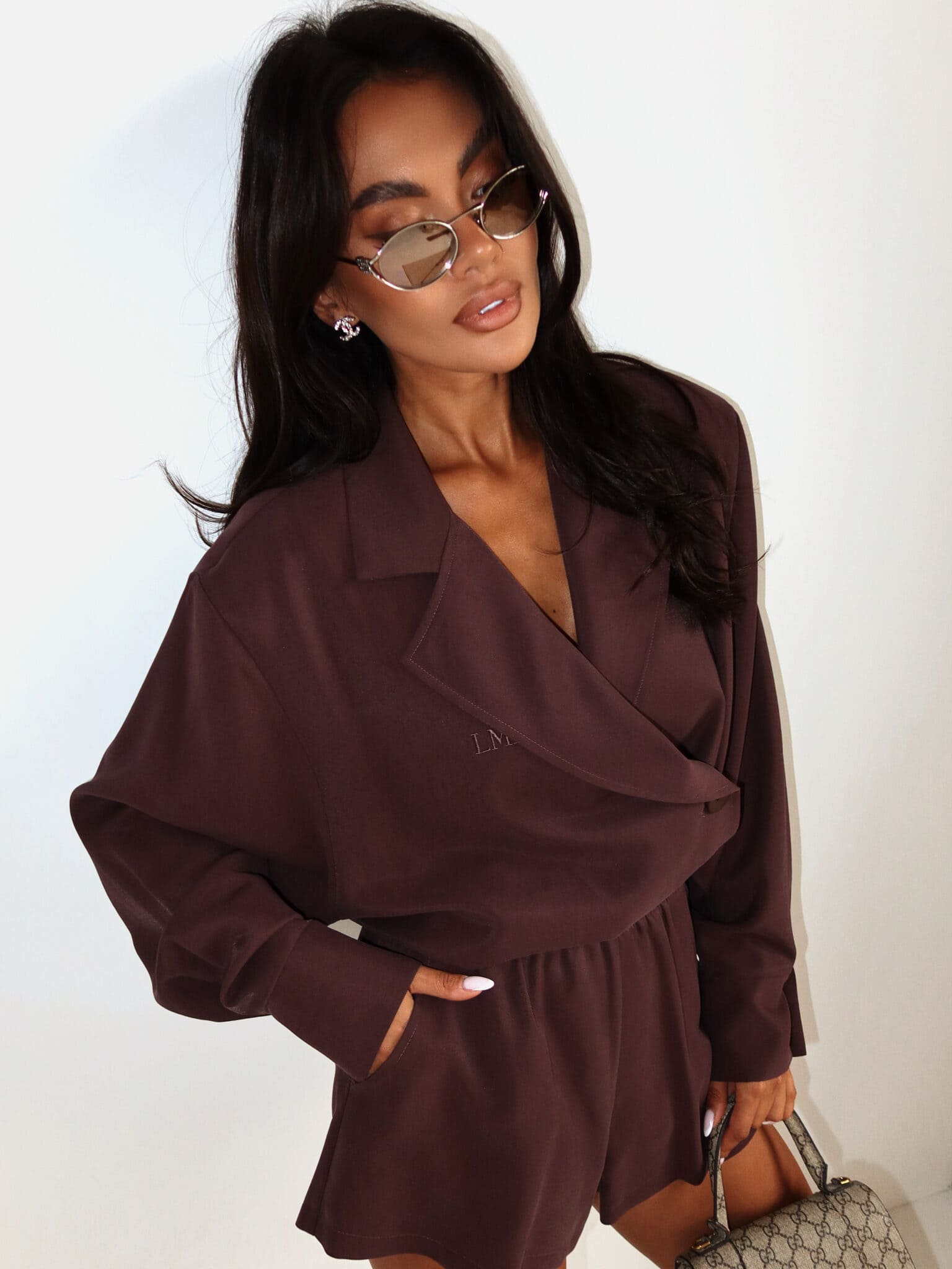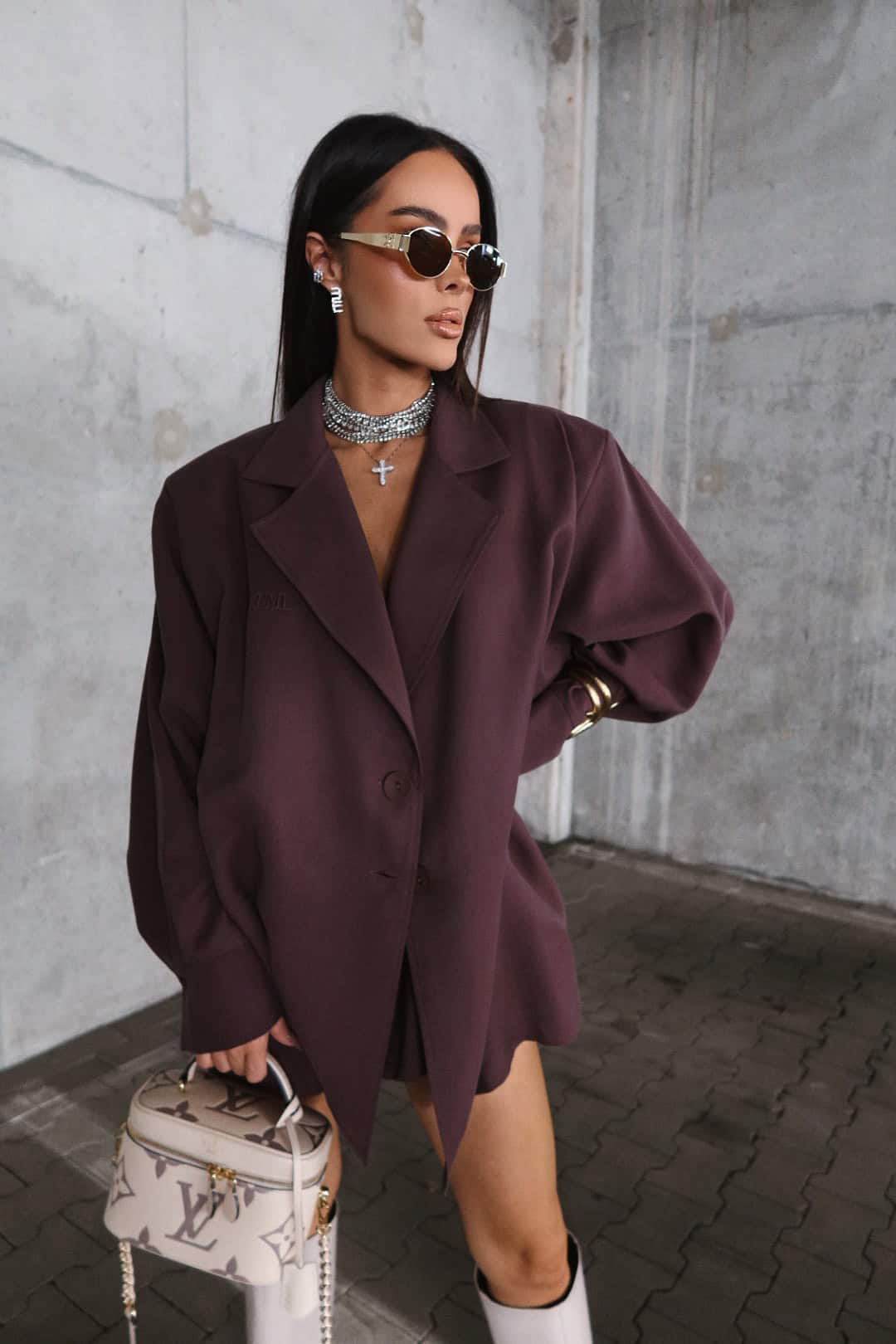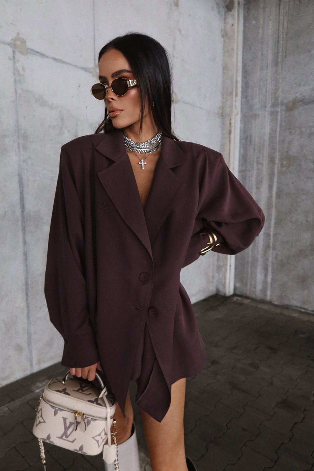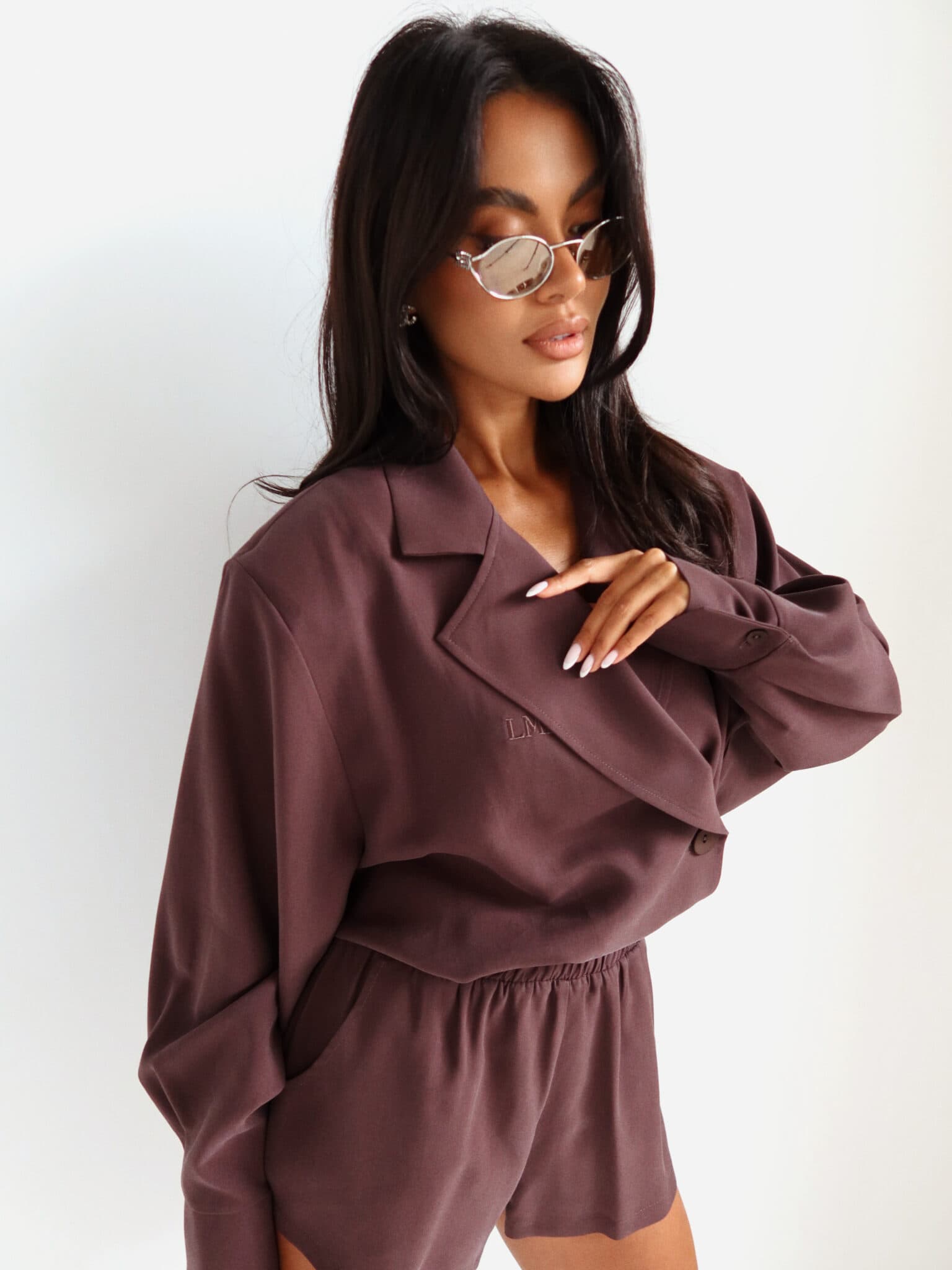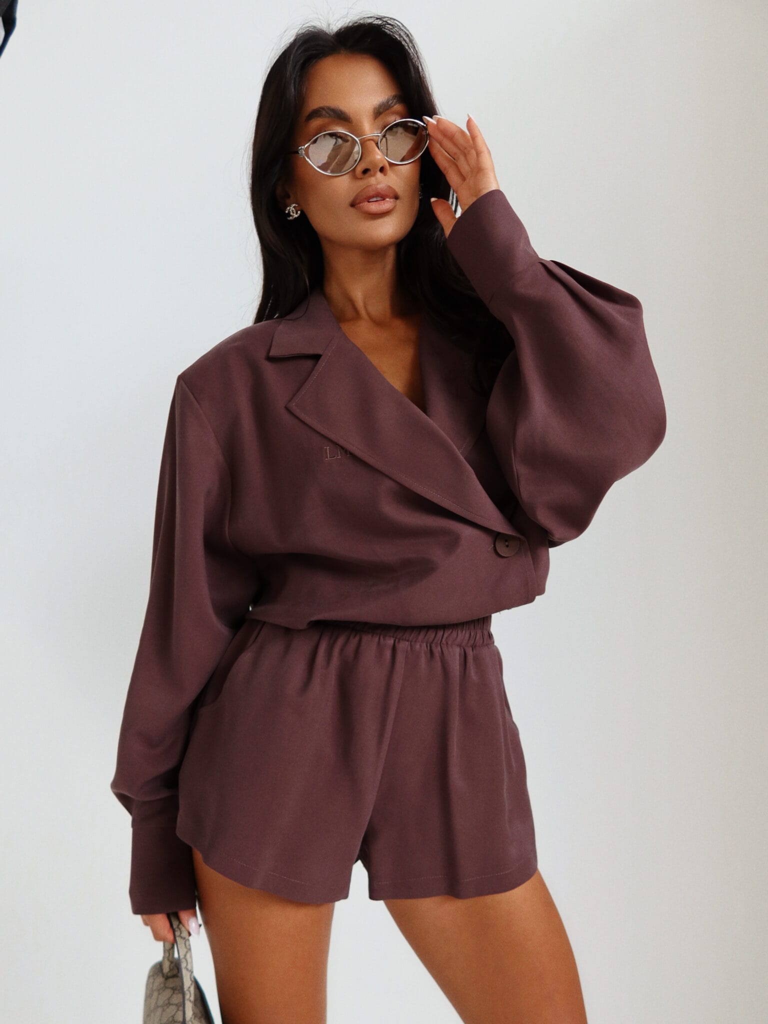 Ten komplet to esencja miejskiej elegancji z modowym pazurem. Oversize’owa koszulo-marynarka z mocno zarysowanymi ramionami została wyposażona w niestandardowe rozmieszczenie guzików, które pozwala Ci bawić się formą – możesz nosić ją luźno rozpiętą, klasycznie zapinaną na środku, albo nonszalancko na skos, tworząc efekt asymetrycznego taliowania. Do tego krótkie spodenki z wysokim stanem, które pięknie podkreślają talię i równoważą objętość góry.Skład: 90% rayon 10% poliester