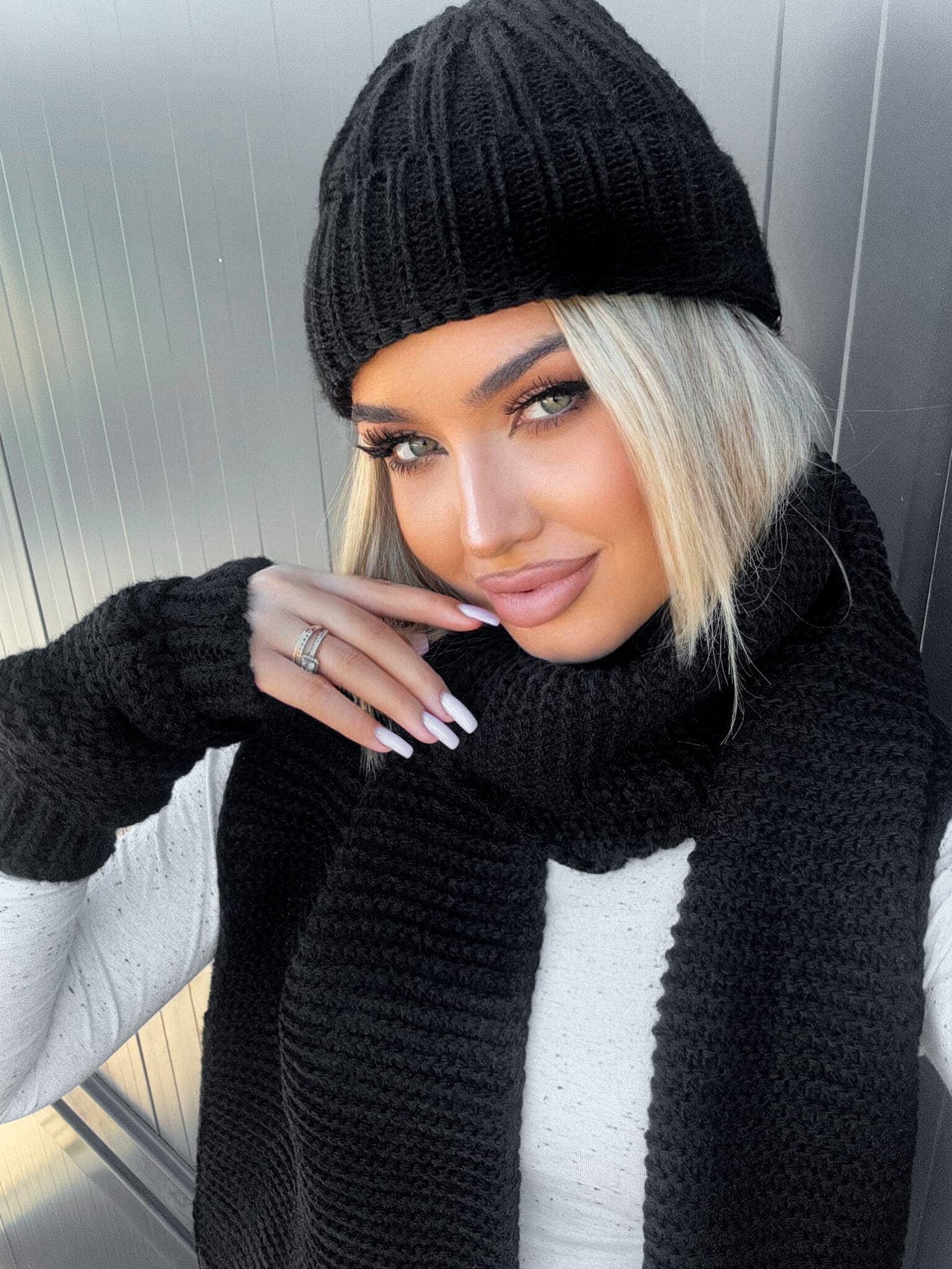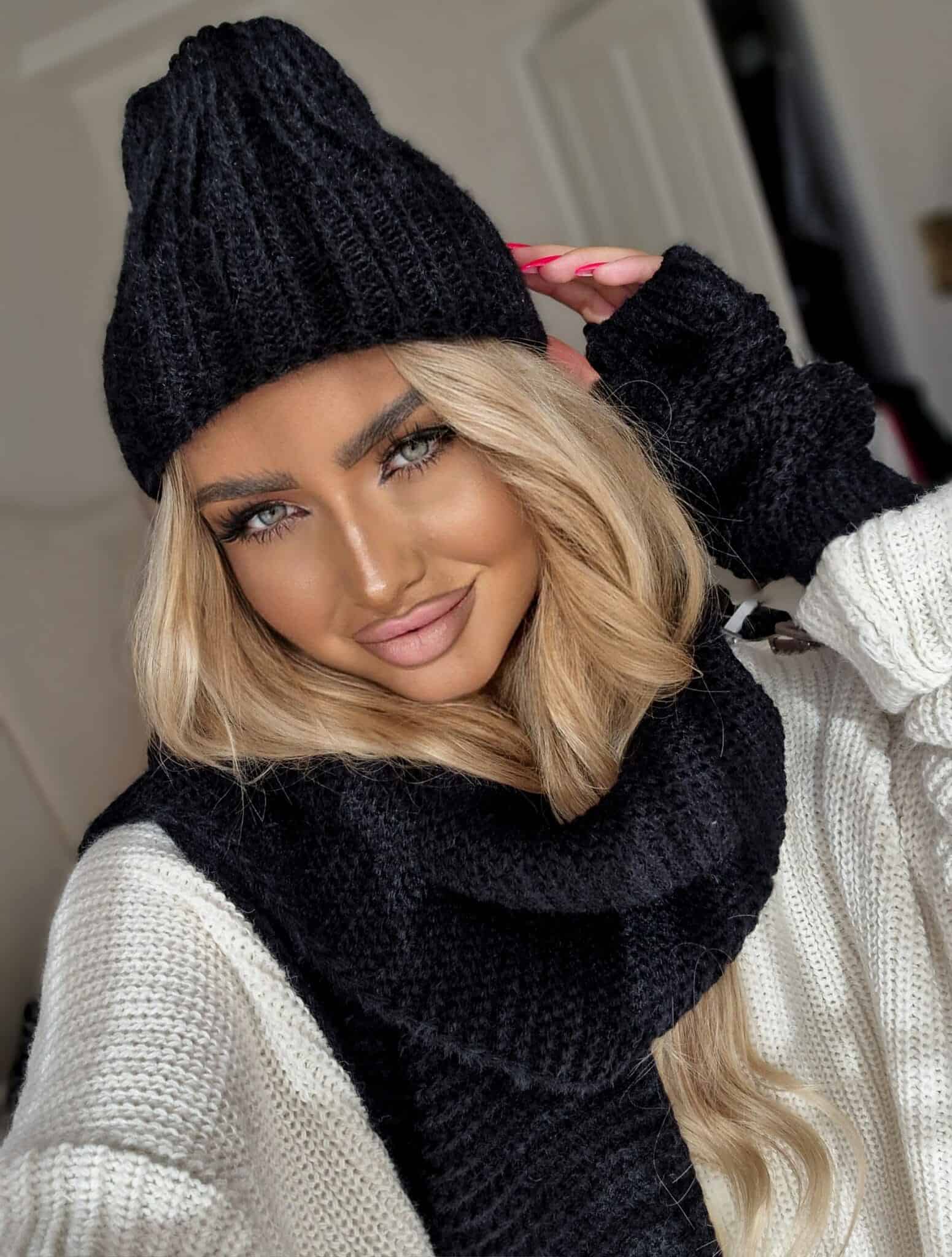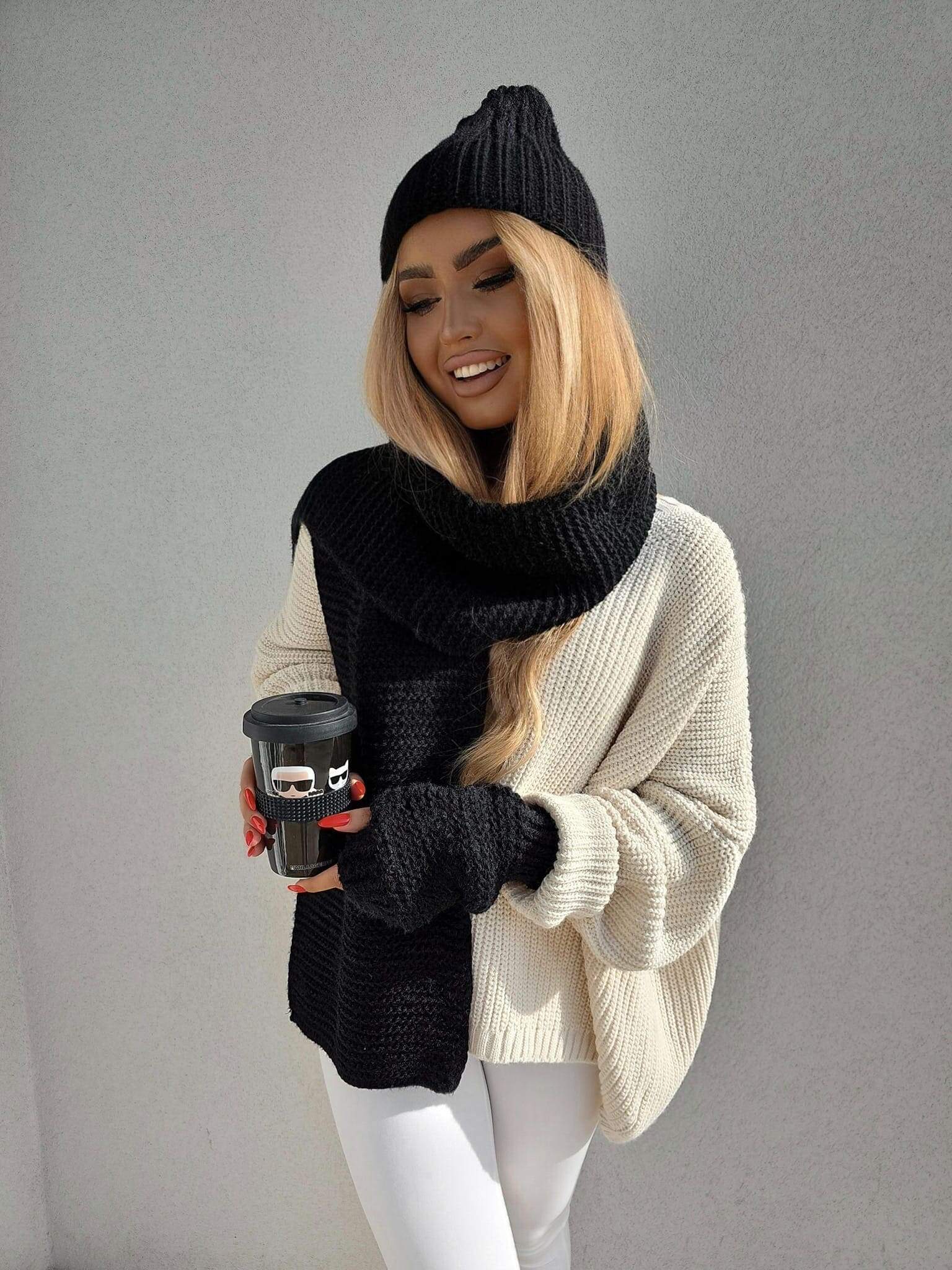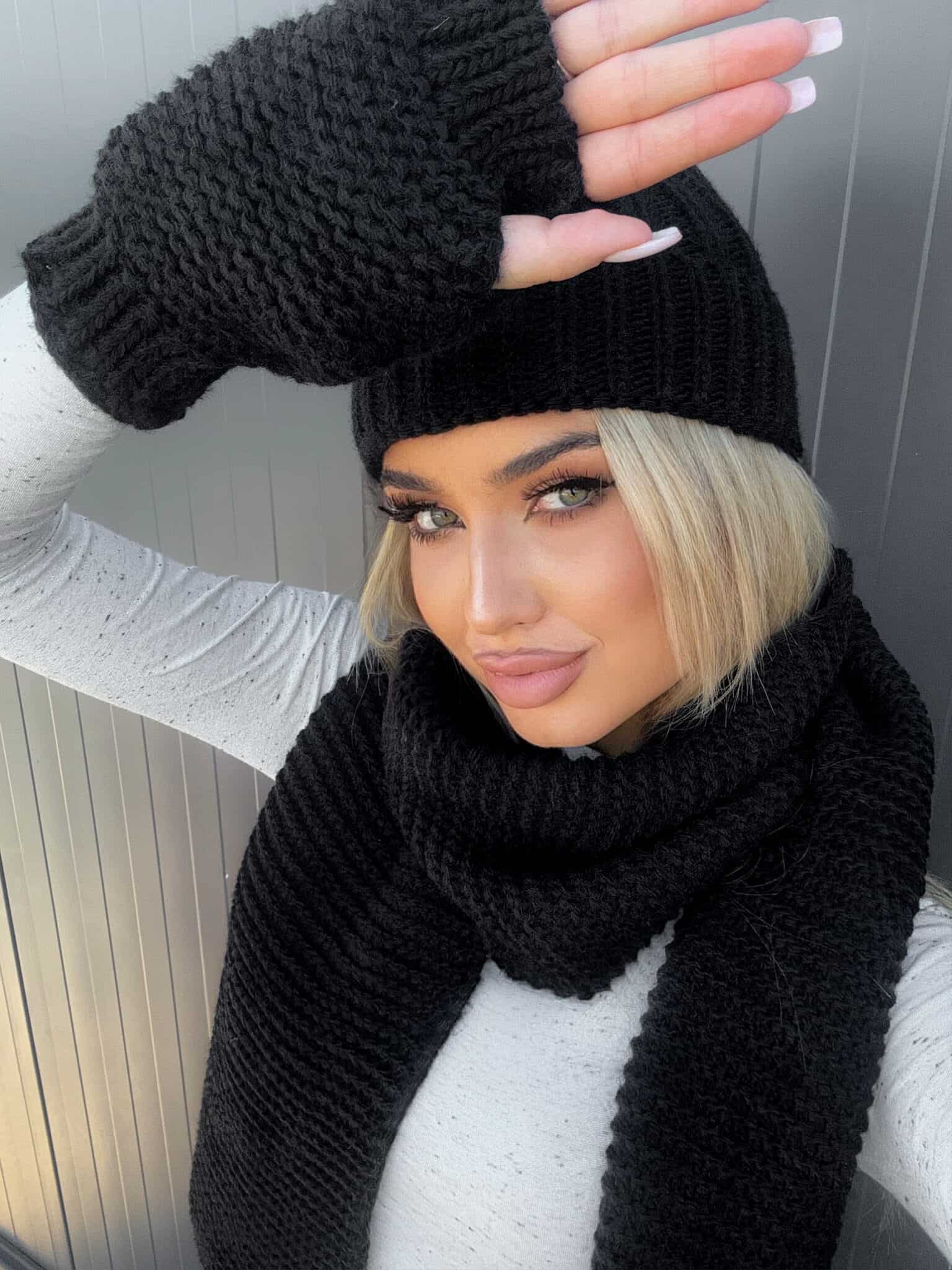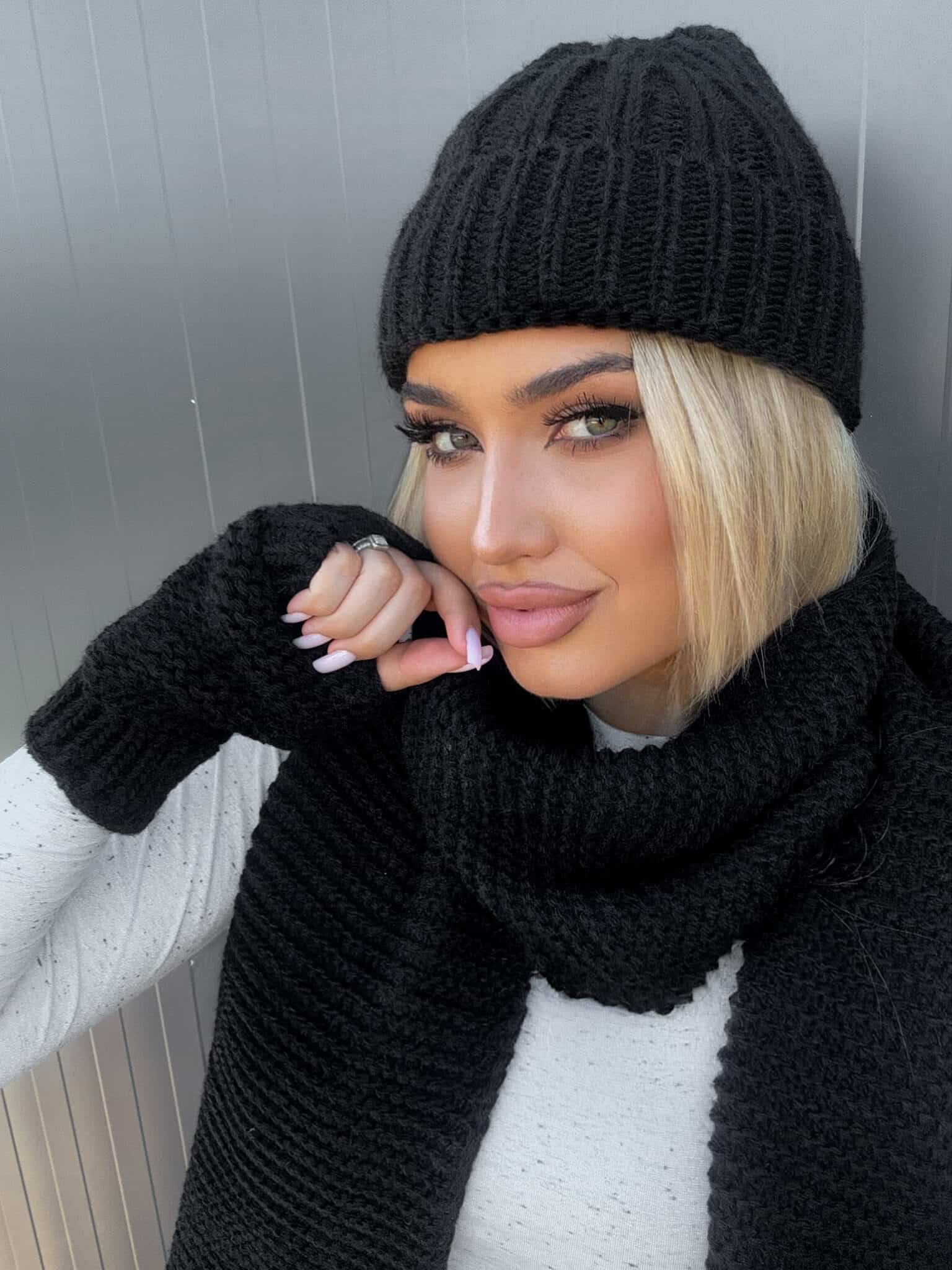 Komplet Alaska składający się z ciepłej czapki, szalika i rękawiczek bez palców.