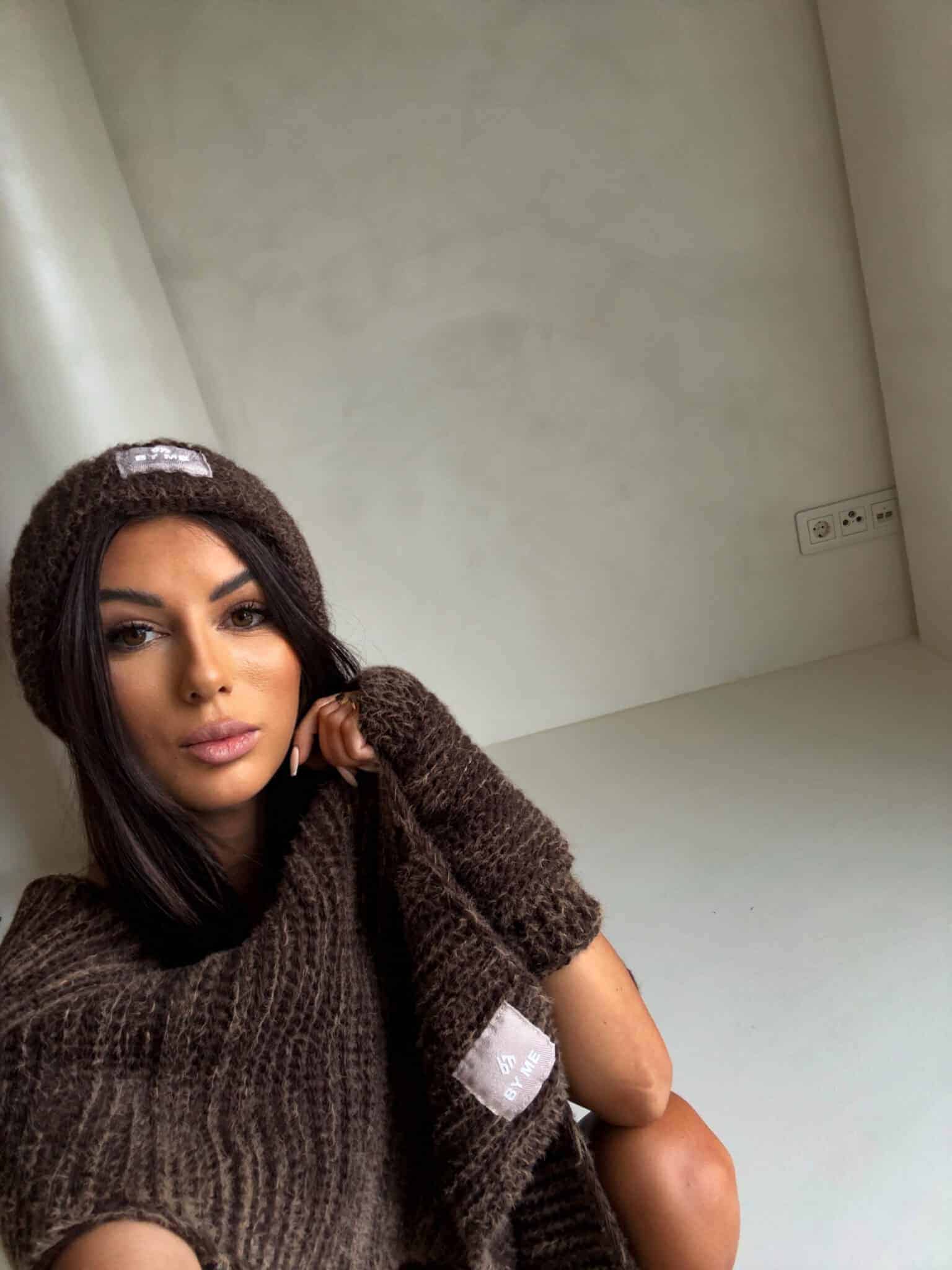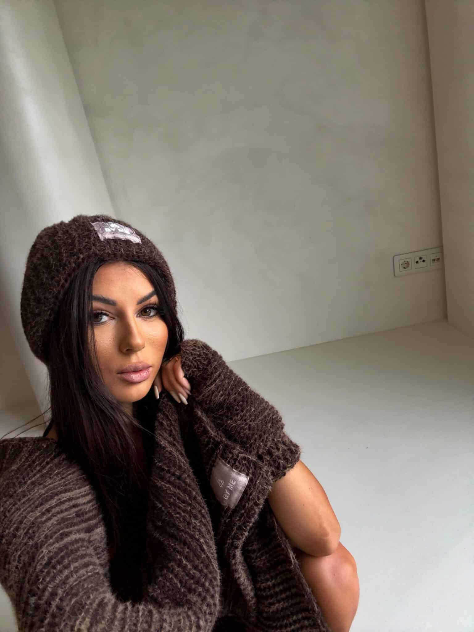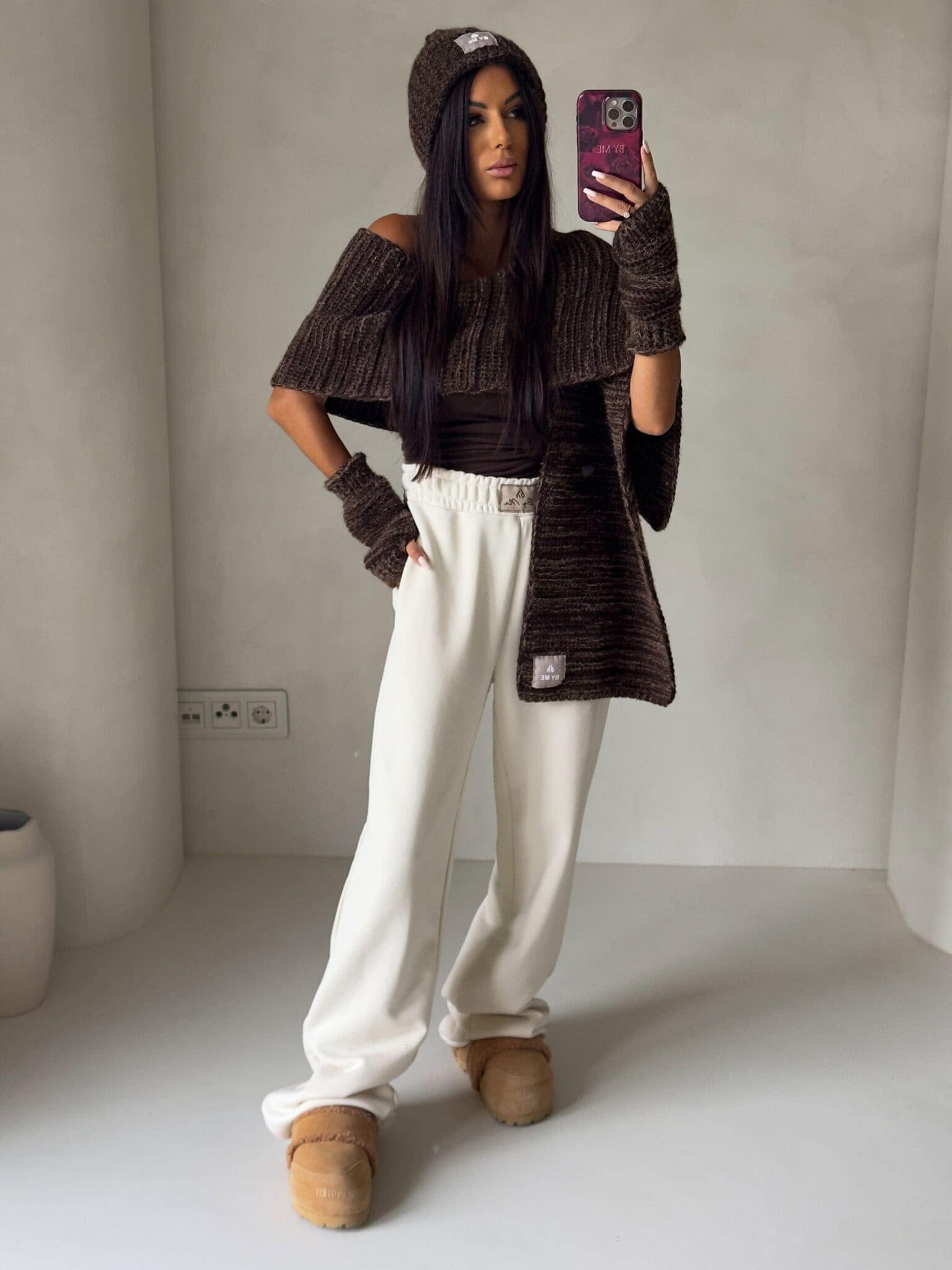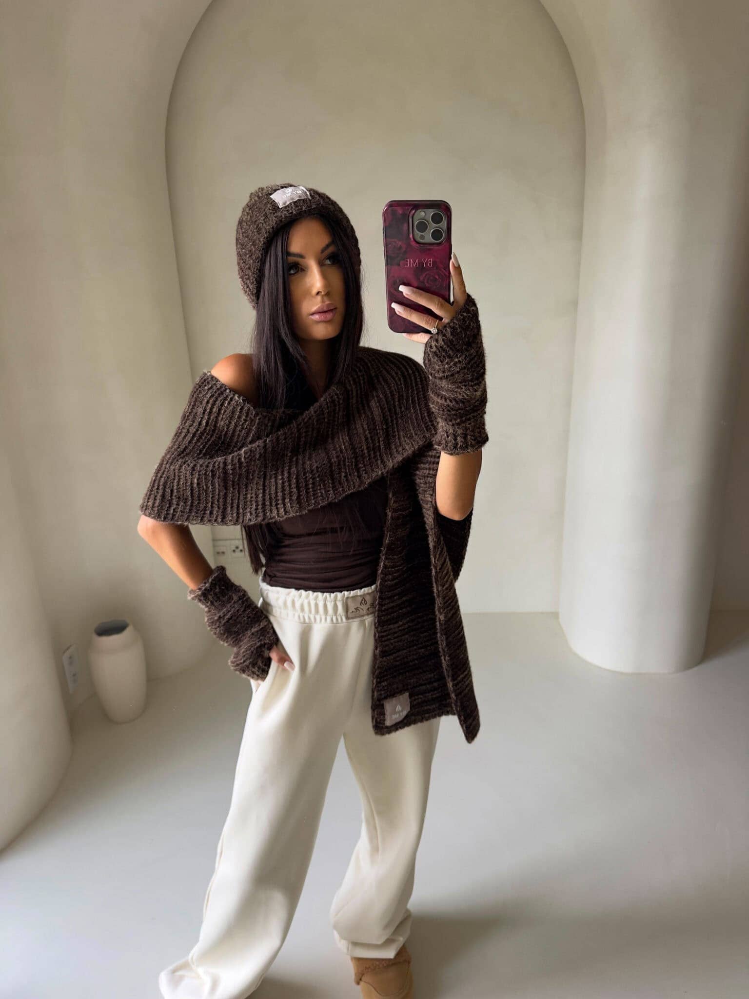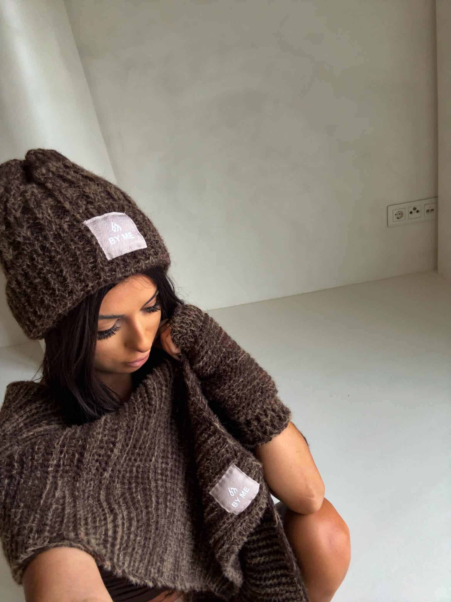 Komplet Alaska składający się z ciepłej czapki, szalika i rękawiczek bez palców.
