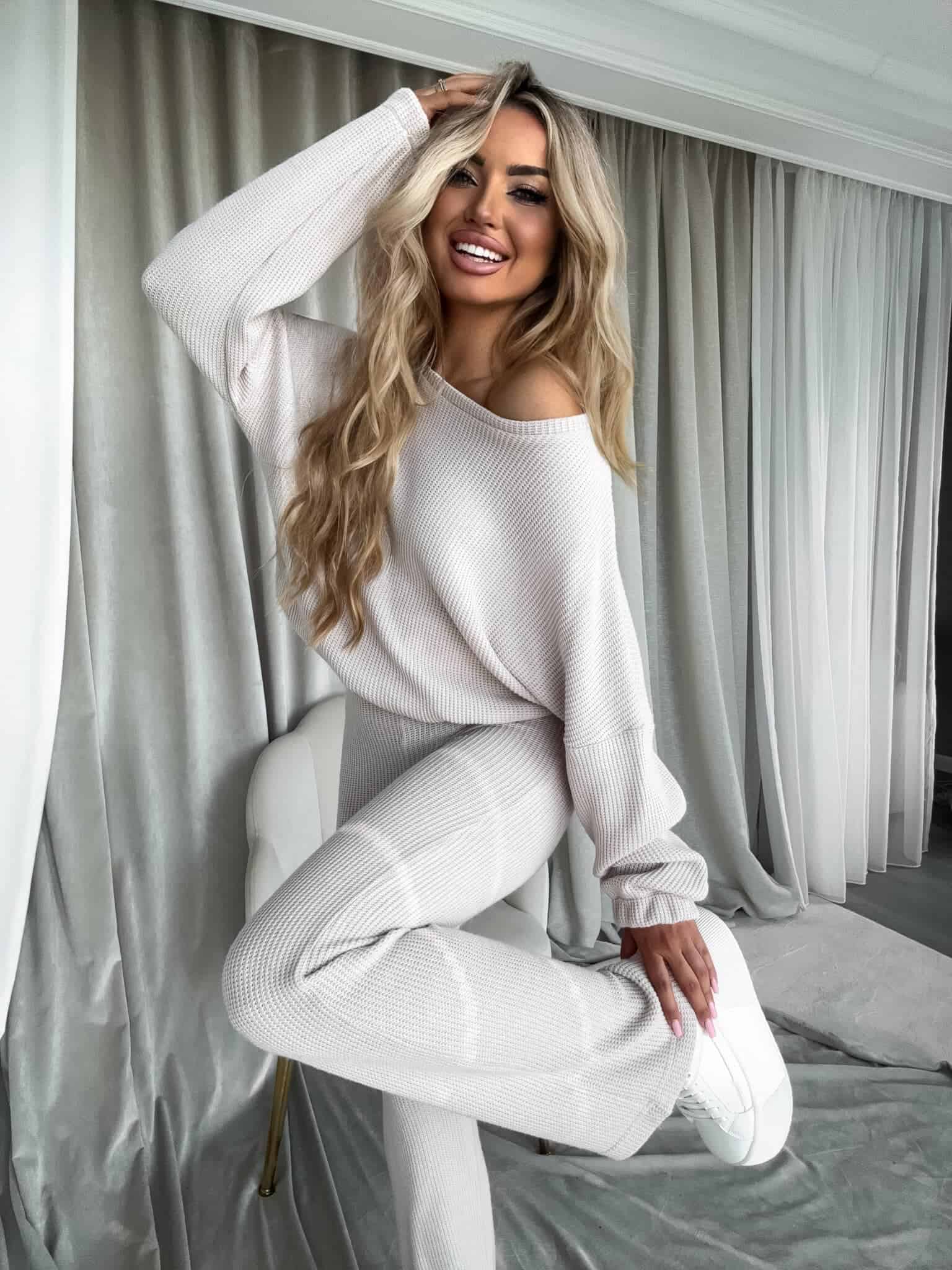 Komplet ANGEL wykonany z najwyższej jakości materiału, bardzo milutkiego. Bluza o prostym, luźnym kroju, z długim rękawem zakończonym gumą. Szerokie spodnie z gumką w pasie.