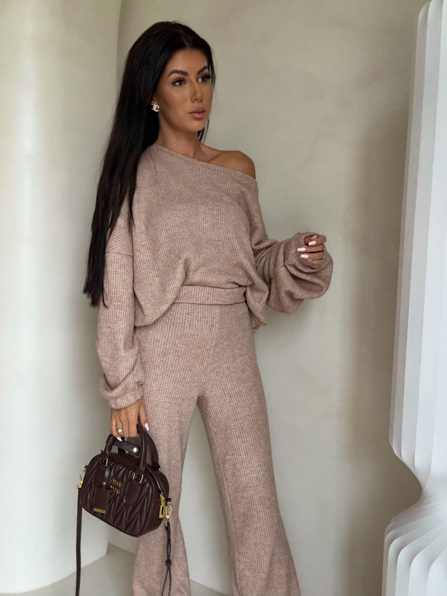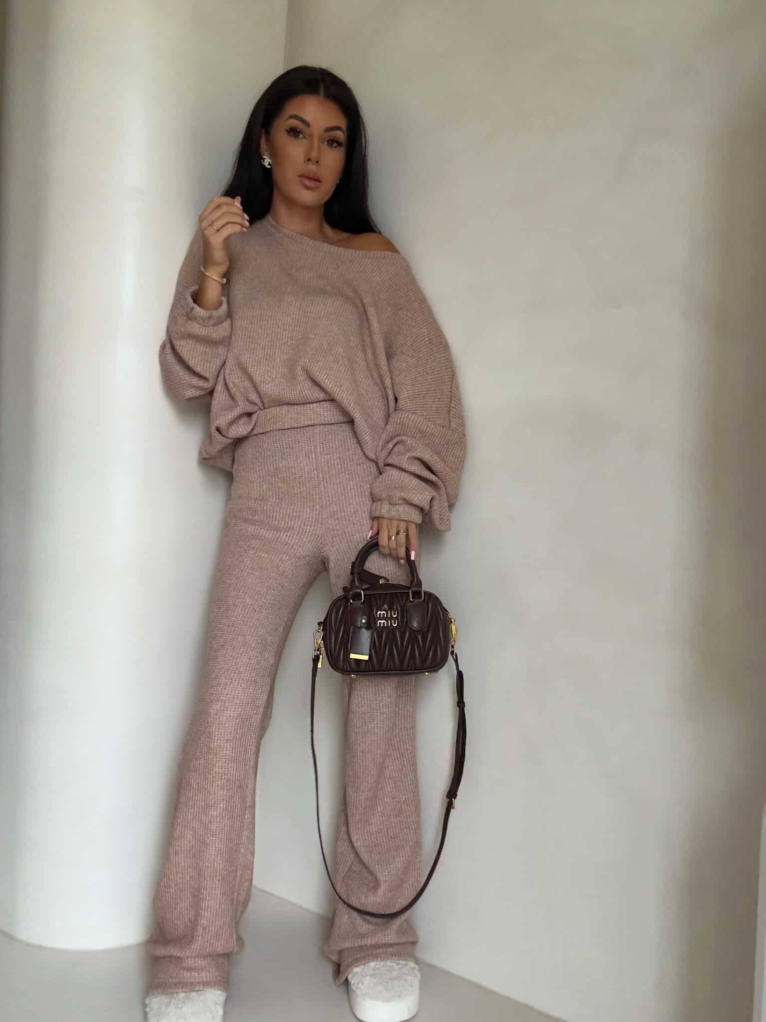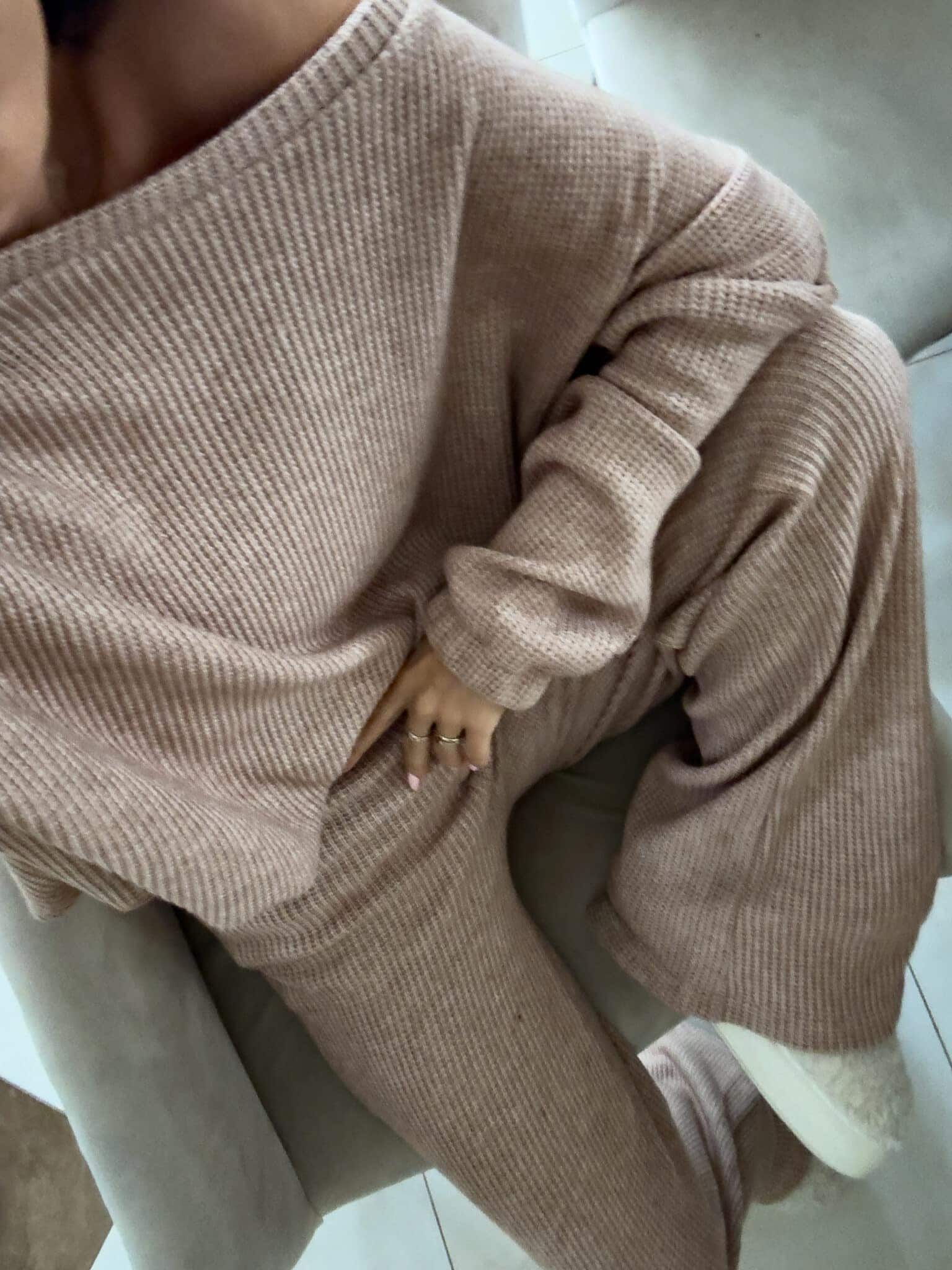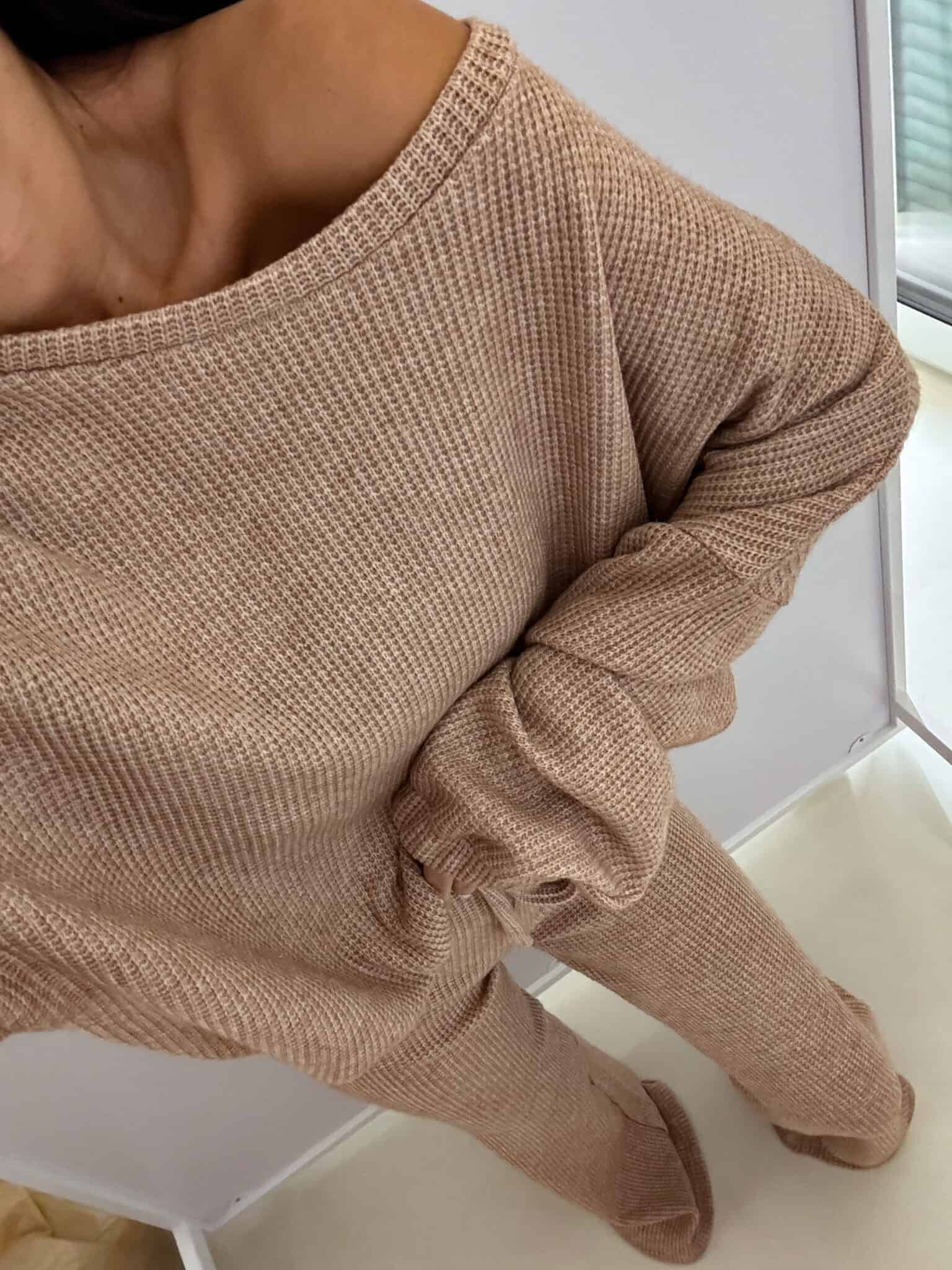 Komplet ANGEL wykonany z prążkowanego materiału. Bluza o prostym, luźnym kroju, z długim rękawem zakończonym gumą. Szerokie spodnie z gumką w pasie.