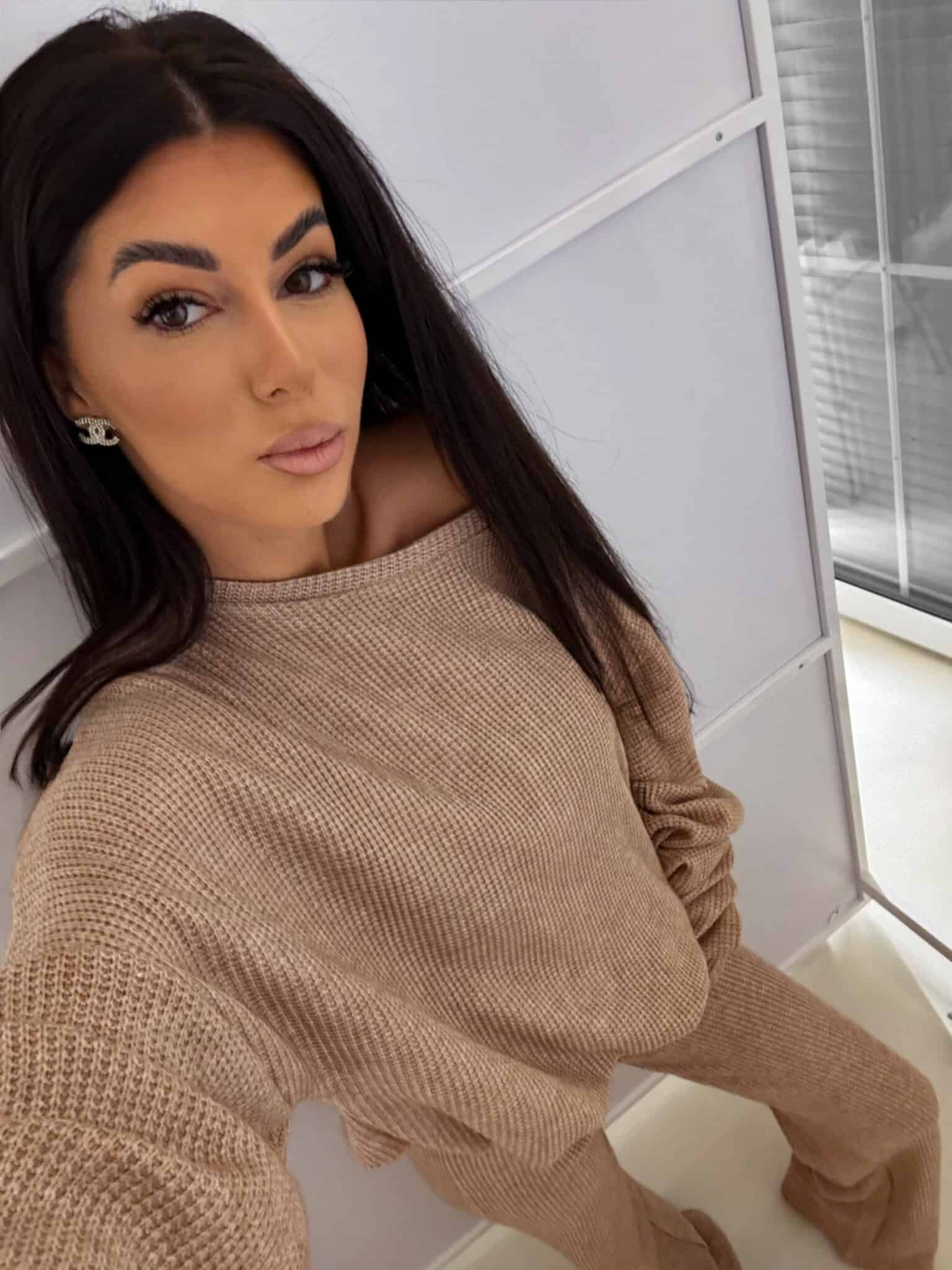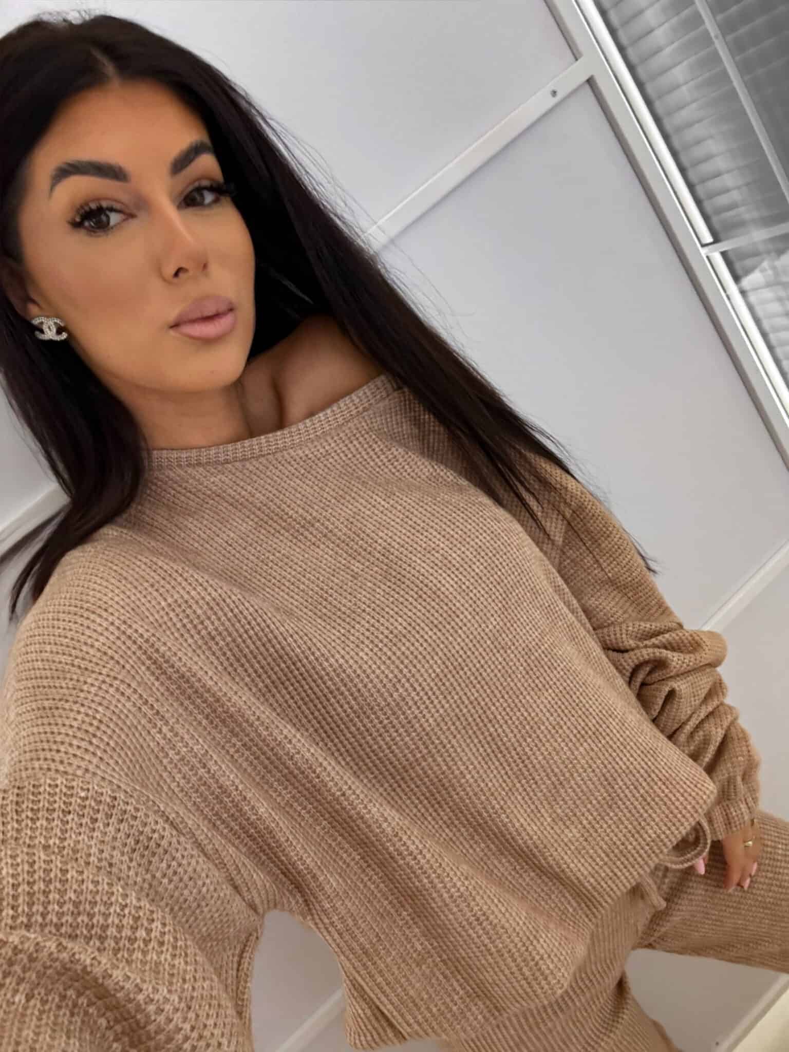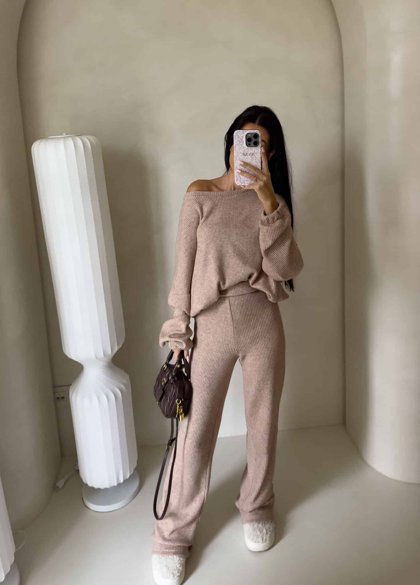 Komplet ANGEL wykonany z prążkowanego materiału. Bluza o prostym, luźnym kroju, z długim rękawem zakończonym gumą. Szerokie spodnie z gumką w pasie.
