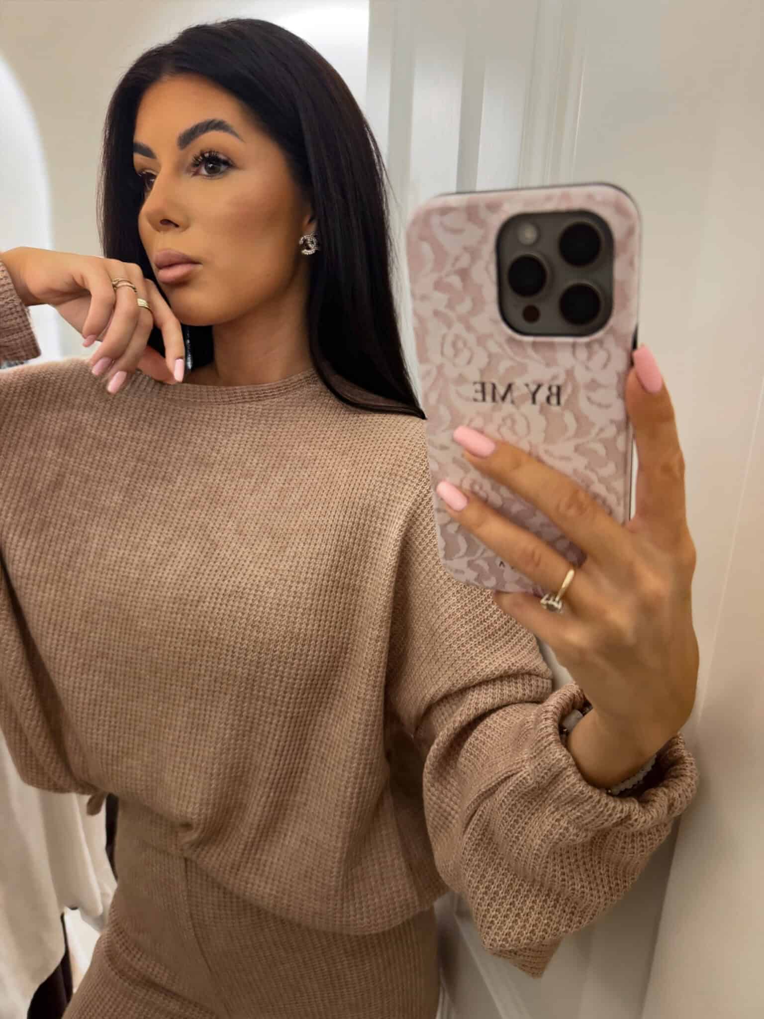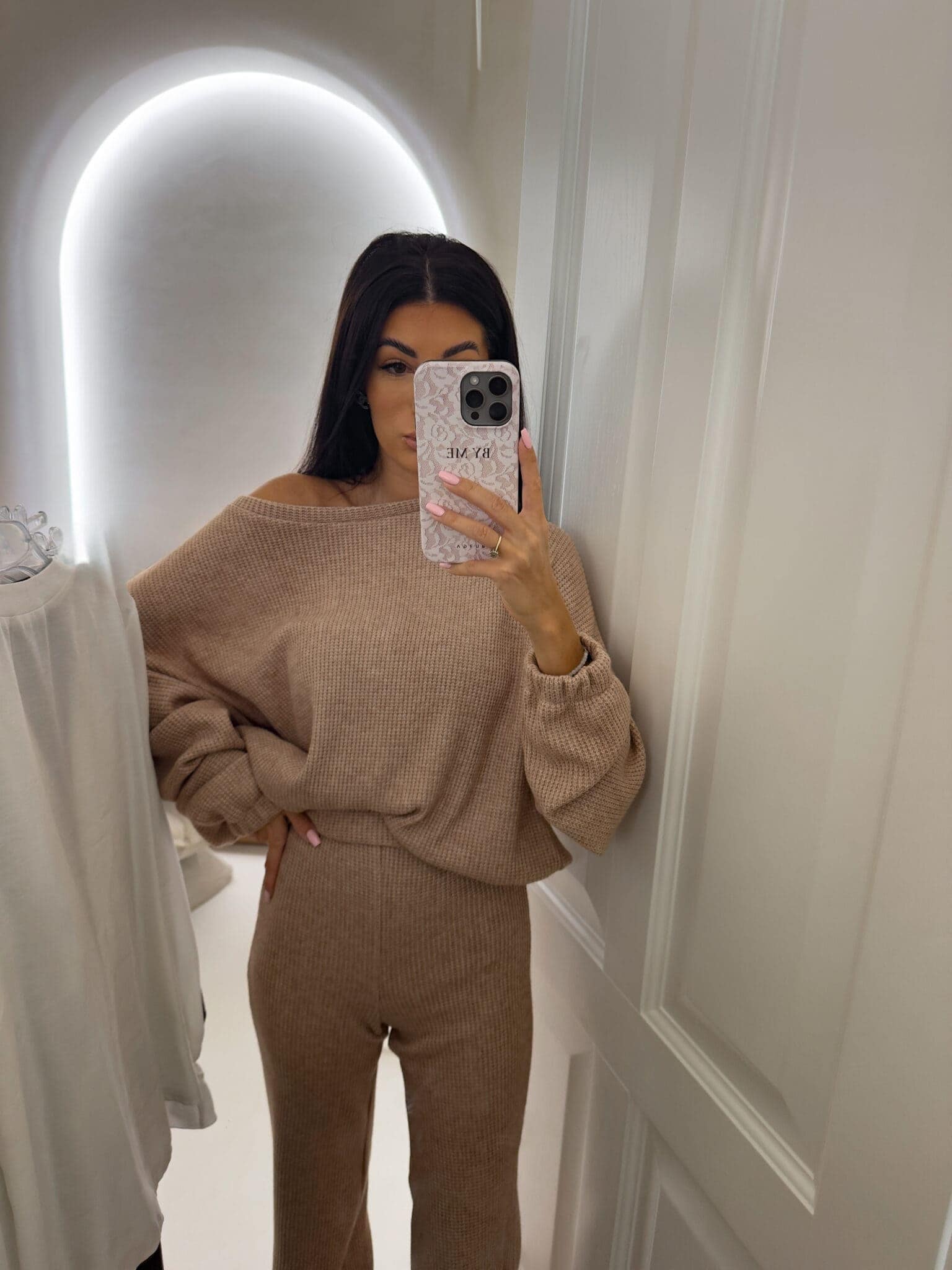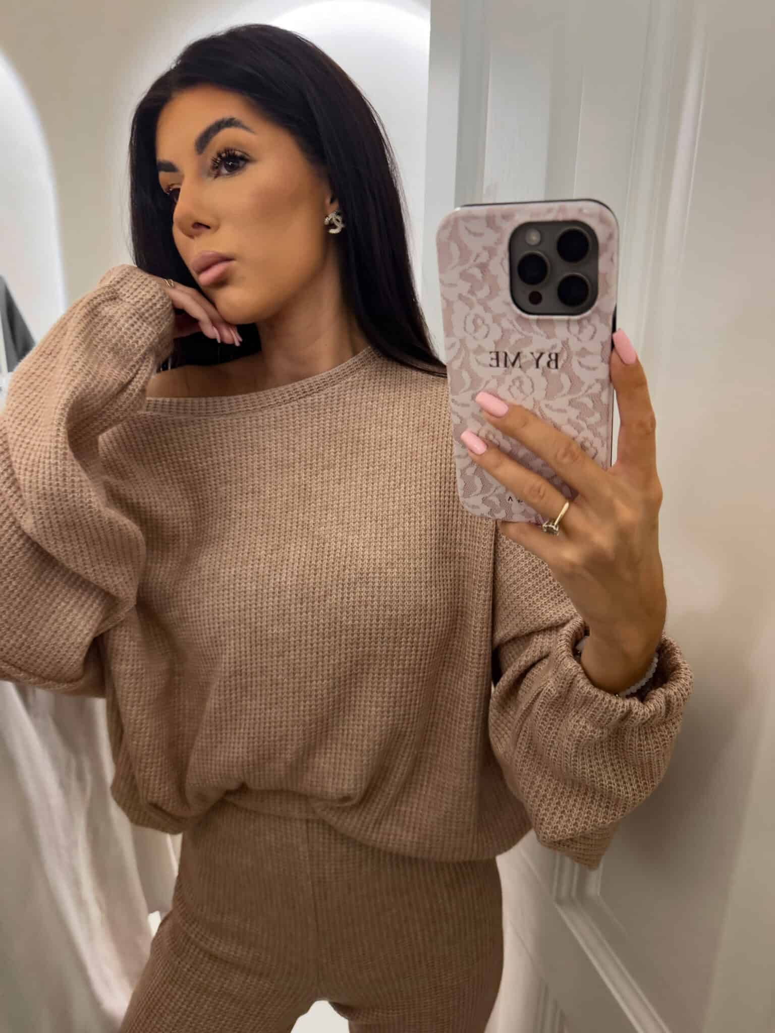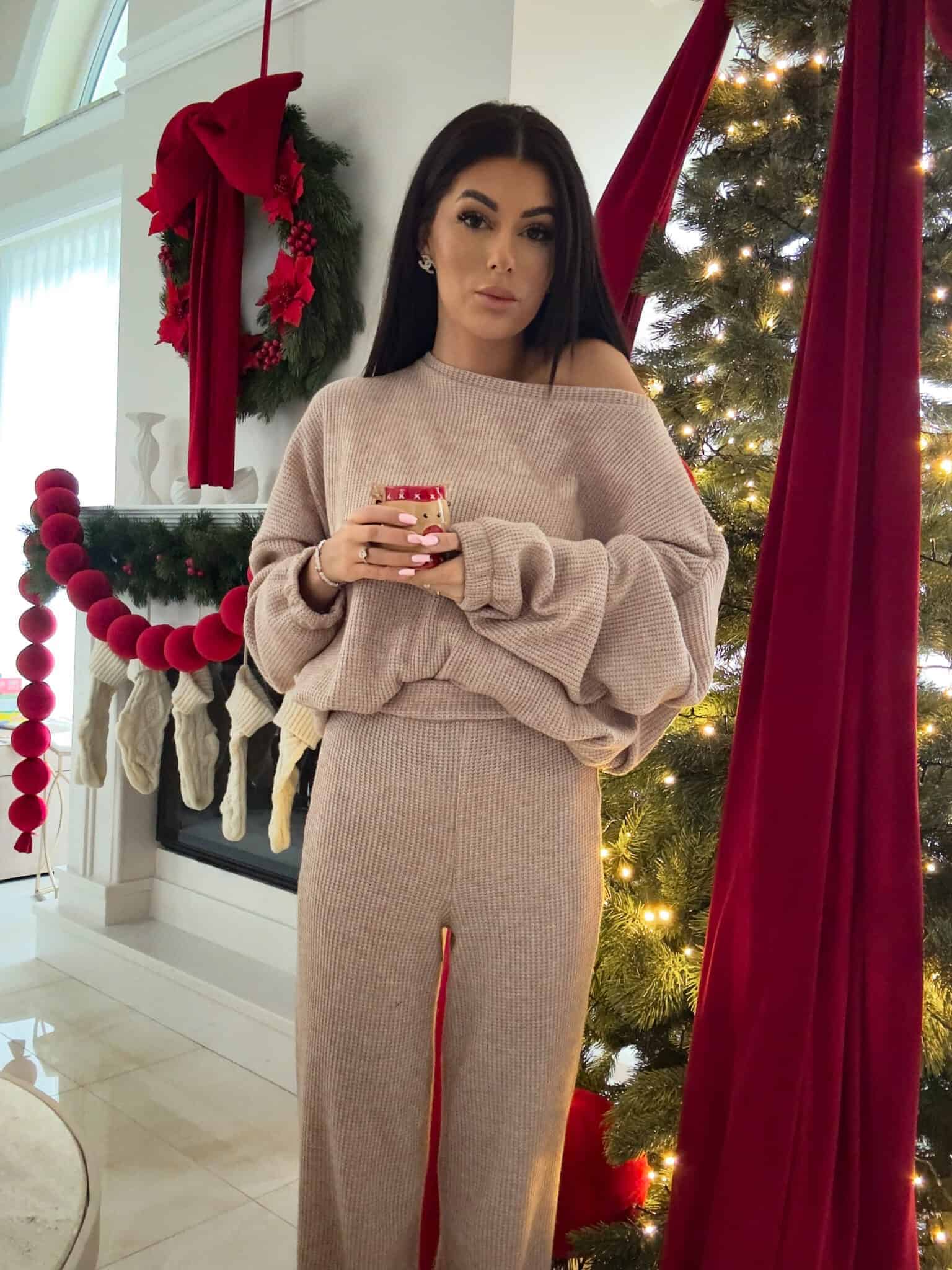 Komplet ANGEL wykonany z prążkowanego materiału. Bluza o prostym, luźnym kroju, z długim rękawem zakończonym gumą. Szerokie spodnie z gumką w pasie.