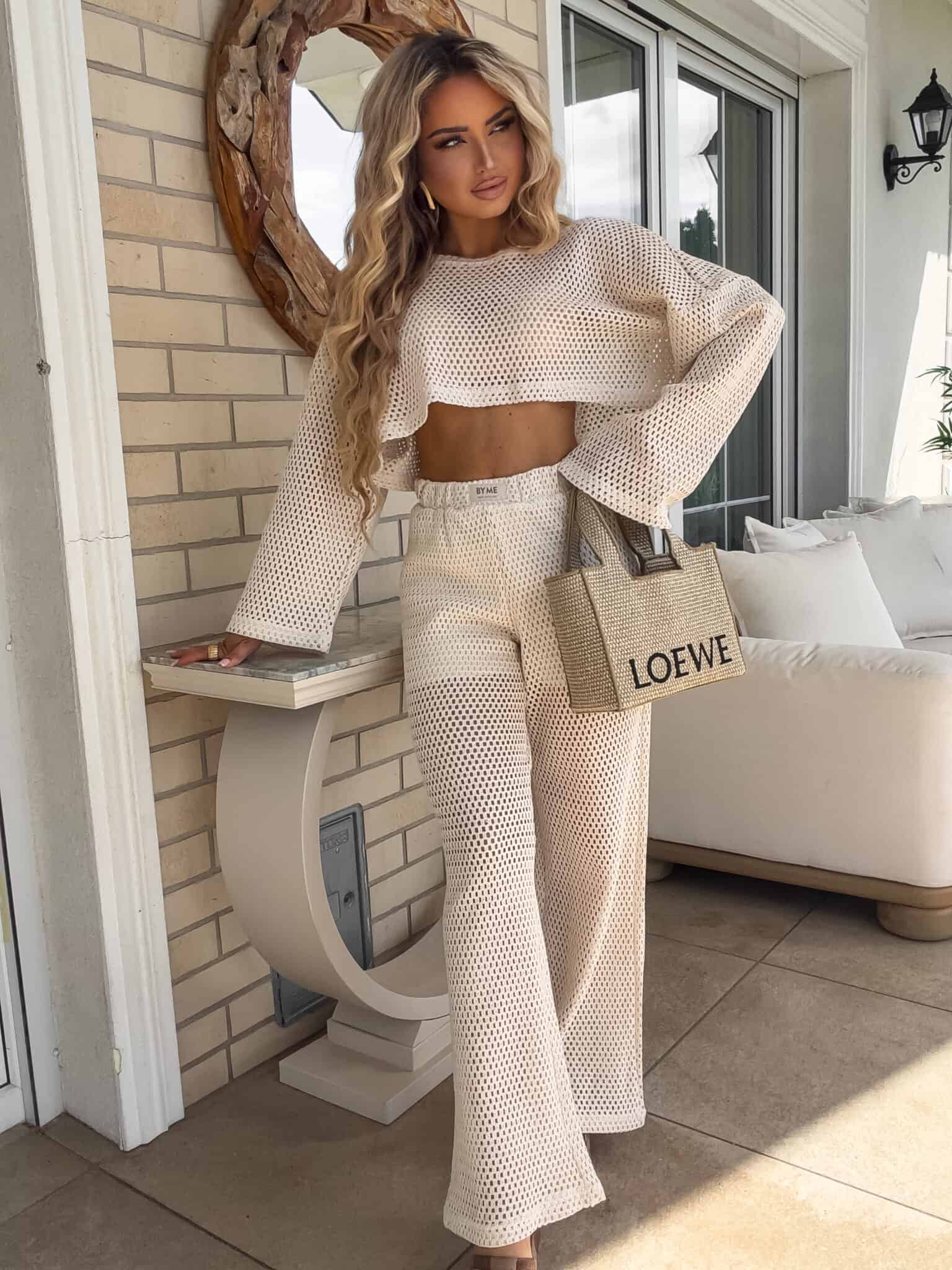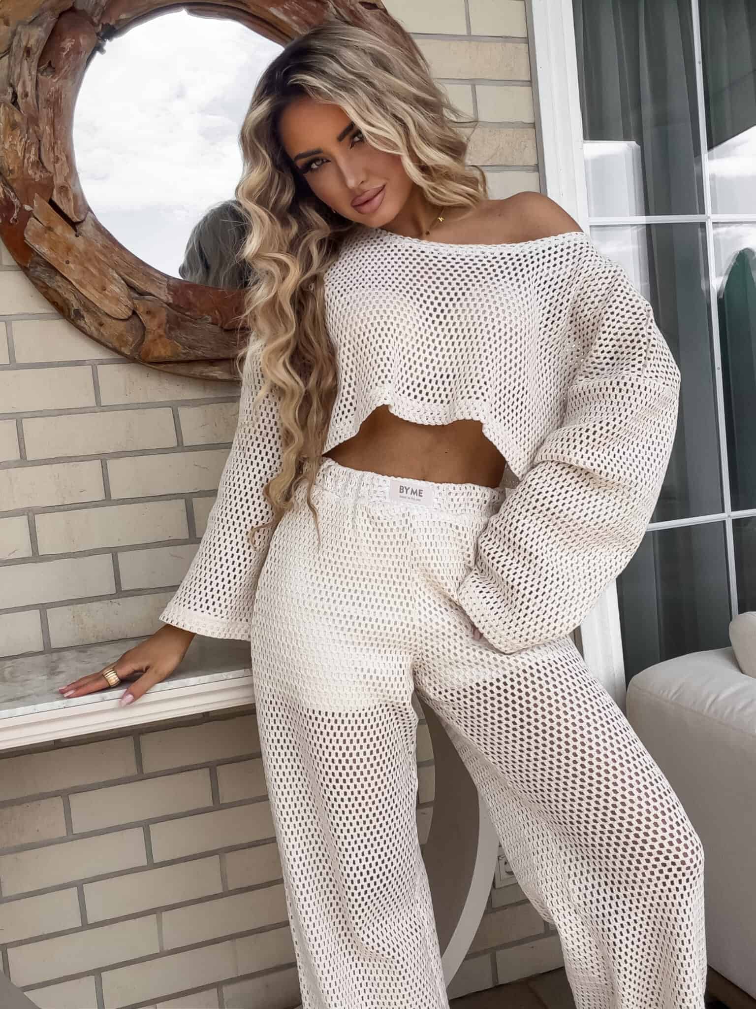 Komplet składa się z dwóch części: góra to krótka bluzka (crop top) z długimi, lekko rozszerzanymi rękawami i luźniejszym krojem. Dół stanowią spodnie z wysokim stanem i bardzo szerokimi nogawkami, które wydłużają sylwetkę i dodają elegancji.