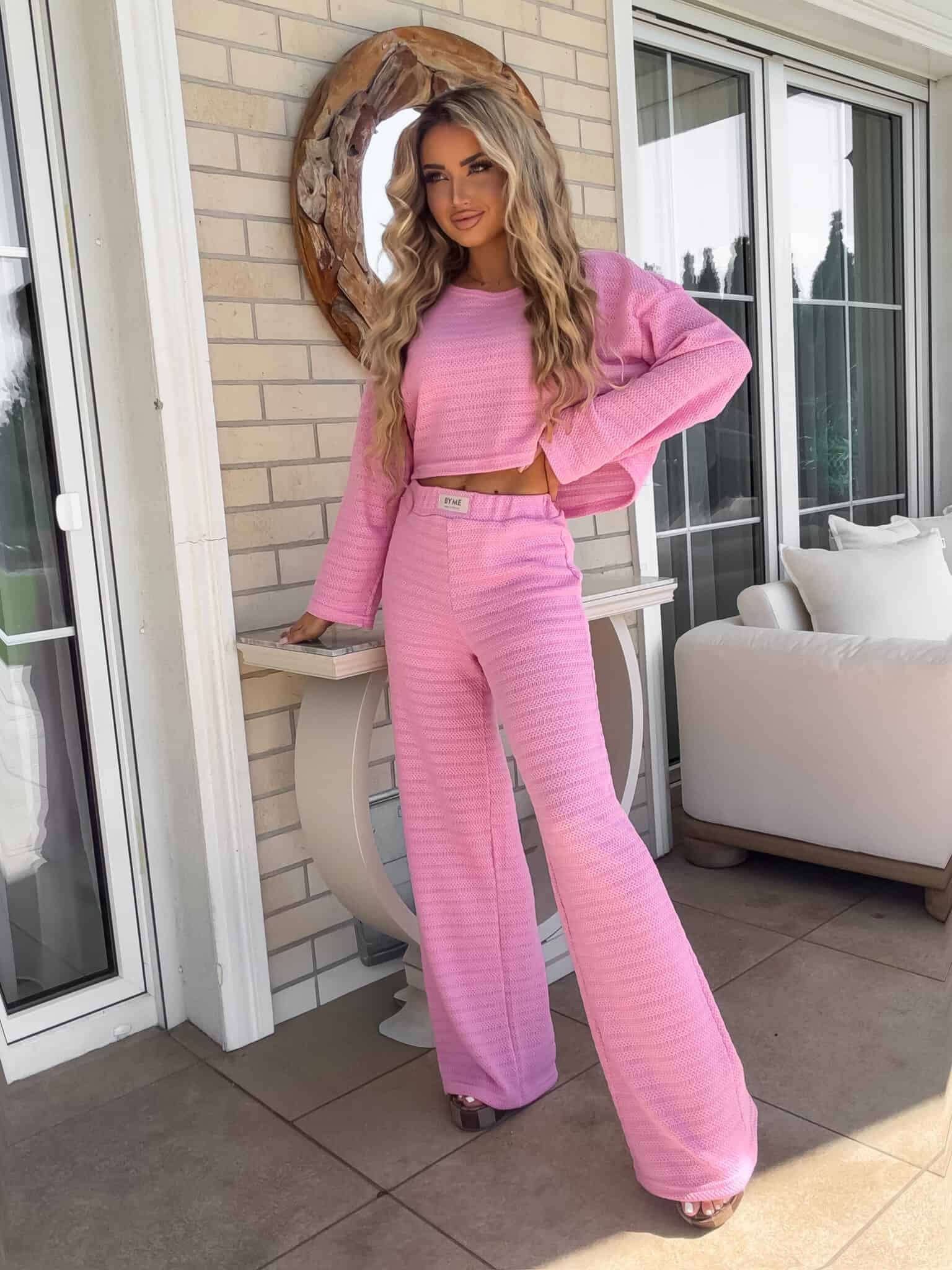 Komplet składa się z dwóch części: góra to krótka bluzka (crop top) z długimi, lekko rozszerzanymi rękawami i luźniejszym krojem. Dół stanowią spodnie z wysokim stanem i bardzo szerokimi nogawkami, które wydłużają sylwetkę i dodają elegancji.