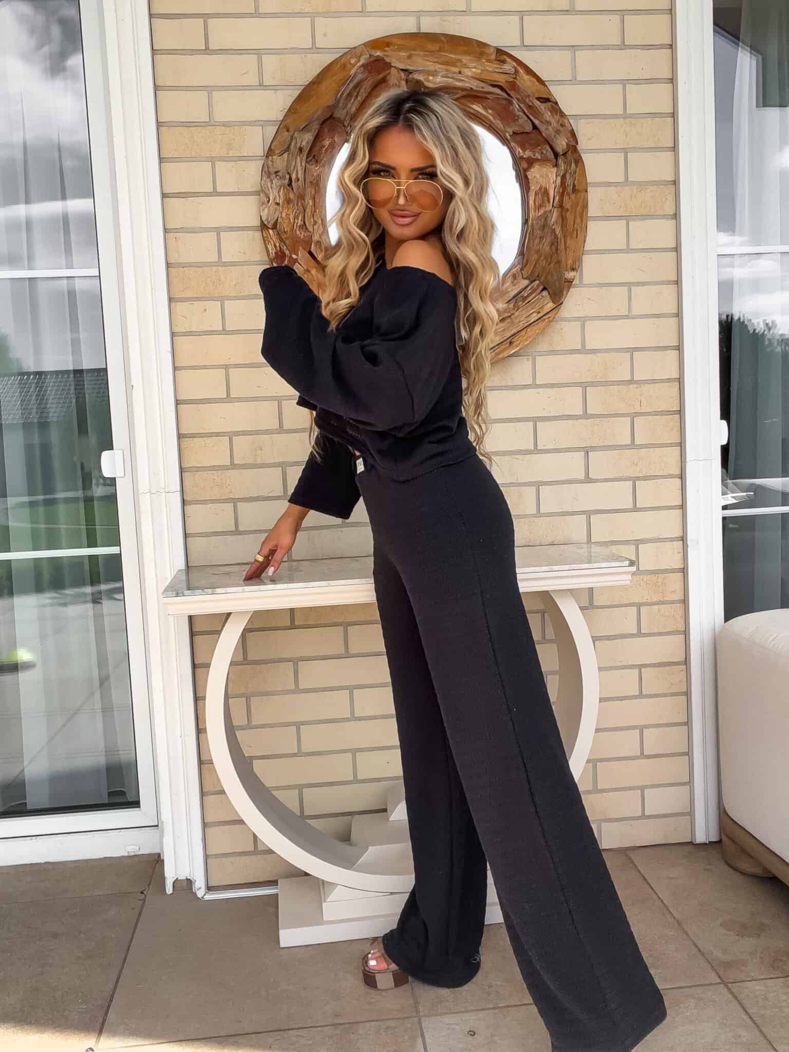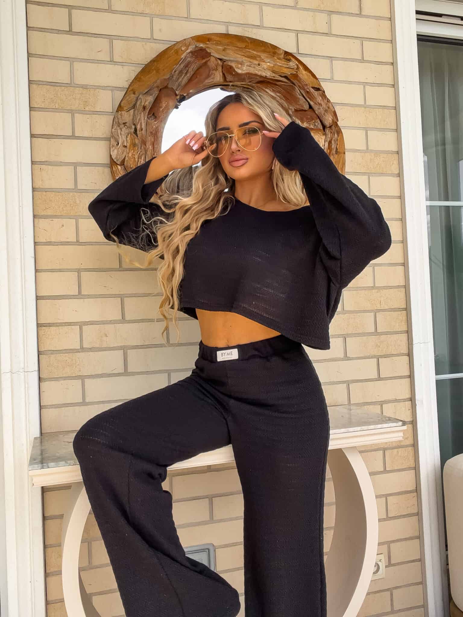 Komplet składa się z dwóch części: góra to krótka bluzka (crop top) z długimi, lekko rozszerzanymi rękawami i luźniejszym krojem. Dół stanowią spodnie z wysokim stanem i bardzo szerokimi nogawkami, które wydłużają sylwetkę i dodają elegancji.
