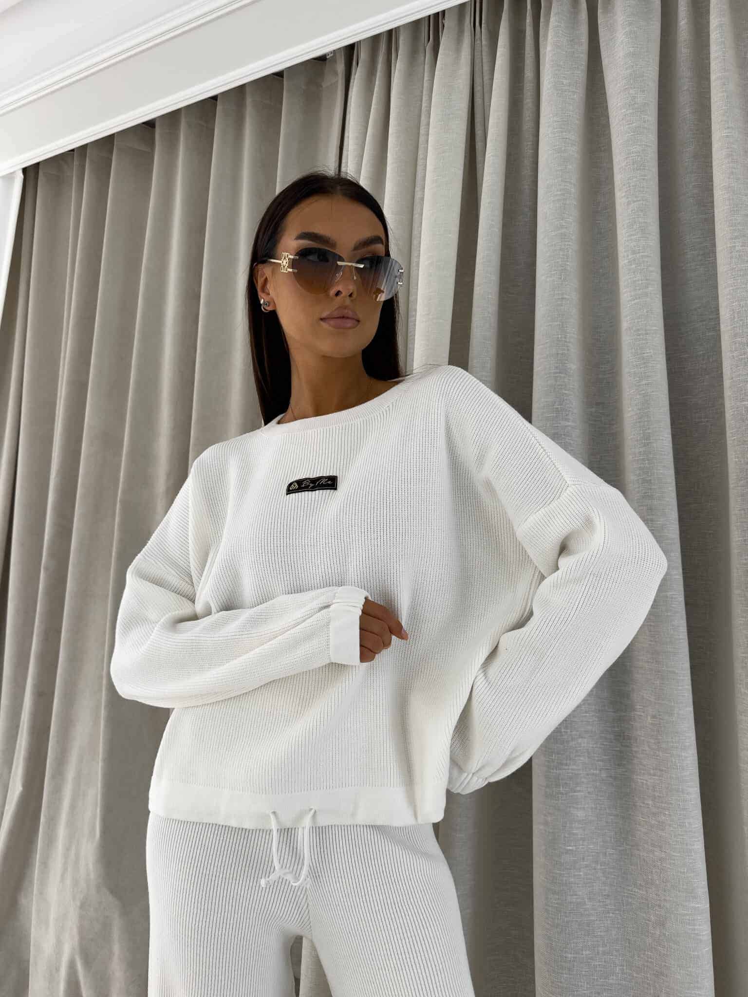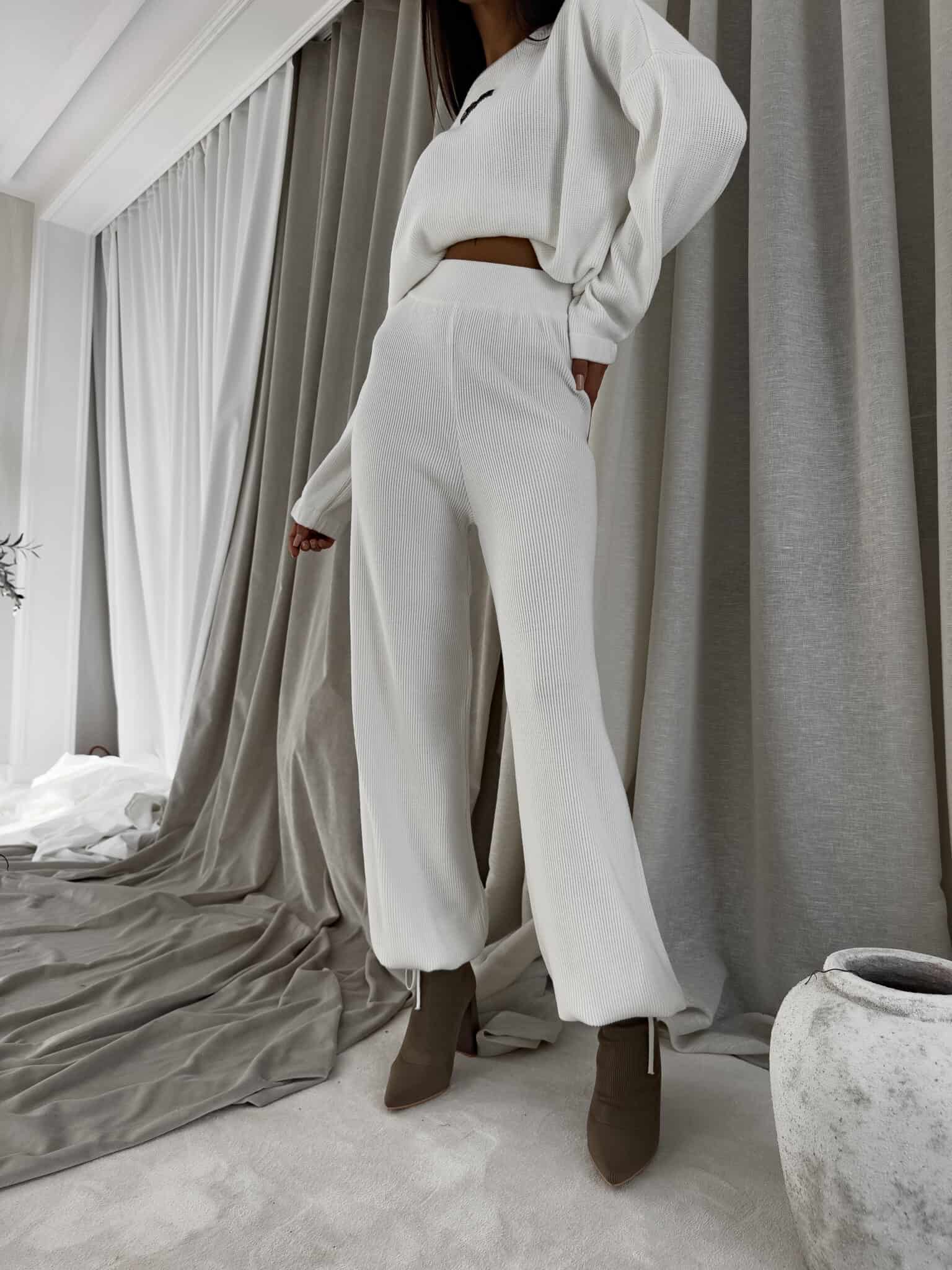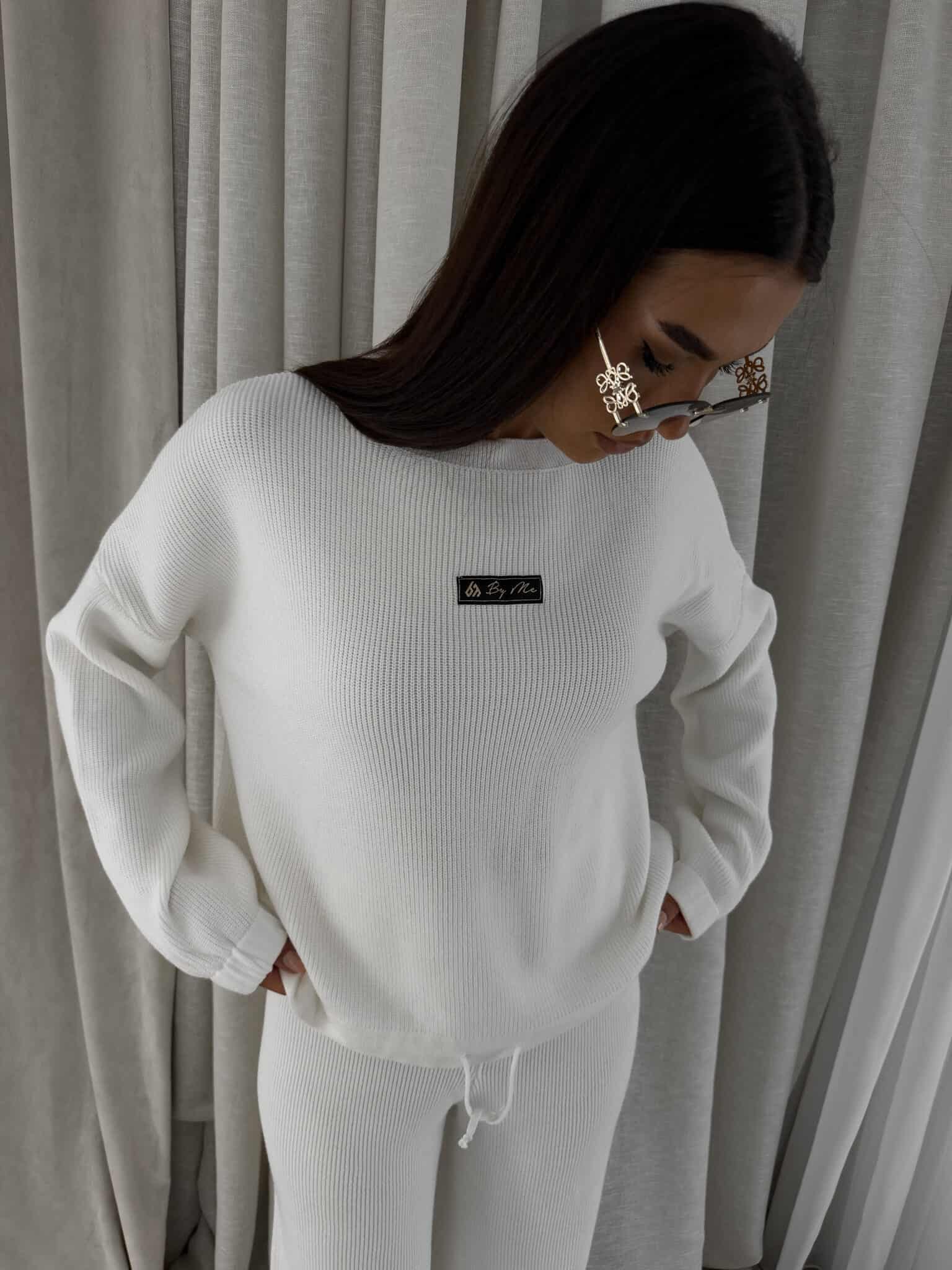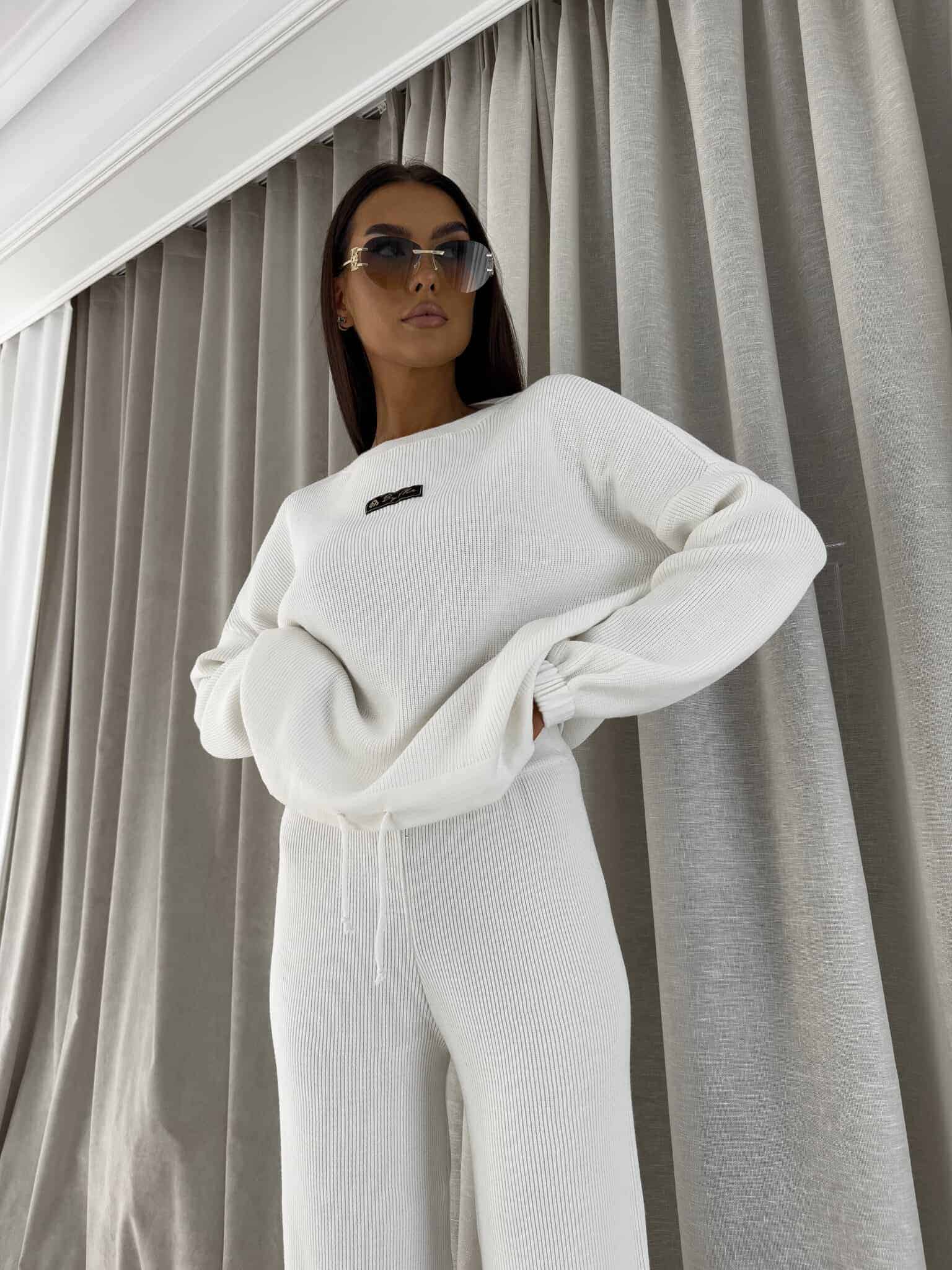 Stylowy komplet wykonany z miękkiej, przyjemnej w dotyku dzianiny, idealny na chłodniejsze dni. Składa się z oversize’owego swetra z długimi rękawami oraz spodni z wysokim stanem, uszytych z tej samej tkaniny. Sweter zakładany przez głowę, wyposażony w troczki umożliwiające regulację długości – możesz nosić go na różne sposoby, dopasowując do swojego stylu. Spodnie z szerokimi nogawkami i wygodną gumką w pasie zapewniają komfort noszenia. Nogawki również wykończone troczkami, co pozwala na subtelne modelowanie ich kształtu. Komplet idealny zarówno do relaksu w domu, jak i na niezobowiązujące wyjścia.