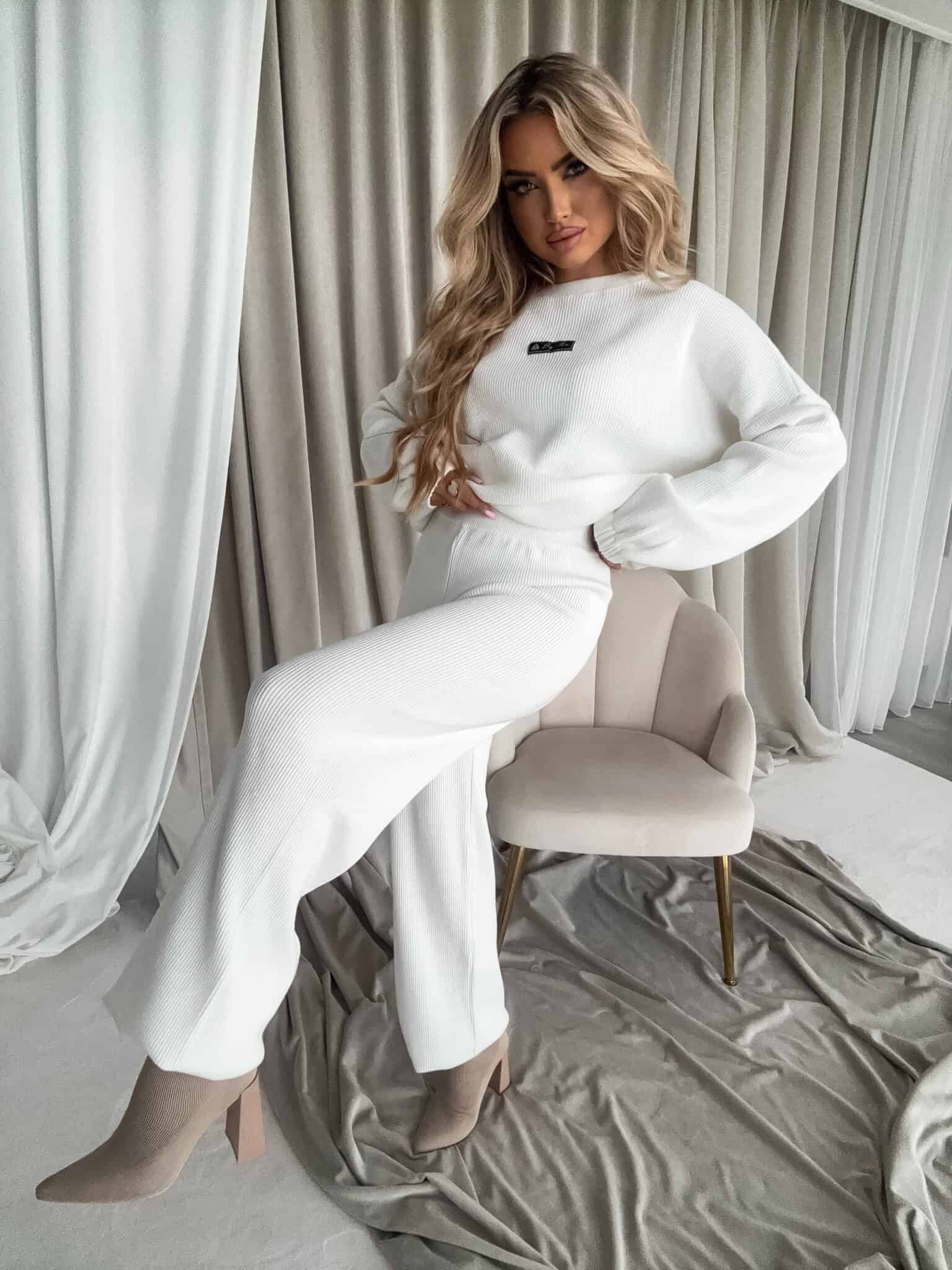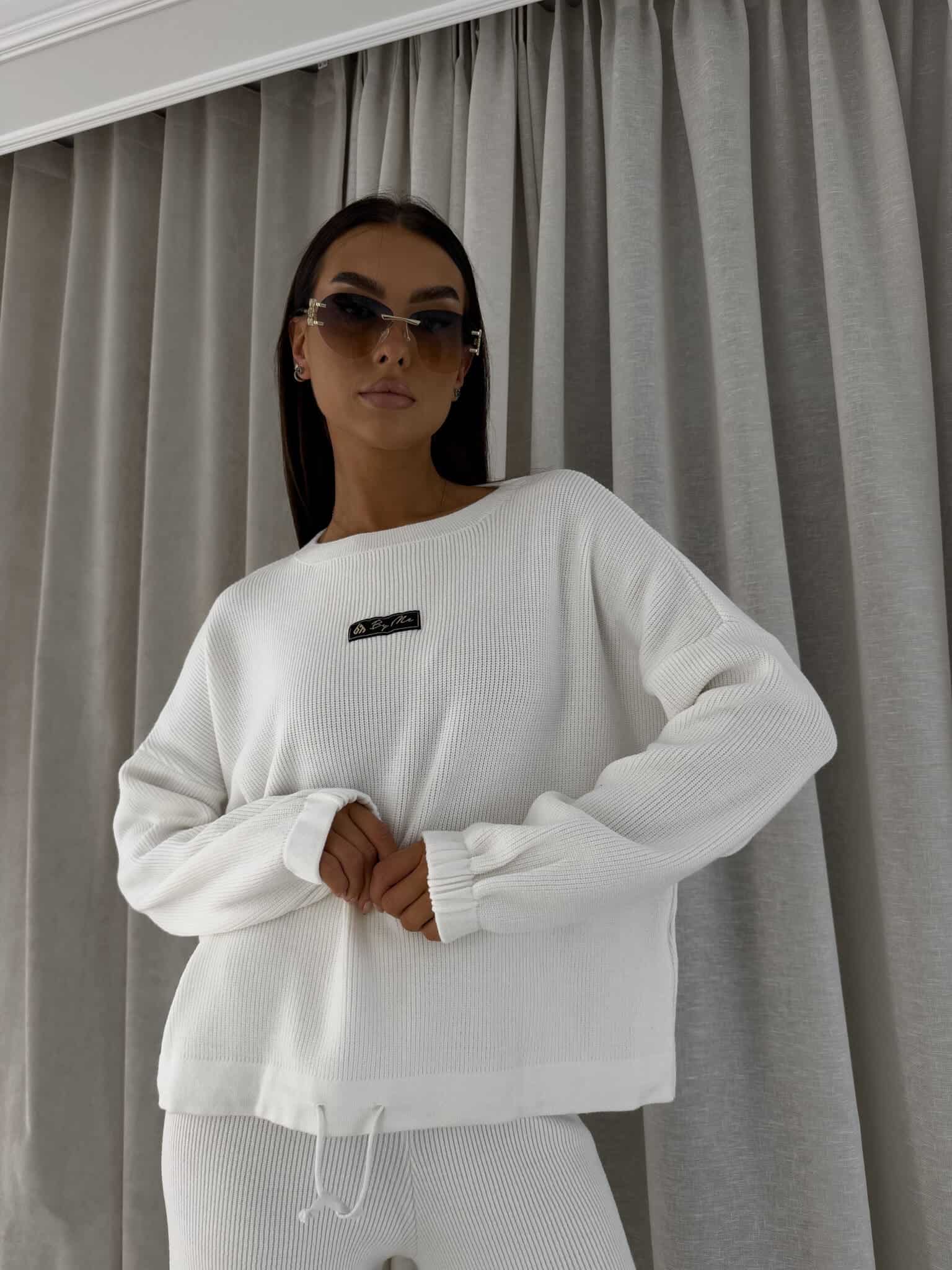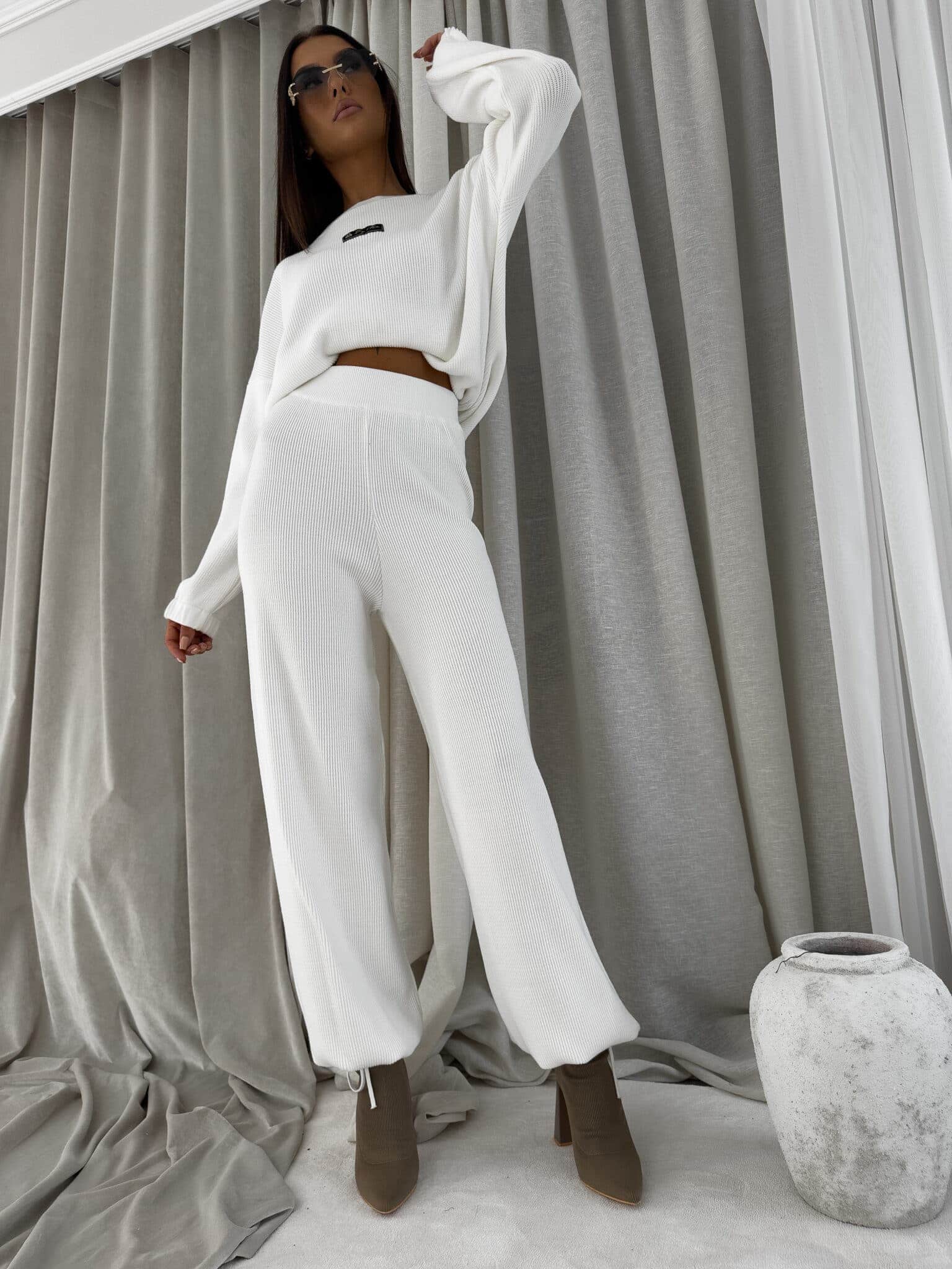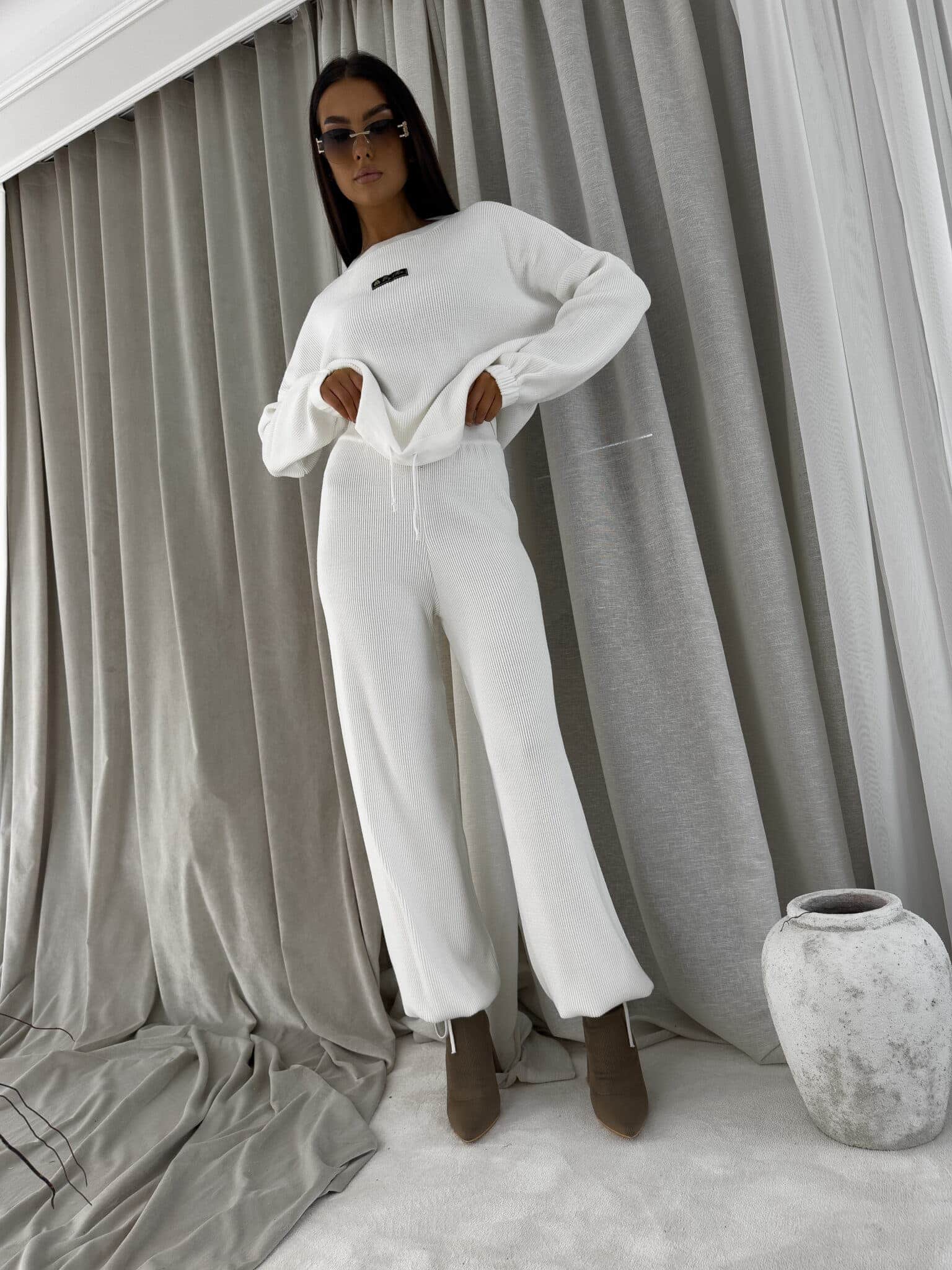 Stylowy komplet wykonany z miękkiej, przyjemnej w dotyku dzianiny, idealny na chłodniejsze dni. Składa się z oversize’owego swetra z długimi rękawami oraz spodni z wysokim stanem, uszytych z tej samej tkaniny. Sweter zakładany przez głowę, wyposażony w troczki umożliwiające regulację długości – możesz nosić go na różne sposoby, dopasowując do swojego stylu. Spodnie z szerokimi nogawkami i wygodną gumką w pasie zapewniają komfort noszenia. Nogawki również wykończone troczkami, co pozwala na subtelne modelowanie ich kształtu. Komplet idealny zarówno do relaksu w domu, jak i na niezobowiązujące wyjścia.
