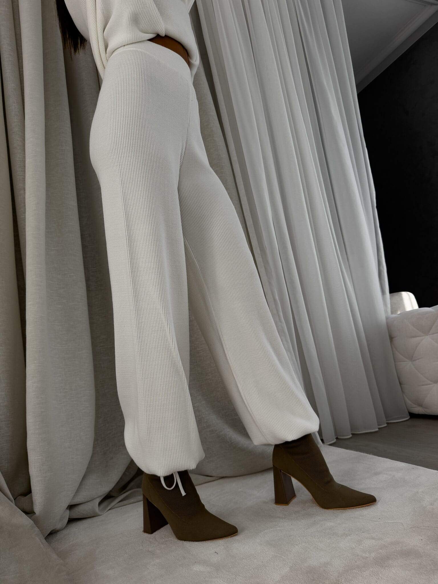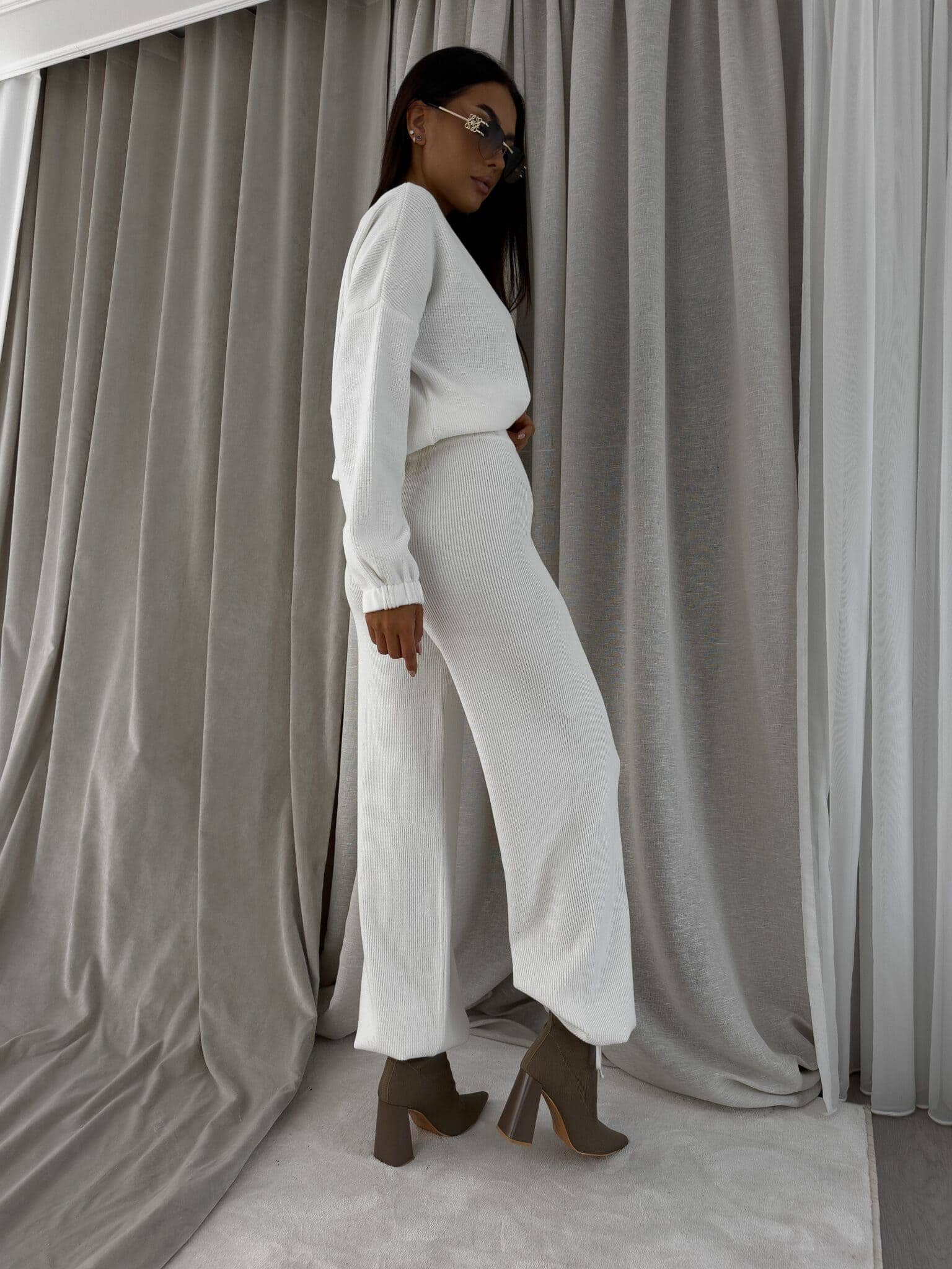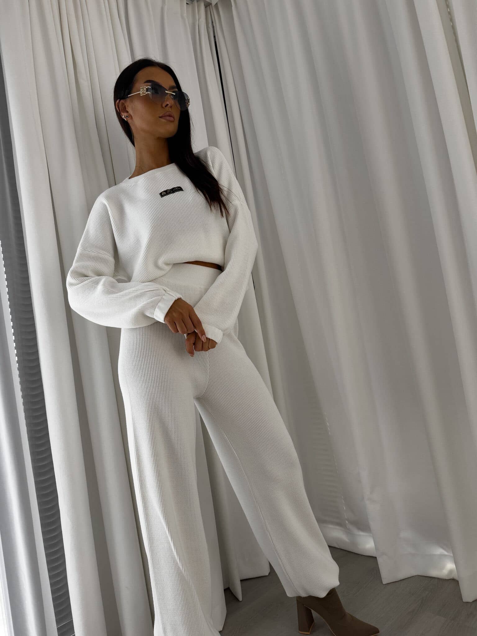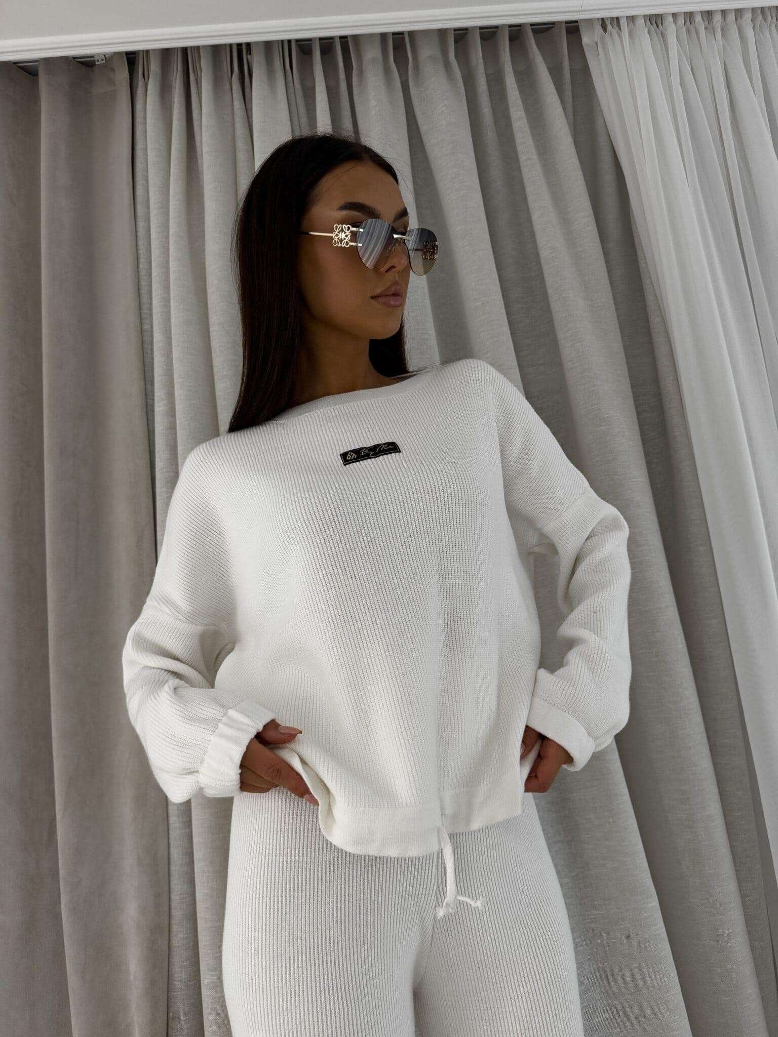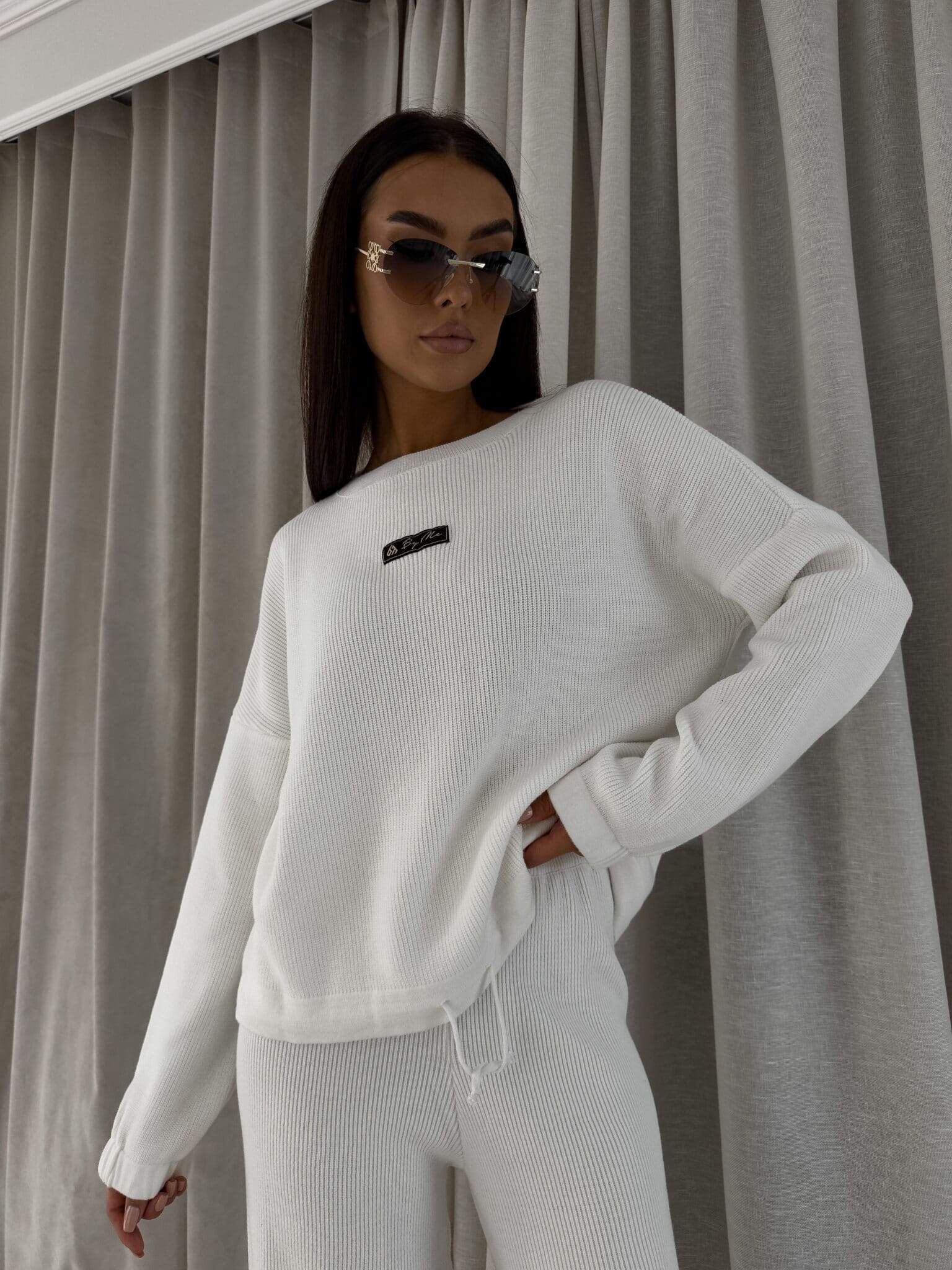 Stylowy komplet wykonany z miękkiej, przyjemnej w dotyku dzianiny, idealny na chłodniejsze dni. Składa się z oversize’owego swetra z długimi rękawami oraz spodni z wysokim stanem, uszytych z tej samej tkaniny. Sweter zakładany przez głowę, wyposażony w troczki umożliwiające regulację długości – możesz nosić go na różne sposoby, dopasowując do swojego stylu. Spodnie z szerokimi nogawkami i wygodną gumką w pasie zapewniają komfort noszenia. Nogawki również wykończone troczkami, co pozwala na subtelne modelowanie ich kształtu. Komplet idealny zarówno do relaksu w domu, jak i na niezobowiązujące wyjścia.