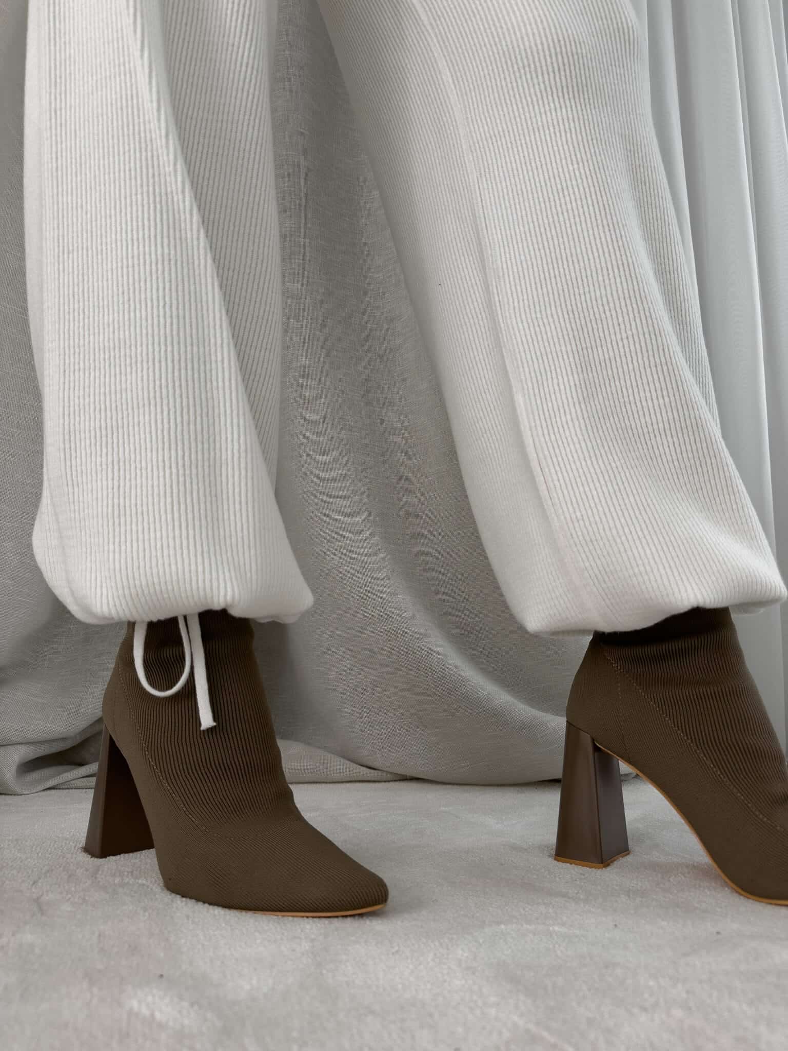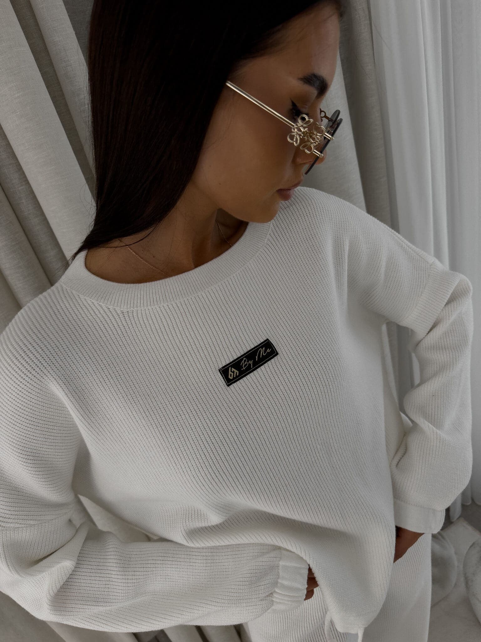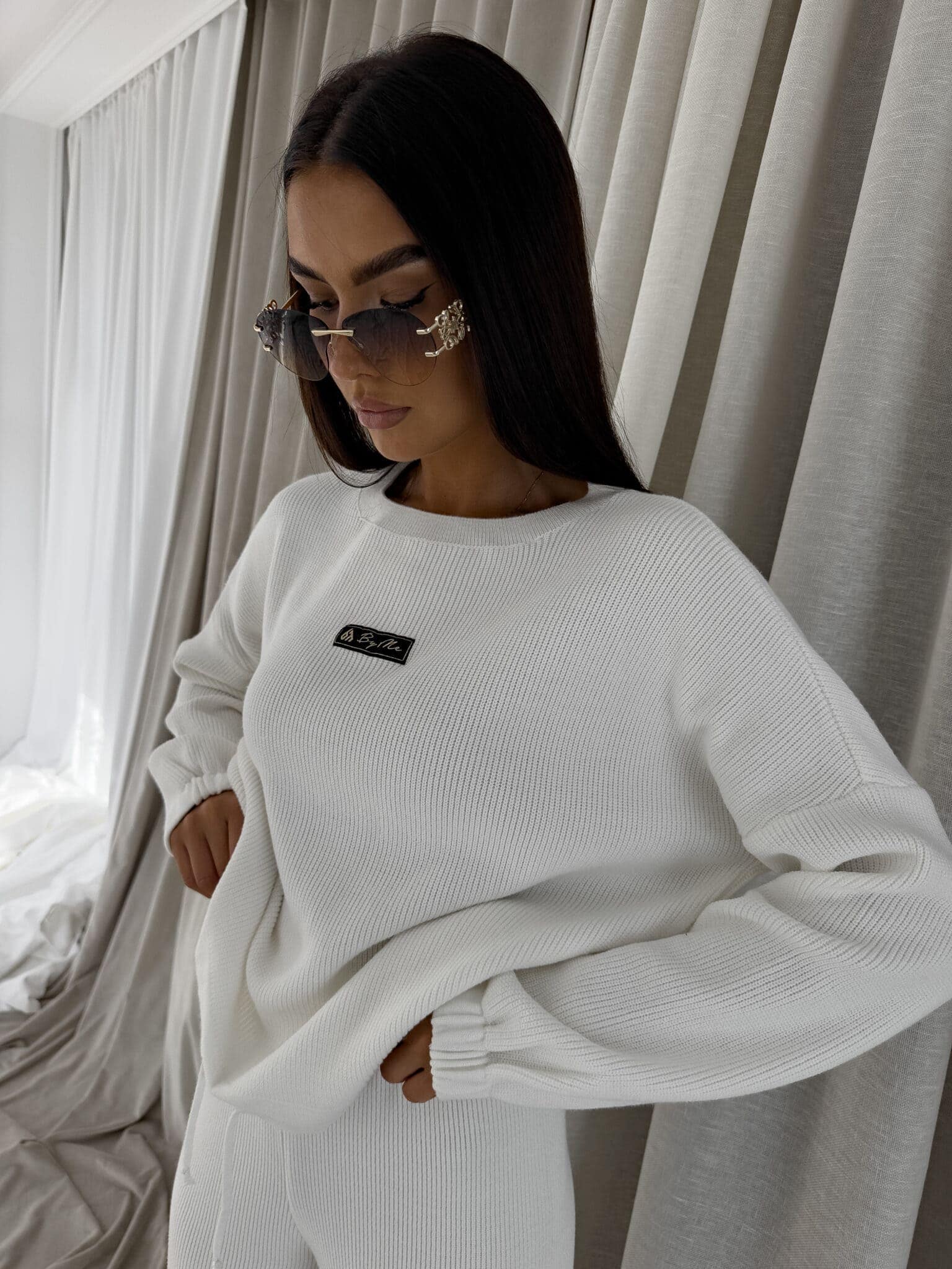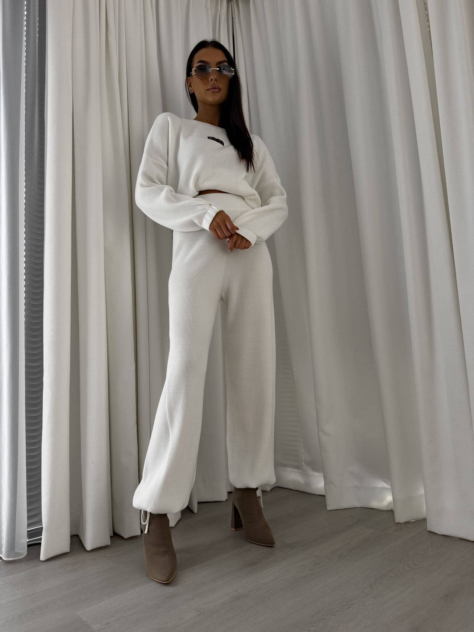 Stylowy komplet wykonany z miękkiej, przyjemnej w dotyku dzianiny, idealny na chłodniejsze dni. Składa się z oversize’owego swetra z długimi rękawami oraz spodni z wysokim stanem, uszytych z tej samej tkaniny. Sweter zakładany przez głowę, wyposażony w troczki umożliwiające regulację długości – możesz nosić go na różne sposoby, dopasowując do swojego stylu. Spodnie z szerokimi nogawkami i wygodną gumką w pasie zapewniają komfort noszenia. Nogawki również wykończone troczkami, co pozwala na subtelne modelowanie ich kształtu. Komplet idealny zarówno do relaksu w domu, jak i na niezobowiązujące wyjścia.