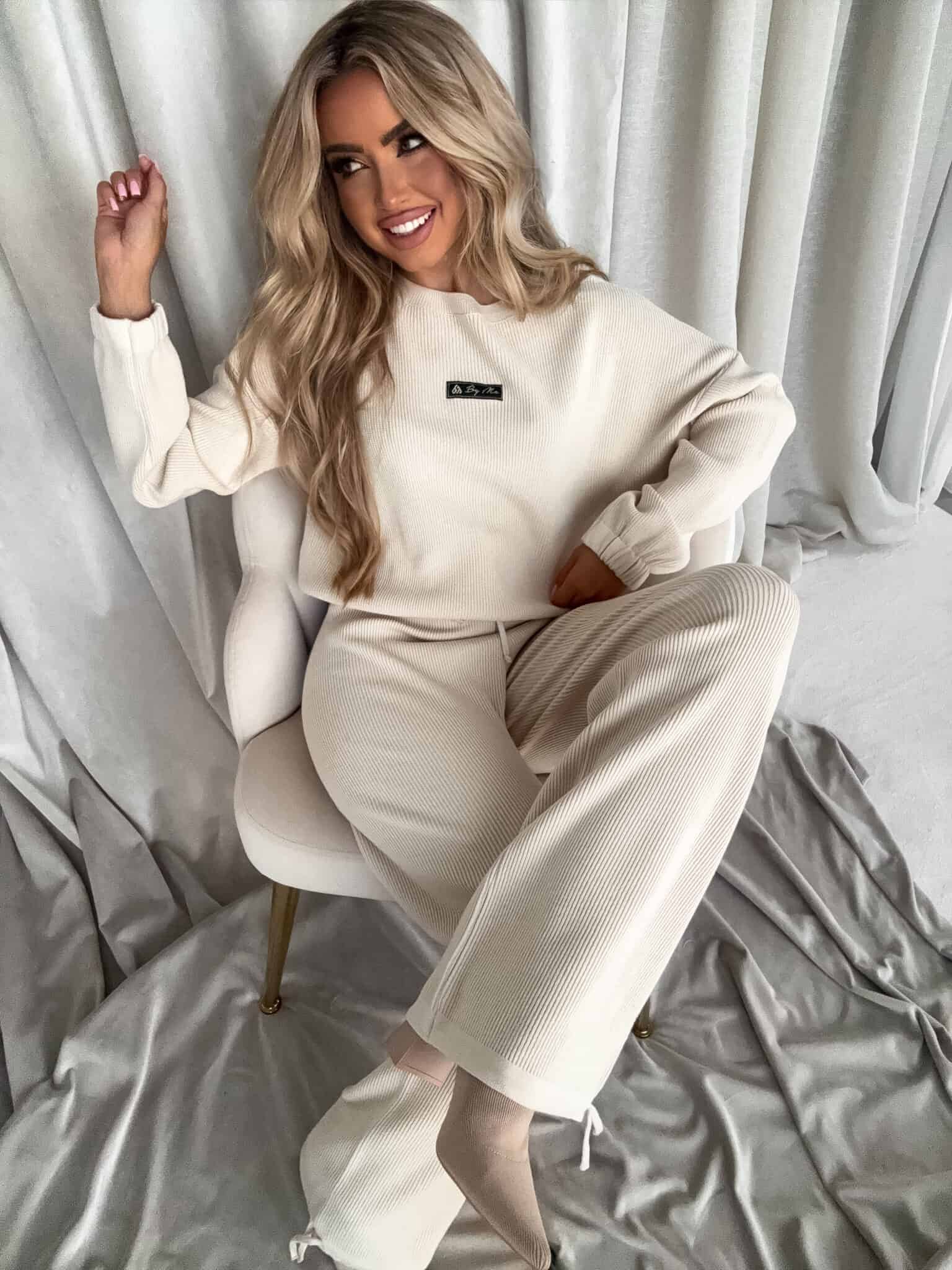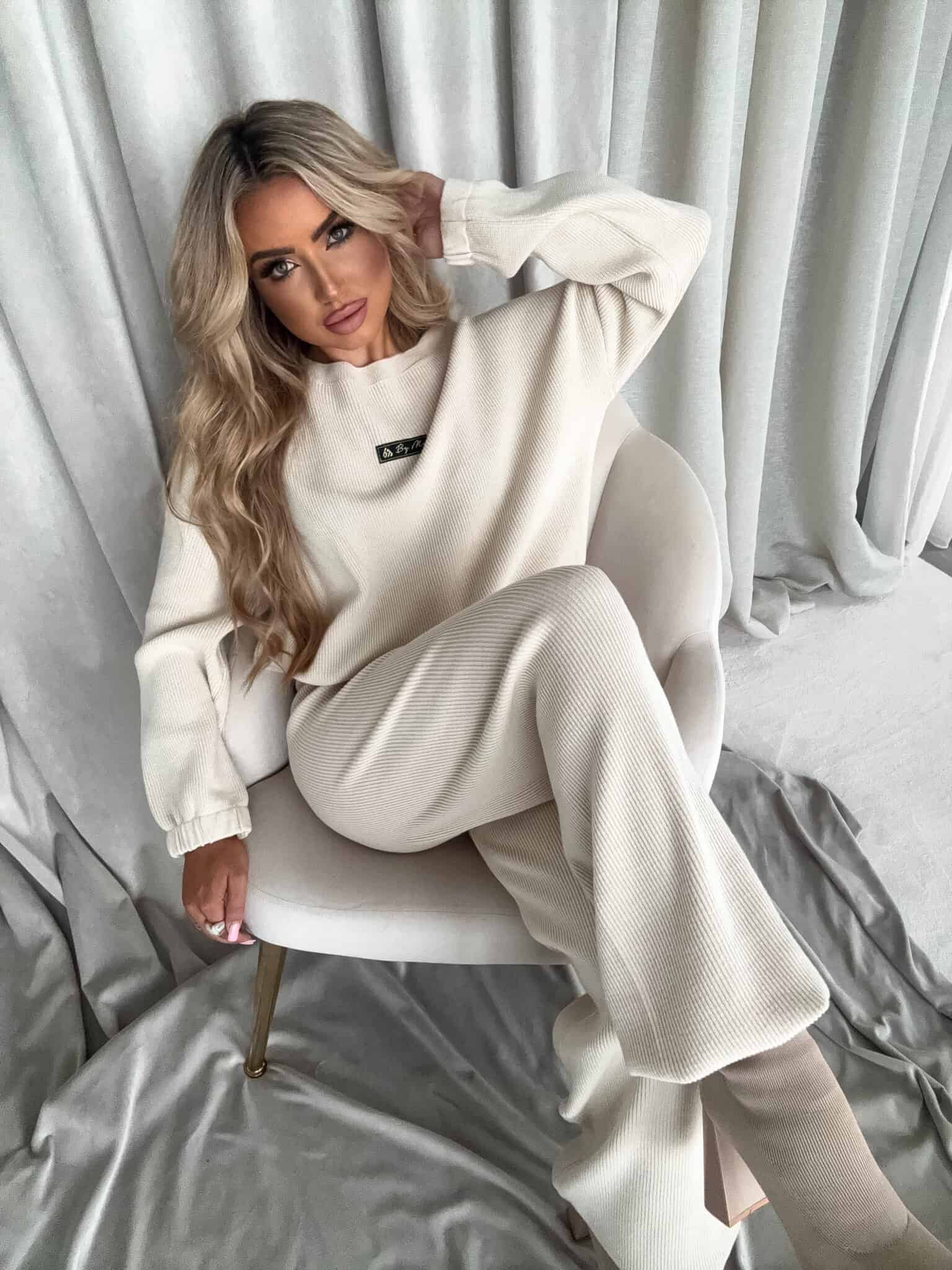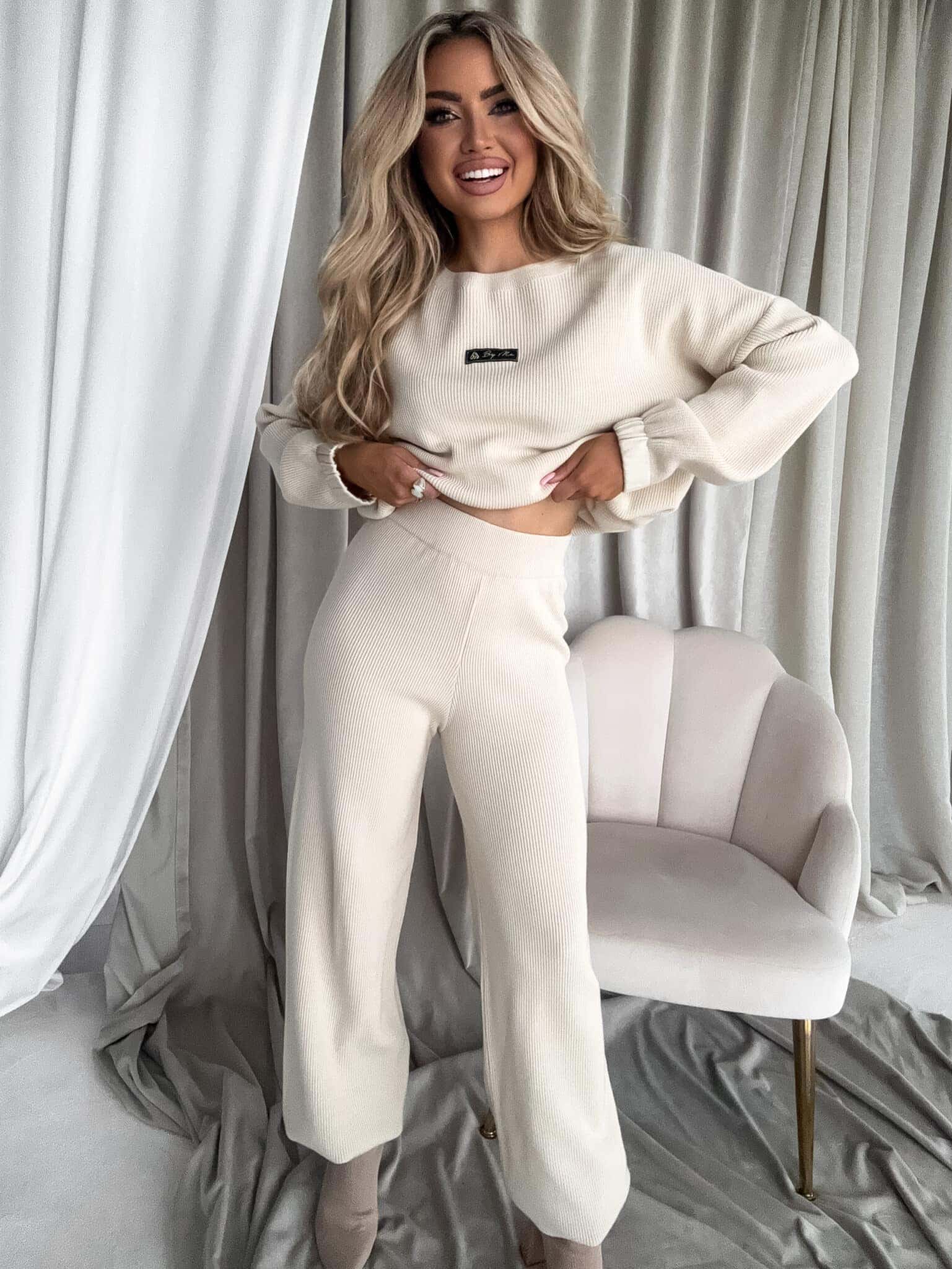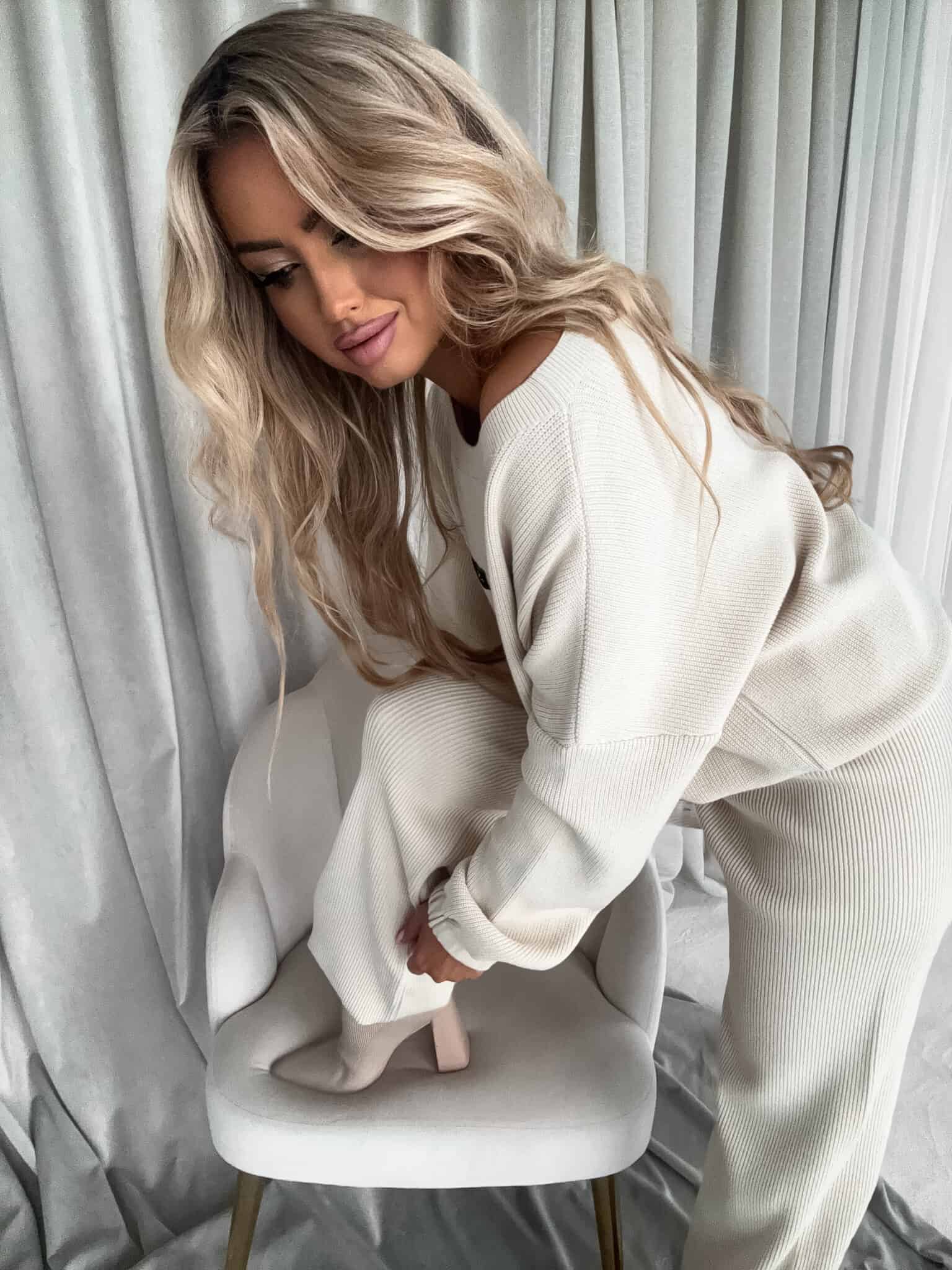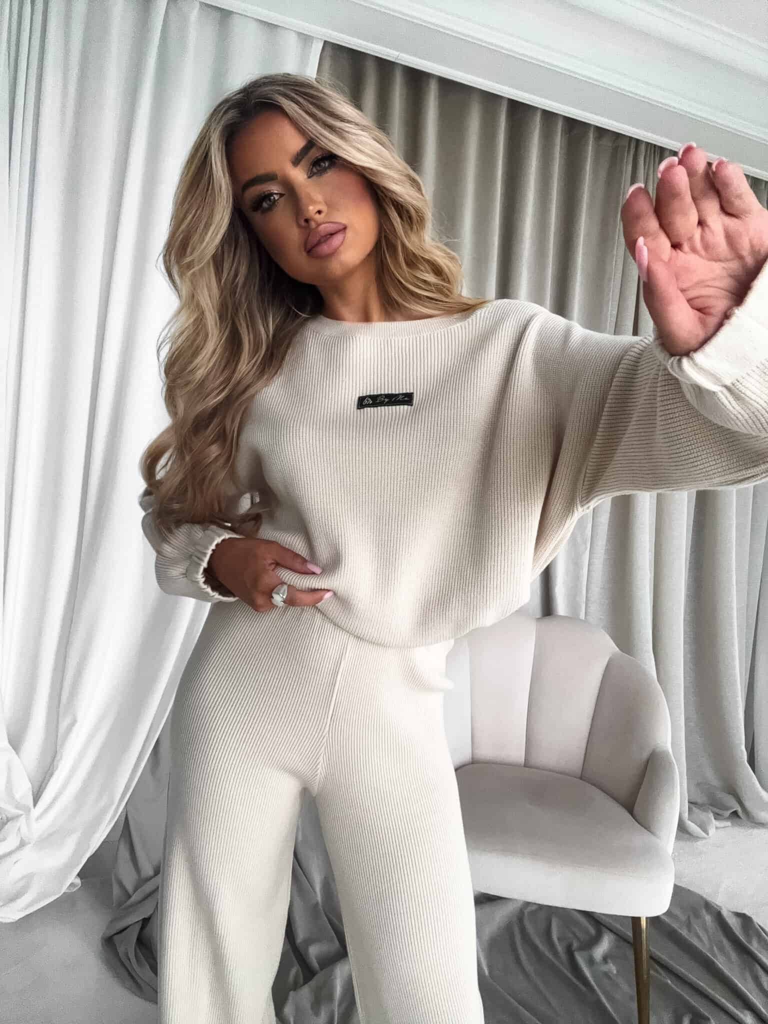Stylowy komplet wykonany z miękkiej, przyjemnej w dotyku dzianiny, idealny na chłodniejsze dni. Składa się z oversize’owego swetra z długimi rękawami oraz spodni z wysokim stanem, uszytych z tej samej tkaniny. Sweter zakładany przez głowę, wyposażony w troczki umożliwiające regulację długości – możesz nosić go na różne sposoby, dopasowując do swojego stylu. Spodnie z szerokimi nogawkami i wygodną gumką w pasie zapewniają komfort noszenia. Nogawki również wykończone troczkami, co pozwala na subtelne modelowanie ich kształtu. Komplet idealny zarówno do relaksu w domu, jak i na niezobowiązujące wyjścia.