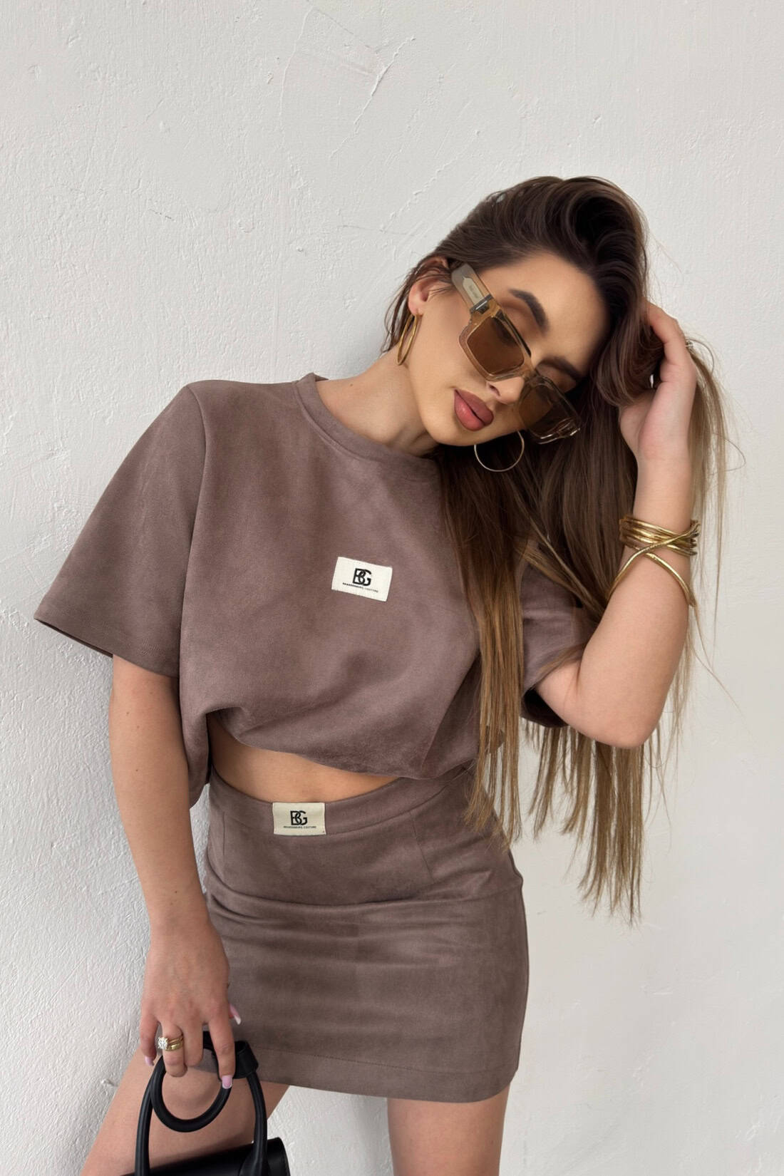 Opis produktu: Komplet damski BG MINI z przyjemnego eko-zamszu. Komplet składa się z T-shirta o szerszym kroju oraz spódniczki zapinanej na suwak. Logowanie marką na środku Tshirta oraz na pasie spódniczki.