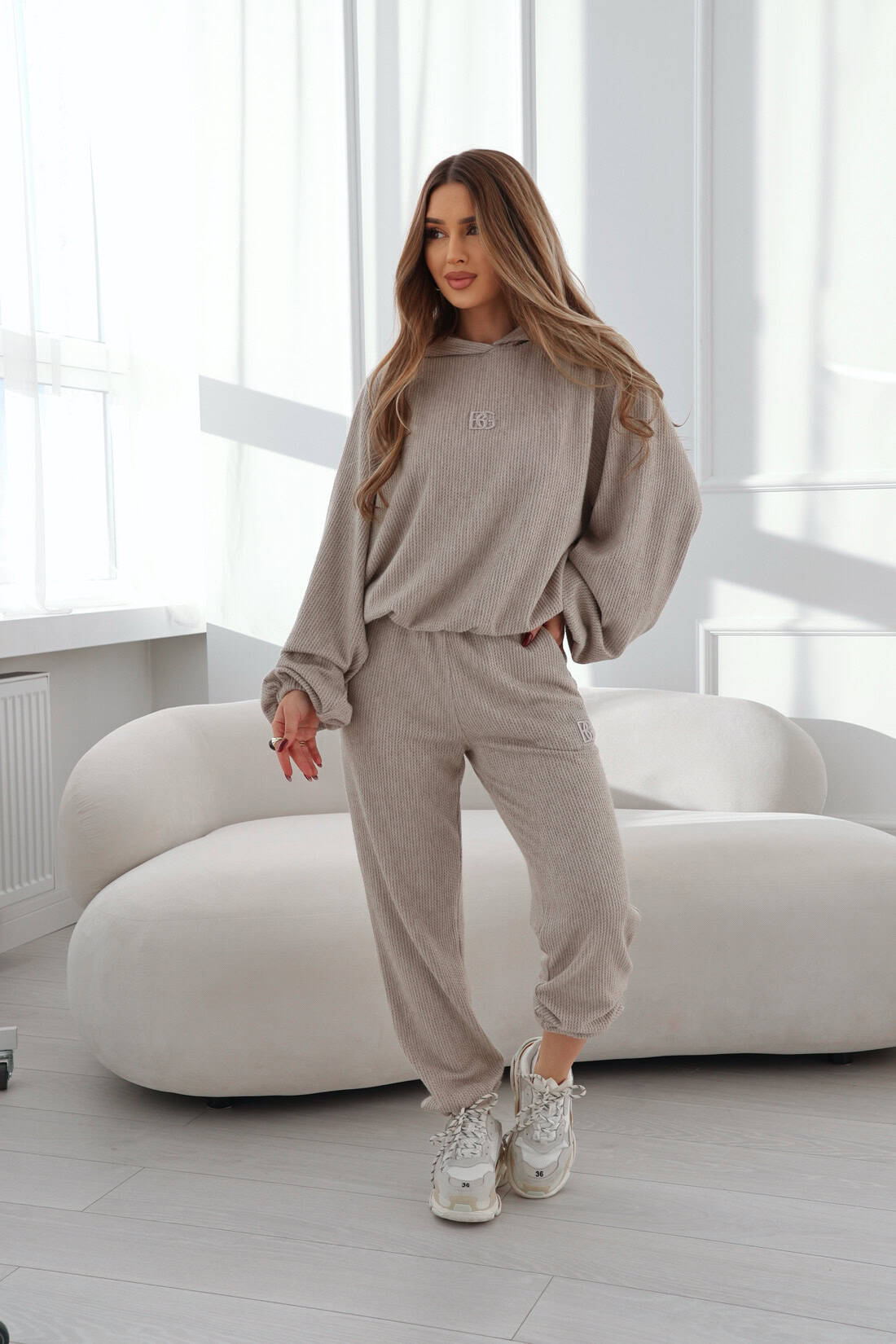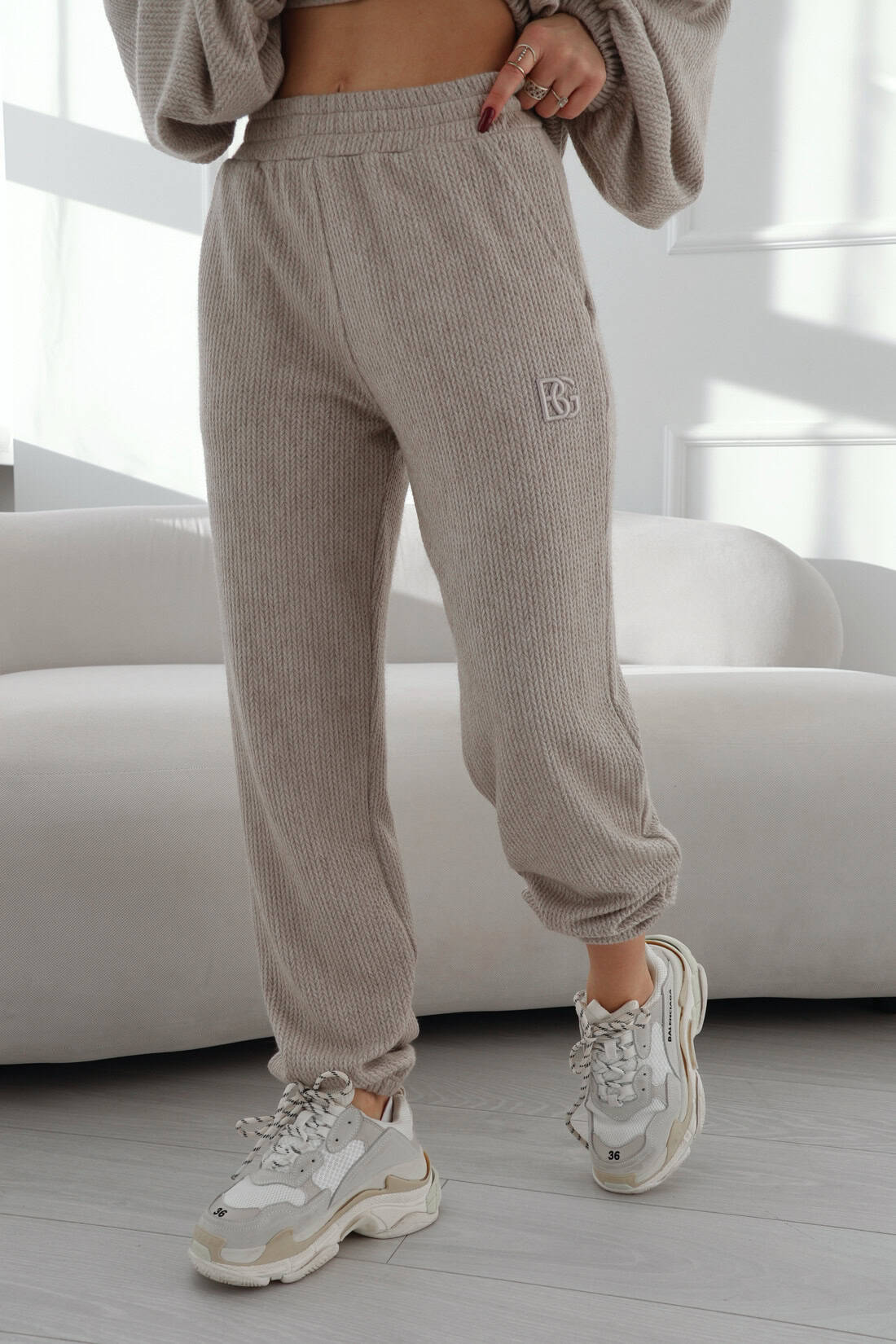 Opis produktu: Komplet sweterkowy BG OPIUM. Bluza oraz spodnie logowane haftem BG w kolorze materiału. Krój oversize.