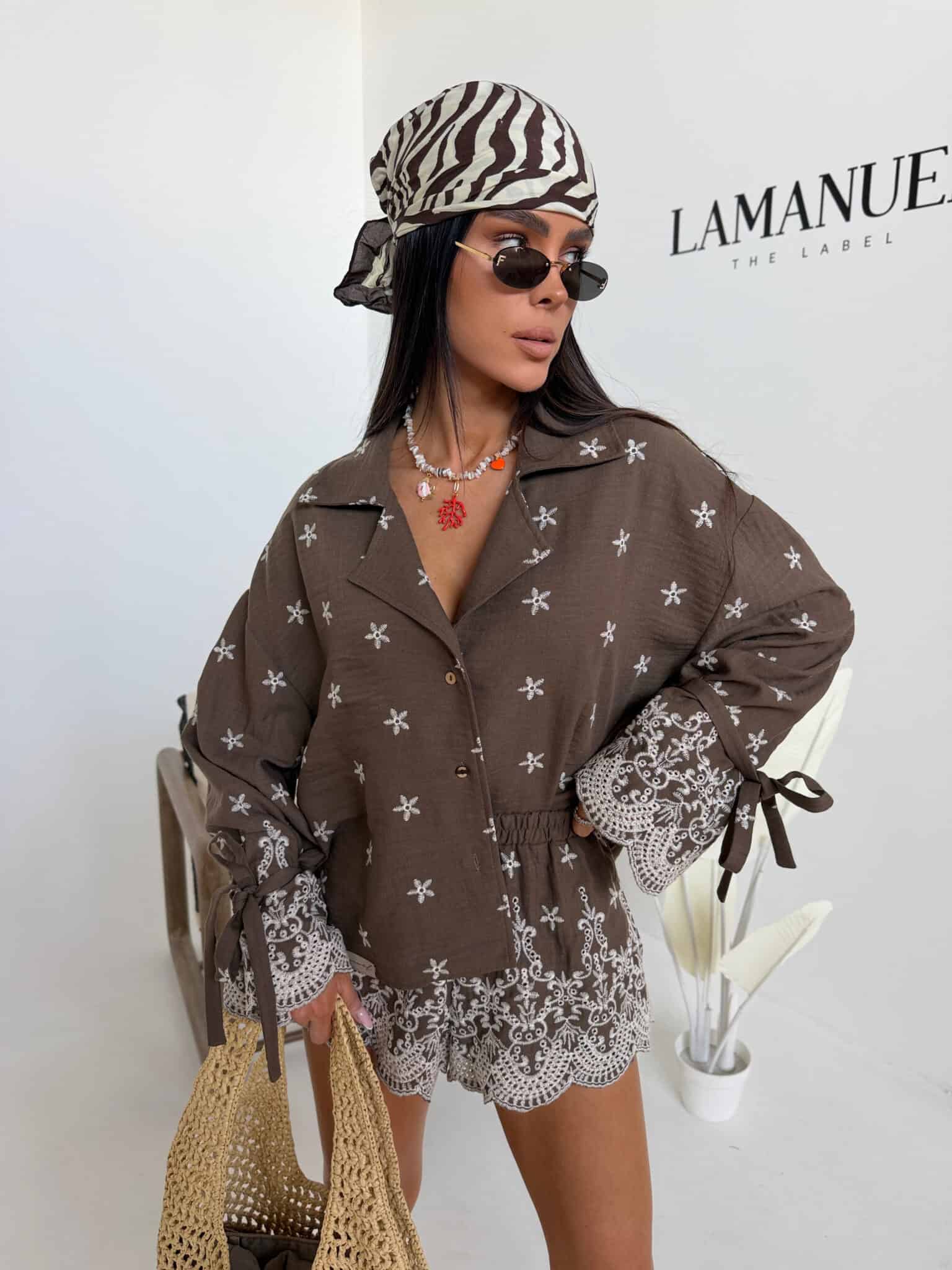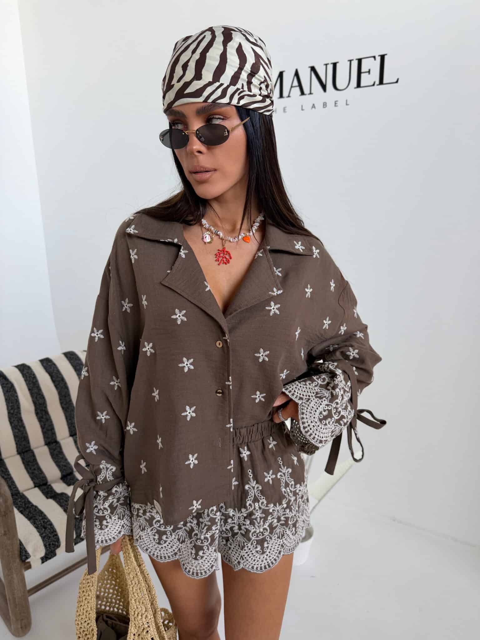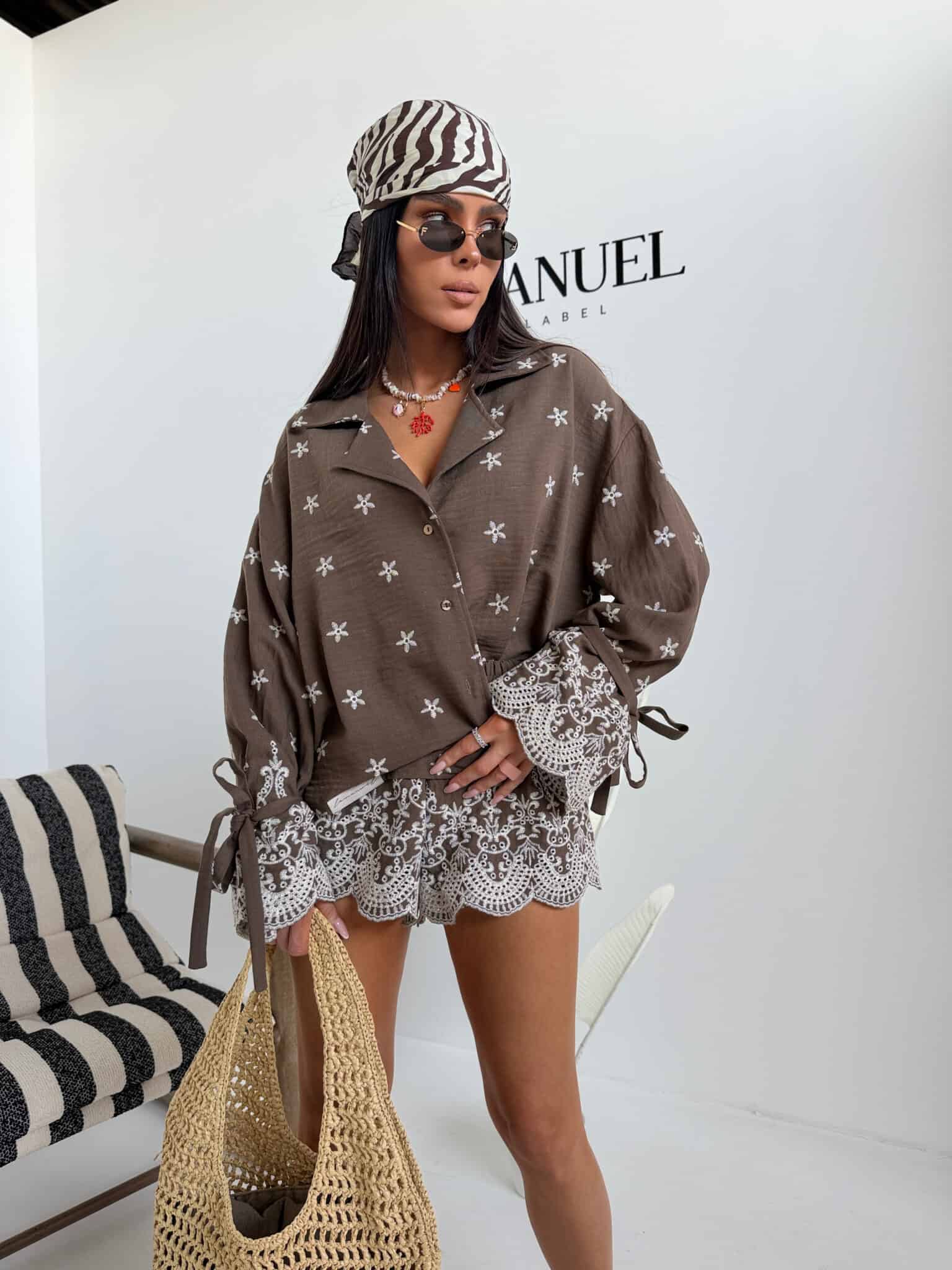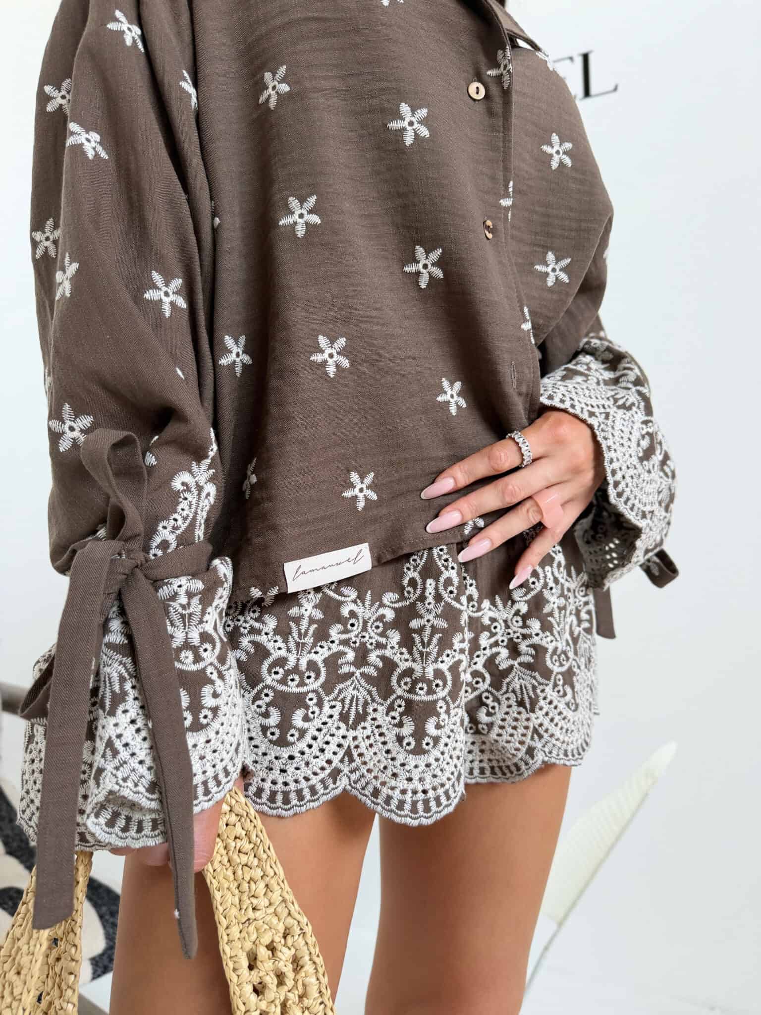 Lekkość, która przyciąga detalem. Zwiewna koszula o luźnym kroju subtelnie układa się na sylwetce, tworząc naturalny, niewymuszony efekt, a haftowane wykończenia dodają całości romantycznego charakteru. Szerokie rękawy zakończone ozdobną koronką podkreślają wyjątkowość formy i nadają stylizacji wyrazistości. Szorty z ażurowym wykończeniem eksponują nogi i wprowadzają letni, świeży vibe, jednocześnie zachowując komfort dzięki elastycznej talii. Całość tworzy spójny, kobiecy look idealny na ciepłe dni – lekki, ale dopracowany w każdym detalu.Skład: 51% poliester 37% wiskoza 12% len